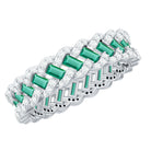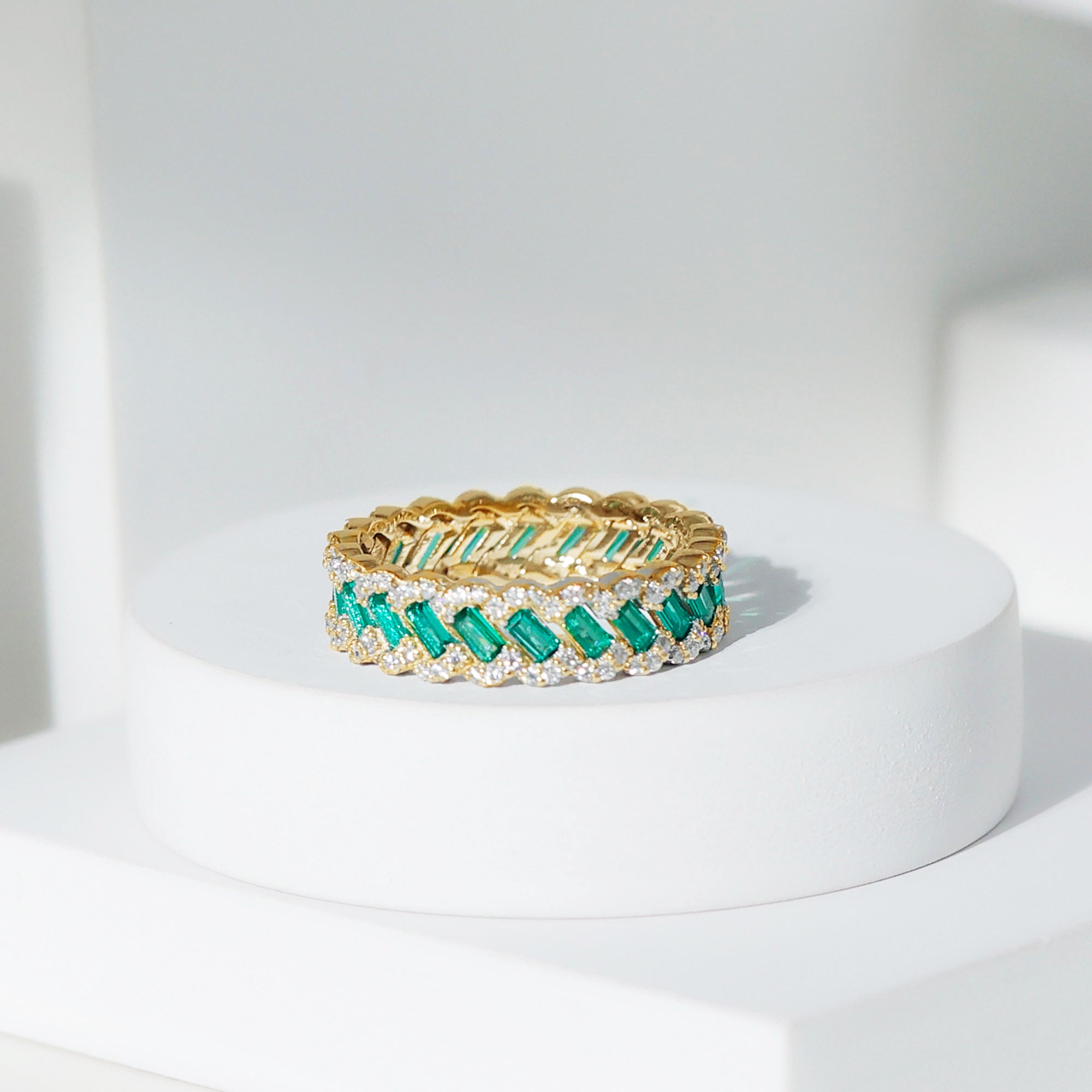 Delight in the enchanting allure of our Anniversary Ring, an irresistible accessory that will captivate your partners heart. This Wedding Anniversary Band showcases Baguette Created Emerald gemstones at its center, and the braided shank is adorned with the brilliance of Round Shape Moissanite, enhancing its beauty. This Eternity Wedding Ring beholds the unmatchable shine of AAAA Quality Lab Grown Emerald and D-VS1 Quality Moissanite which perfectly light up the celebration. The ring will invoke a romantic and timeless charm which makes it an ideal choice to express your love to her. This Emerald Wedding Ring will be a classic choice to start a new chapter of life. The Certified Wedding Ring will be shipped to you in a premium pack ensuring that your feelings attached to this ring are safe and secured.