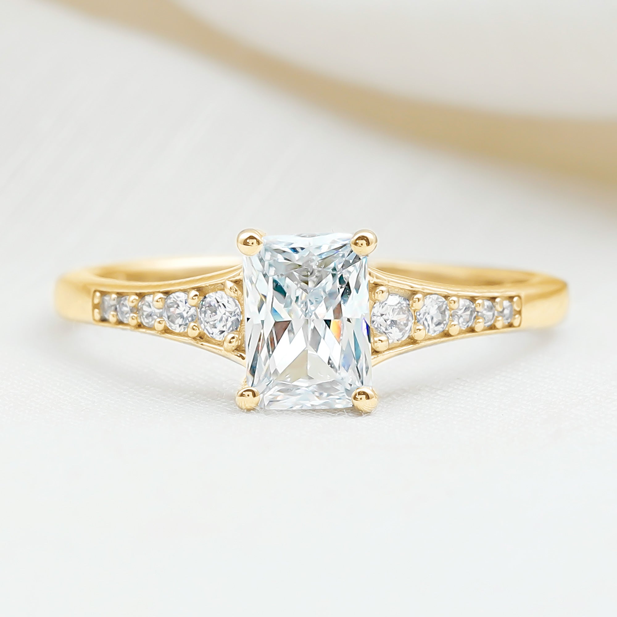 An elegant choice for a lifelong promise, the Lab Grown Diamond Engagement Ring brings together classic beauty and modern charm. At its center sits a stunning 7X5 MM emerald cut lab created diamond, set securely in prong setting. The band is embellished with round cut diamond side stones in different sizes, arranged in a graduated pattern. The side stones gradually increase in size as they lead toward the center, drawing the eye in and adding just the right amount of extra brilliance without overwhelming the main stone. Thoughtfully designed to suit a wide range of styles, this Emerald Cut Engagement Ring is available in multiple metal options. You can also choose your preferred metal purity and get the Solitaire Engagement Ring in any US size from 3 to 13, ensuring a perfect fit for every hand. Ideal for a proposal or as a meaningful gift to mark a milestone in your relationship, this Diamond Solitaire Ring is both stylish and full of meaning. It also comes with a certificate of authenticity, giving you confidence in the quality and craftsmanship of your piece. Timeless, versatile, and radiant, this Lab Grown Diamond Ring is a beautiful way to tell your love story, simple in design, yet rich in emotion and sparkle.