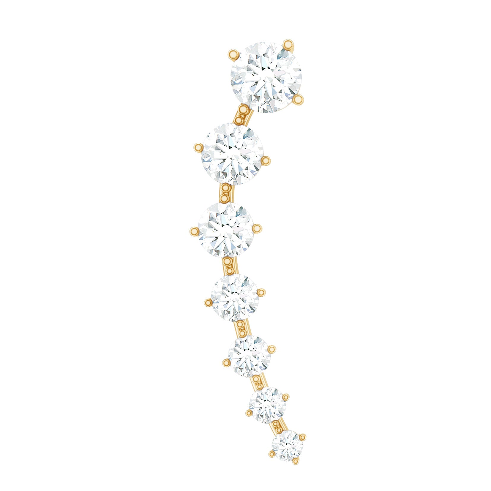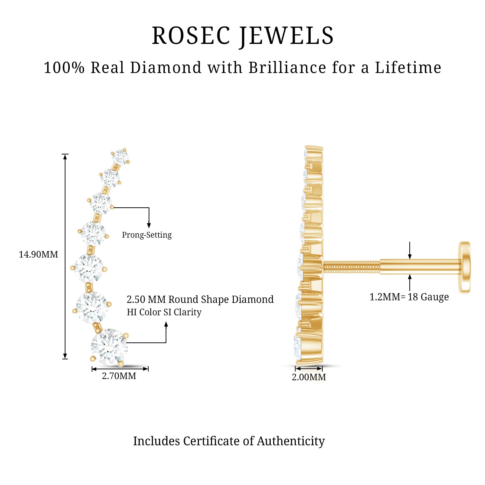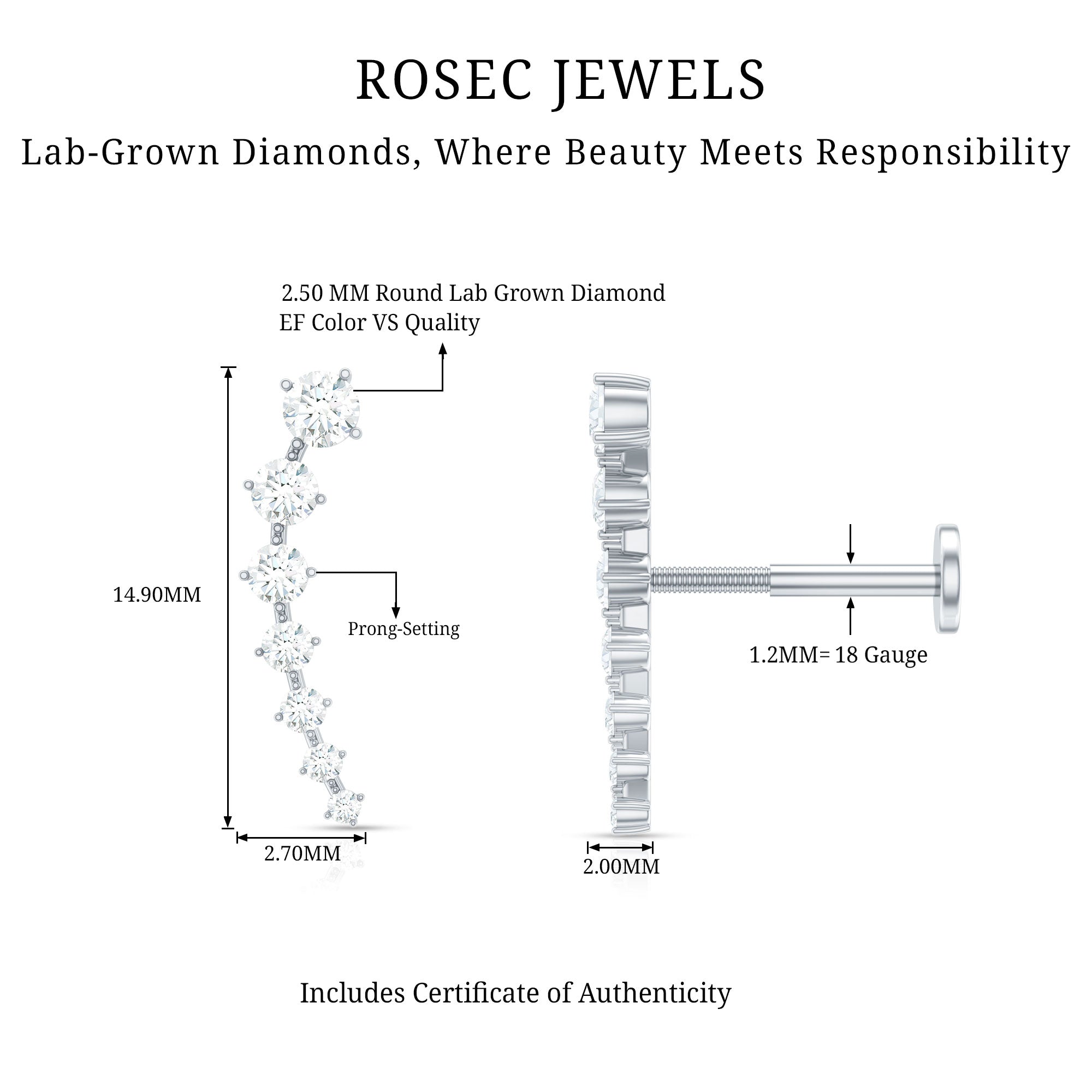 The Diamond Ear Crawler is the simplest way to elevate your style! This earring showcases descending round diamonds set in prongs. Crafted from responsibly sourced metal by our skilled artisans, its perfect for everyday wear. You can rock this ear crawler on your helix, hidden helix, upper lobe, or cartilage piercing, thanks to the flat back closure that keeps it securely in place. Its designed to be worn up and around the ear, making it super easy to wear and ideal for transitioning from day to night. For a chic look, pair this Diamond Ear Climber with gemstone studs or drops for a more personalized and bold statement. Whether youre treating yourself or gifting someone special, this long Earring is a fantastic addition to any jewelry collection. It’s a step up from standard ear piercing jewelry, timeless and versatile for any occasion. Transform your ears appearance with our Diamond Climber Earring and catch everyones eye while receiving compliments wherever you go. The Minimalist Earring will come in premium packaging along with a certificate of authenticity.