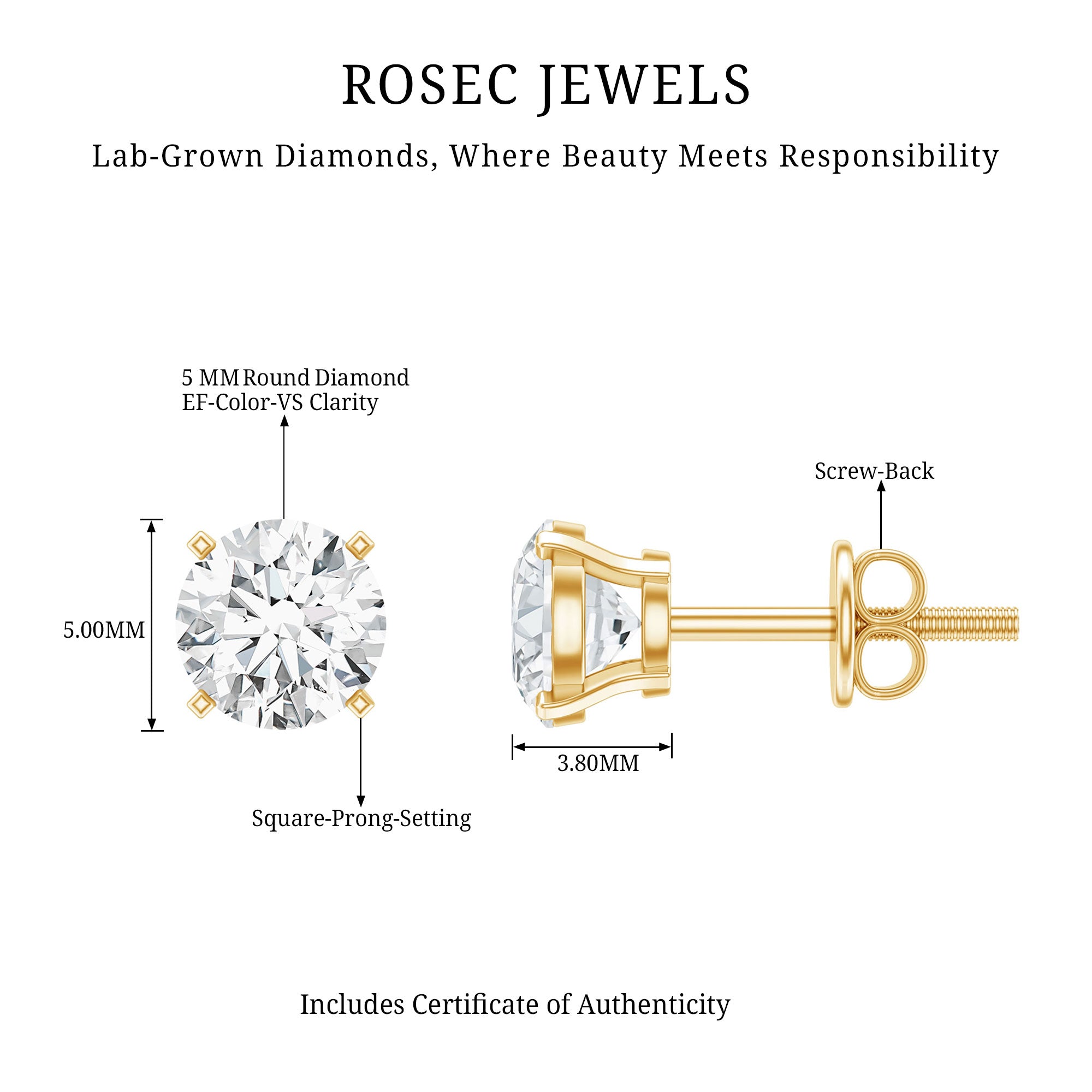 These Lab Grown Diamond Earrings may be small, but they definitely pack a dazzling sparkle! They feature a 5 MM round lab grown diamond set in square prong setting. With a screw back closure, these Solitaire Stud Earrings provide a comfy and secure fit all day long. They are a fantastic addition to any outfit in your wardrobe, making these Diamond Solitaire Earrings a perfect pick for both daytime and evening occasions. Delight your loved ones with these Diamond Stud Earrings, they make a lovely birthday or anniversary present. Plus, they come with a certificate of authenticity, so you can shop with confidence and get great value for your money. Our 1 Carat Diamond Earrings arrive in a luxurious jewelry box, perfect for keeping them safe when you are not wearing them. You can customize these Diamond Ear Studs in different metal color options to reflect your personal style, creating a truly unique and thoughtful piece.