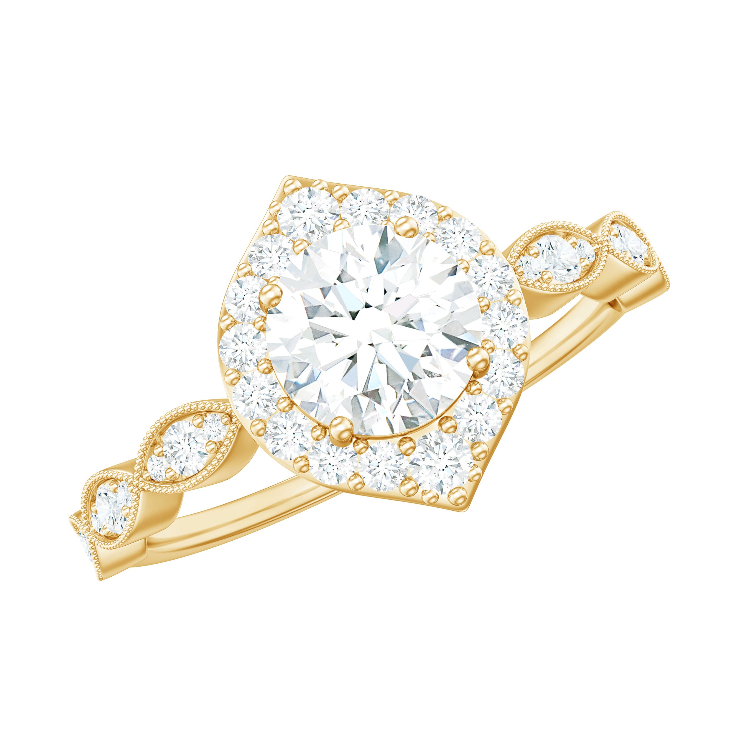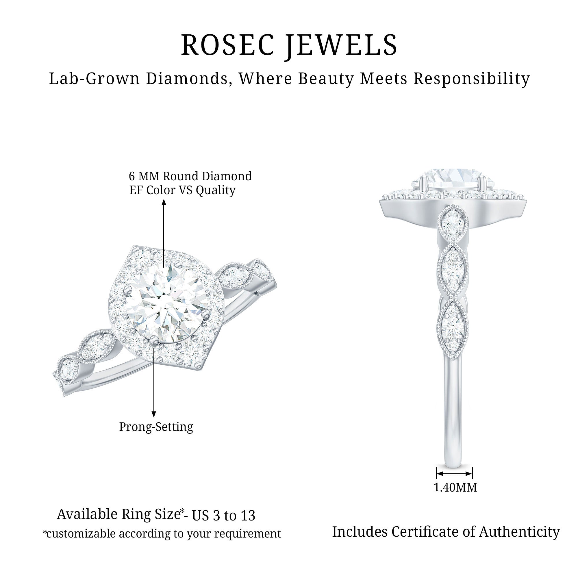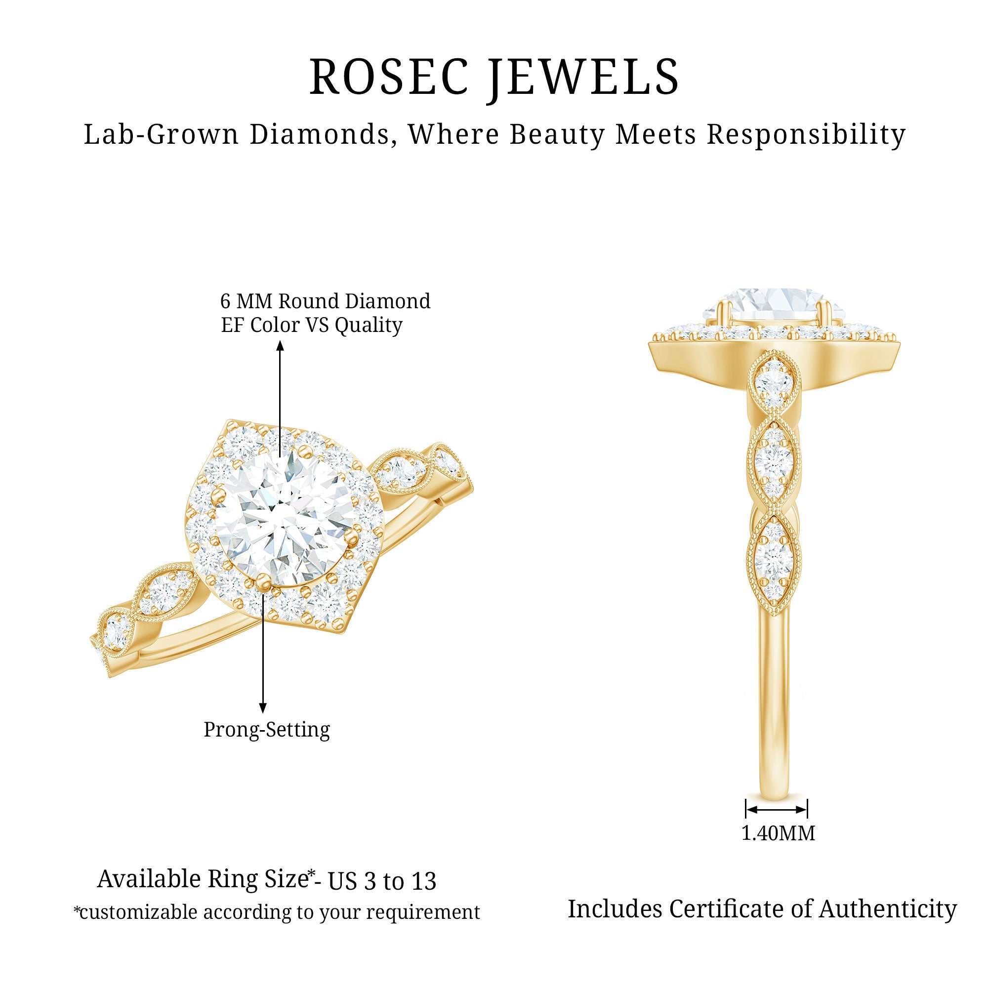 Shine and dazzle with this classy Lab Grown Diamond Engagement Ring, a stunning and lovely symbol for the next chapter in your journey together. This Vintage Engagement Ring features a 6 MM round cut lab created diamond set in prongs, surrounded by a halo of gemstones. The distinctive, eye-catching scalloped design on the band is also adorned with round diamonds and beaded detailing, boosting the overall sparkle of the ring and adding an art deco flair to it. This romantic and remarkable Halo Engagement Ring boasts a timeless charm that will leave her breathless. Merging elegance with everlasting beauty, this vintage beauty glimmers with every look. With a subtle significance, this Round Diamond Engagement Ring radiates ultimate glamour that showcases beauty and grace. Exuding elegance, it helps you stand out in any crowd, carrying a sweet and sentimental vibe that would shine on any occasion. Taking the spotlight, this 1 Carat Diamond Ring celebrates the beauty of old-world charm. The EF Color VS Clarity Lab Grown Diamond shines with stunning brilliance and fire.