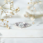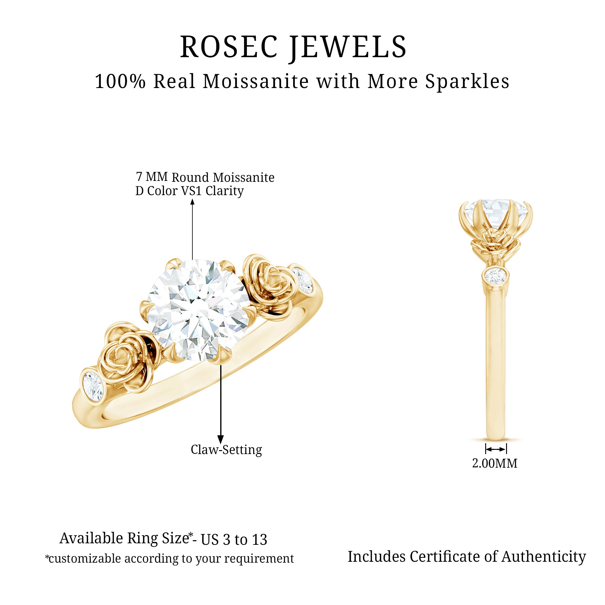 Romantic and graceful, this Flower Engagement Ring brings a soft, feminine charm to a timeless design. At its center sparkles a 7 MM Round Shaped Moissanite, securely set in a delicate 6-claw prong setting that allows the stone to shine with incredible brilliance. Framing the center stone on each side is a beautifully sculpted rose flower motif, and small, shimmering stone that adds a subtle but eye-catching sparkle. Inspired by nature’s beauty, the floral elements add a whimsical touch while maintaining a refined elegance, making this Moissanite Engagement Ring ideal for someone who appreciates gentle details and unique craftsmanship. The combination of the radiant Moissanite center with the floral accents creates a balanced and enchanting look that feels fresh yet timeless. Crafted with care and thoughtfulness, this Moissanite Solitaire Ring offers the brilliance of a diamond while being eco-friendly and affordable. The band is designed for all-day comfort, so it is perfect for everyday wear while still standing out during your most memorable moments. Whether it is a symbol of a blooming love or a sweet reminder of a cherished promise, this Rose Engagement Ring is designed to capture emotion in every petal and sparkle.