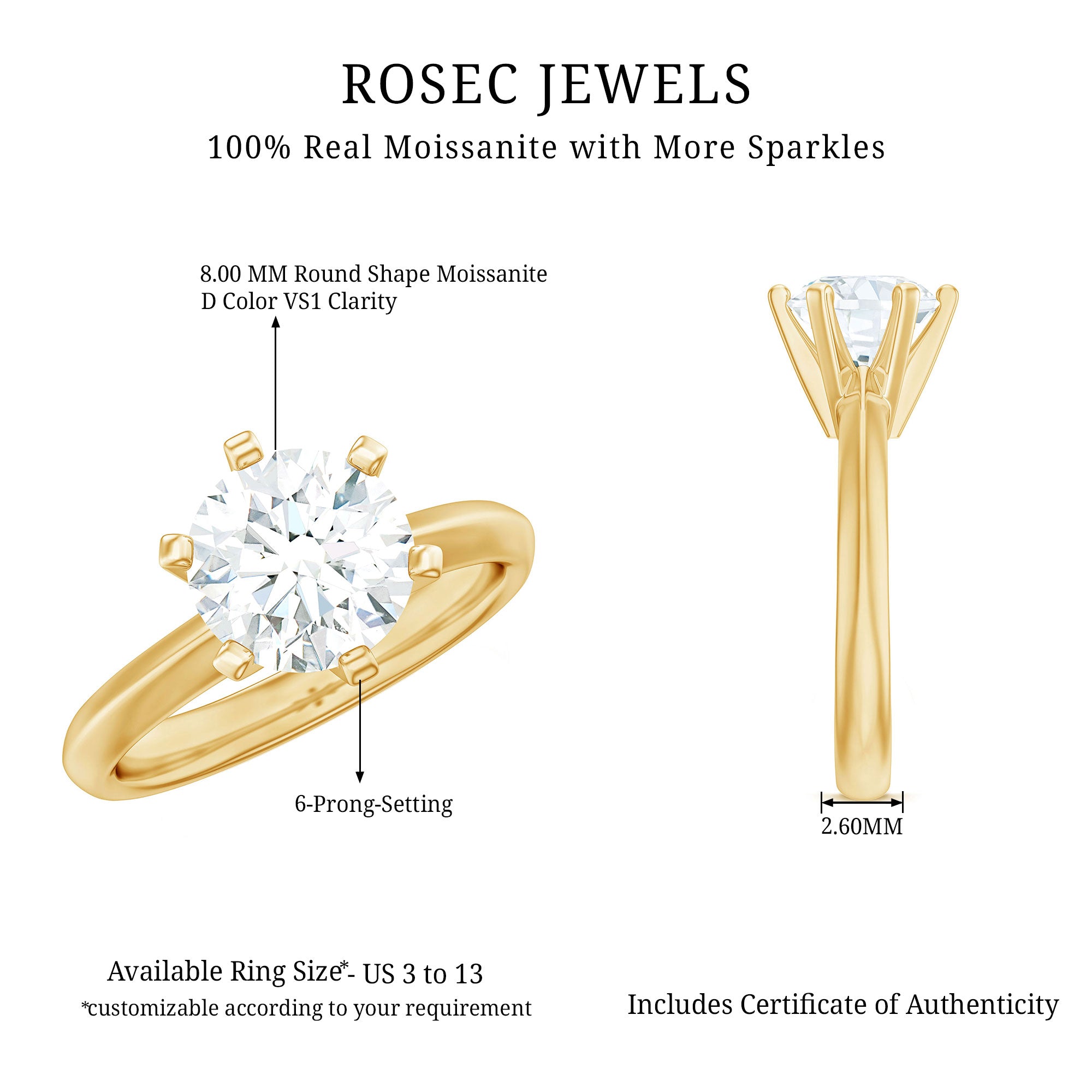 Effortlessly chic and timelessly sophisticated, this Solitaire Moissanite Engagement Ring highlights the allure of simplicity with a contemporary flair. At its center, a stunning 8 MM round cut moissanite draws the eye, sparkling brilliantly from every angle and securely set in 6-prong setting. The high profile style beautifully lifts the round cut stone, allowing light to pour in and enhance its natural fire and brilliance. With a smooth, sleek band, this piece perfectly balances modern elegance with lasting charm. Carefully handcrafted with attention to detail, this 2 Carat Moissanite Ring is made for those who value both beauty and significance in their jewelry. Offered in various ring sizes for a perfect fit, it comes in a thoughtfully crafted jewelry box, ready to be gifted or cherished for years ahead. Striking without being overwhelming, elegant without being ordinary, this Round Cut Engagement Ring is the perfect emblem of a love that is both strong and graceful. Let this gorgeous piece embody your forever, shining with brilliance and heartfelt elegance every single day.