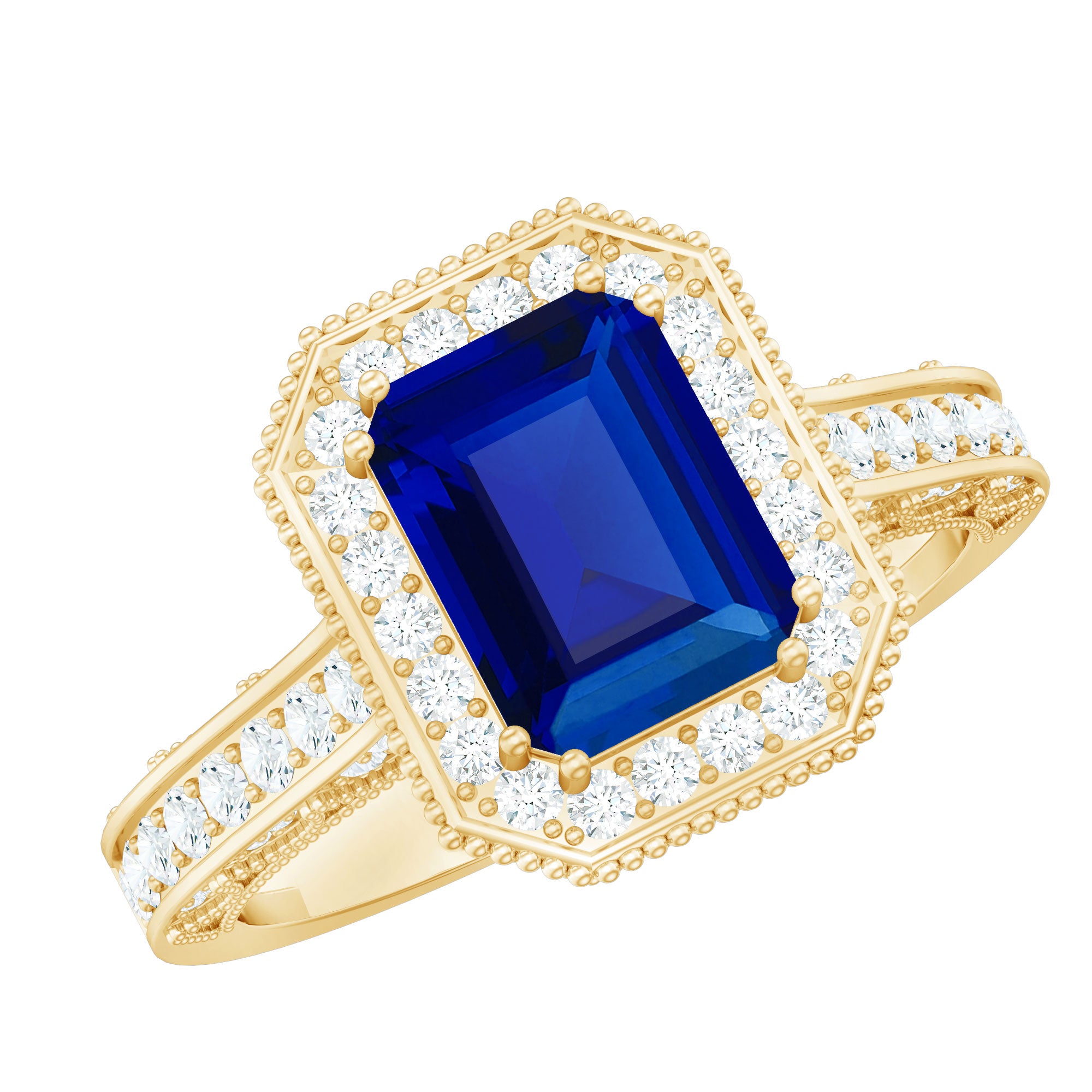 Make a stunning statement with a ring that captures romance, elegance and timeless beauty in every detail. This Vintage Inspired Engagement Ring features a captivating 6X8 mm Emerald Cut Lab Created Blue Sapphire at the center in Double Prong Setting, known for its deep, royal color and graceful shape. Surrounding the center stone is a sparkling Diamond Halo that adds brilliance and enhances the rich glow Lab Blue Sapphire, while Diamond Side Stones bring extra shimmer from every angle. The band is adorned with intricate Beaded detailing, giving the ring a charming vintage character that beautifully blends classic design with modern craftsmanship. Thoughtfully created to symbolize lasting commitment, this Emerald Cut Engagement Ring with Sapphire (Lab Grown) represents a love story that grows stronger with time. Its refined style pairs perfectly with both traditional elegance and contemporary fashion, making it a memorable choice for proposals, anniversaries or meaningful milestones. Presented in a signature jewelry box, this Lab Grown Blue Sapphire Engagement Ring is ready to surprise someone special and make the moment unforgettable. With multiple ring sizes available, you can select the perfect fit for the one who holds your heart. Sophisticated and romantic, this Lab Blue Sapphire Diamond Ring is a shining symbol of devotion meant to be treasured forever.