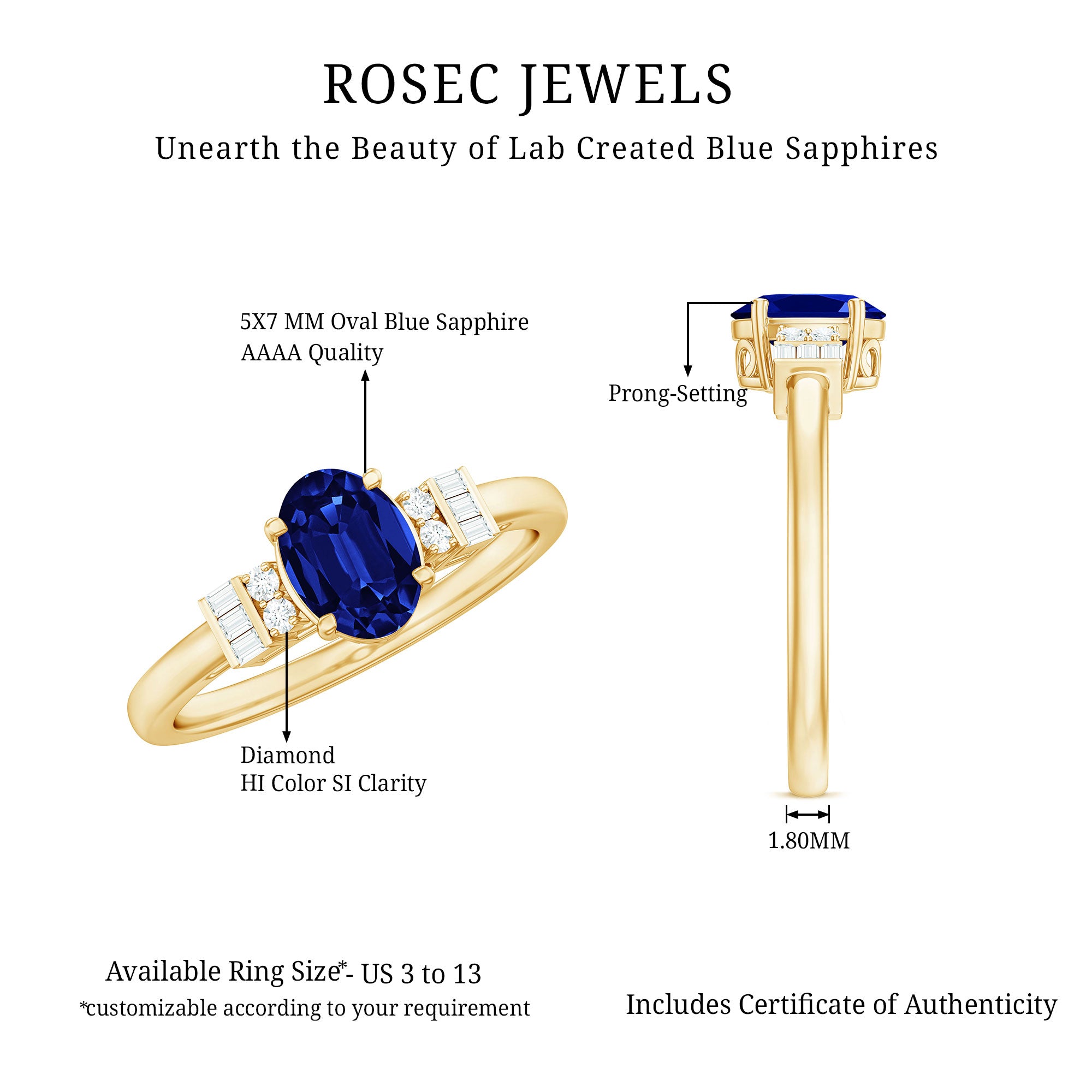 Make your special day unforgettable with this Oval Engagement Ring, a perfect blend of elegance and romance. At its center rests a 5X7 mm Oval Shape Lab Grown Blue Sapphire, glowing with a rich, deep hue that draws the eye and captures the imagination. On either side, sparkling Round and Baguette Shape Diamond stones of HI-SI Quality add a touch of brilliance, framing the AAAA Quality Lab Grown Blue Sapphire with timeless sophistication and enhancing its captivating color. The design balances classic charm with modern refinement, making it a ring that complements every style and story. Handcrafted with care and attention to detail, each curve and facet reflects dedication to beauty and love. Available in multiple ring sizes, this Lab Grown Blue Sapphire Engagement Ring can be chosen to match your partner perfectly, while the signature jewelry box adds a finishing touch of elegance, making the moment of giving as memorable as the promise it represents. This Lab Blue Sapphire Diamond Ring is a declaration of devotion, a symbol of commitment and a treasure that will shine through every chapter of your shared journey.