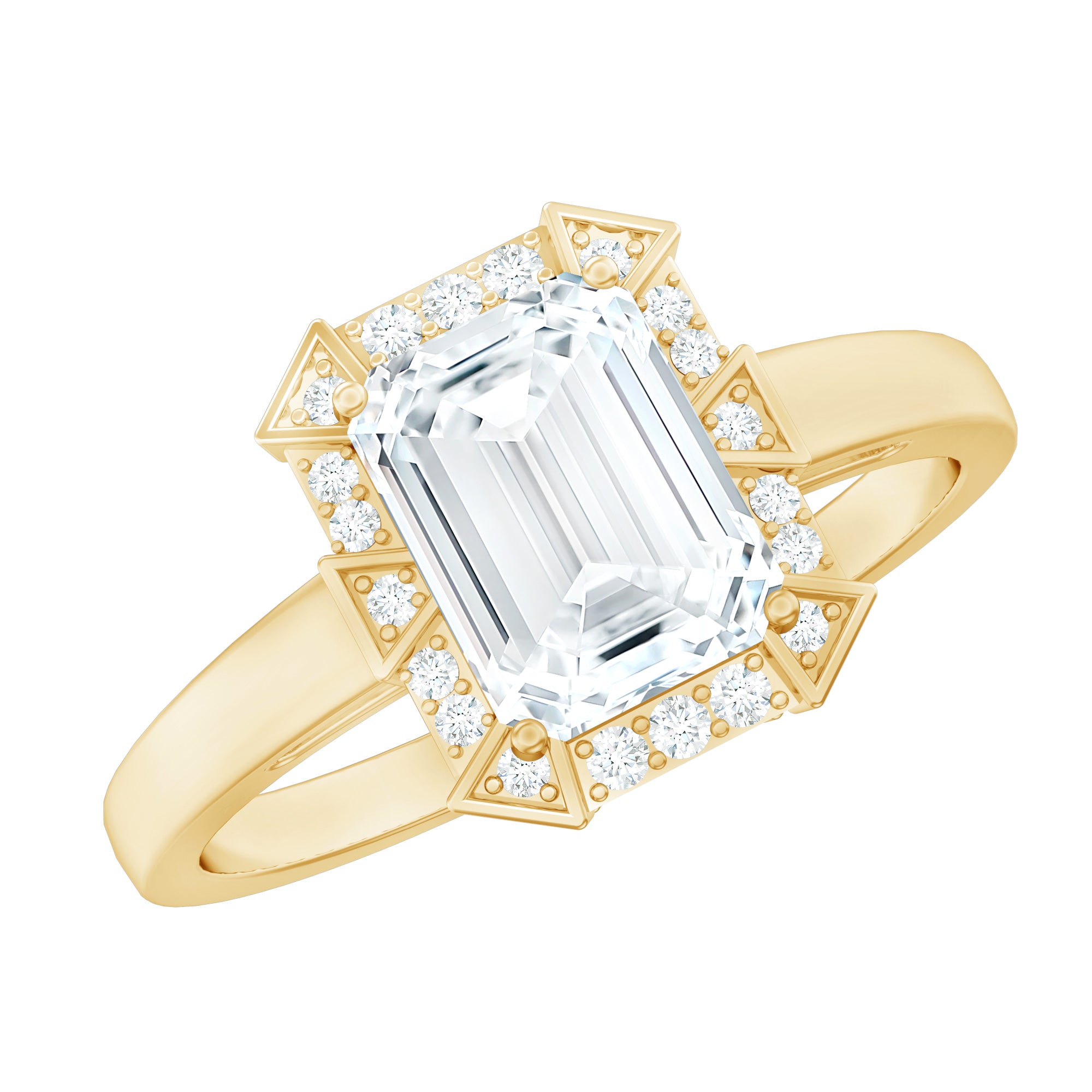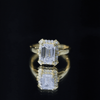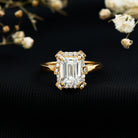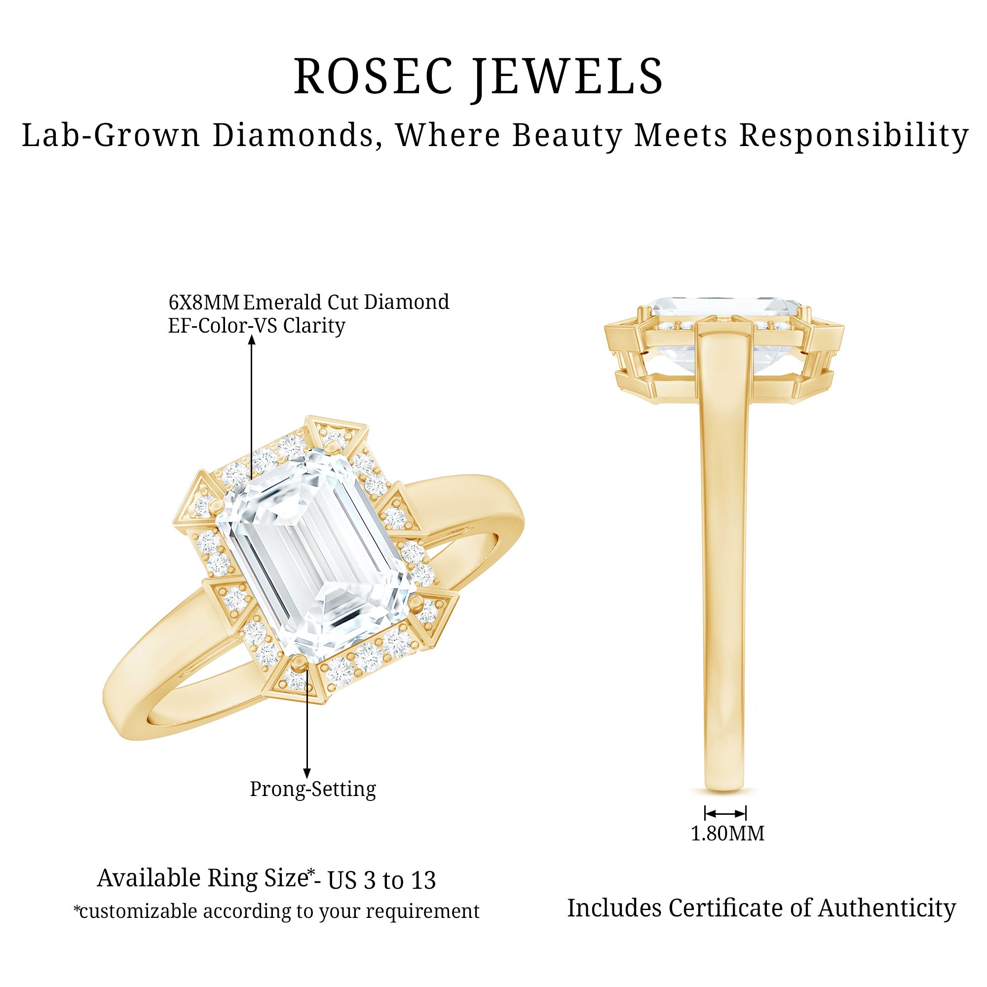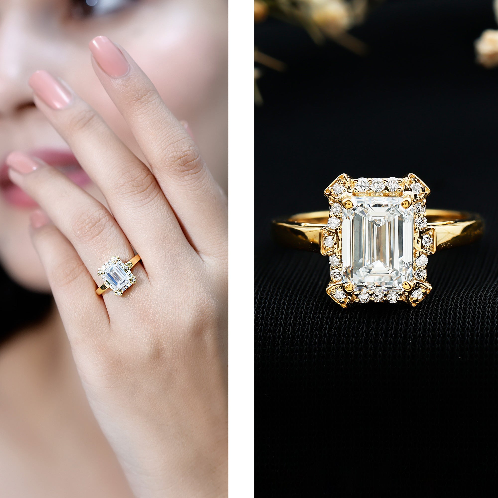 Step back into the glamour of the past with this stunning Vintage Style Engagement Ring, designed to make you the center of attention. It features a 6X8 MM emerald cut EF-VS quality diamond (lab grown) set in a safe prong setting. Surrounding the centerpiece is a vintage style halo of smaller diamonds, adding a touch of old-world charm. These tiny and shimmering round shaped diamonds are placed around the focal stone with some metal detailing, providing a texture-like effect. If you are looking for an Emerald Cut Engagement Ring that embodies romance, strength, and everlasting love, this is the perfect choice. It is not just a ring; it is a statement representing love that is rare, beautiful, and timeless. The moment she sees it, shell know this is the Diamond Ring made just for her.