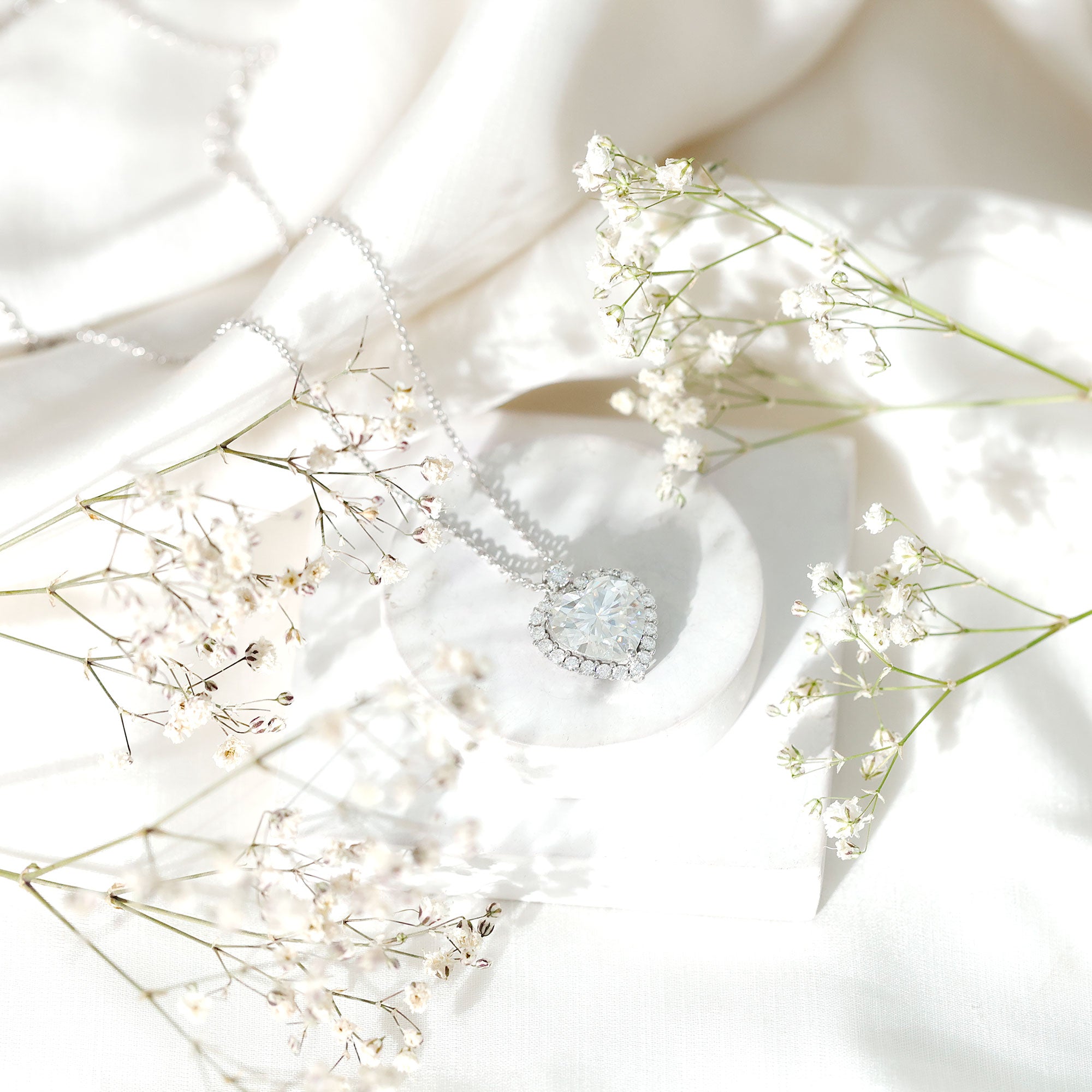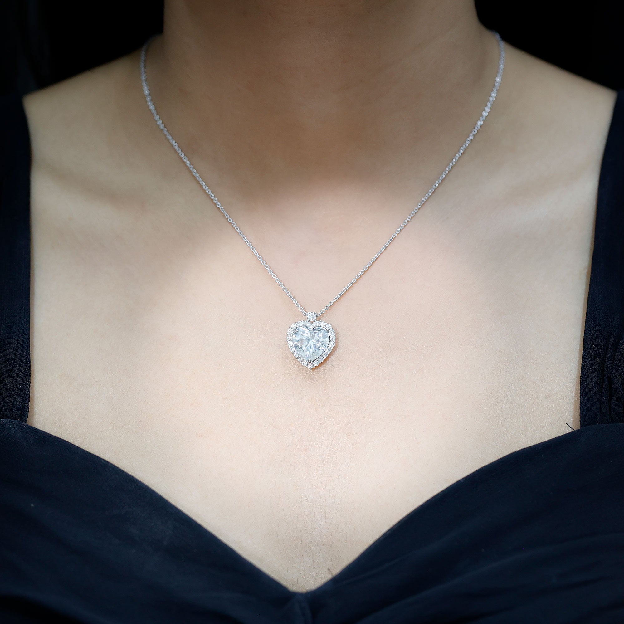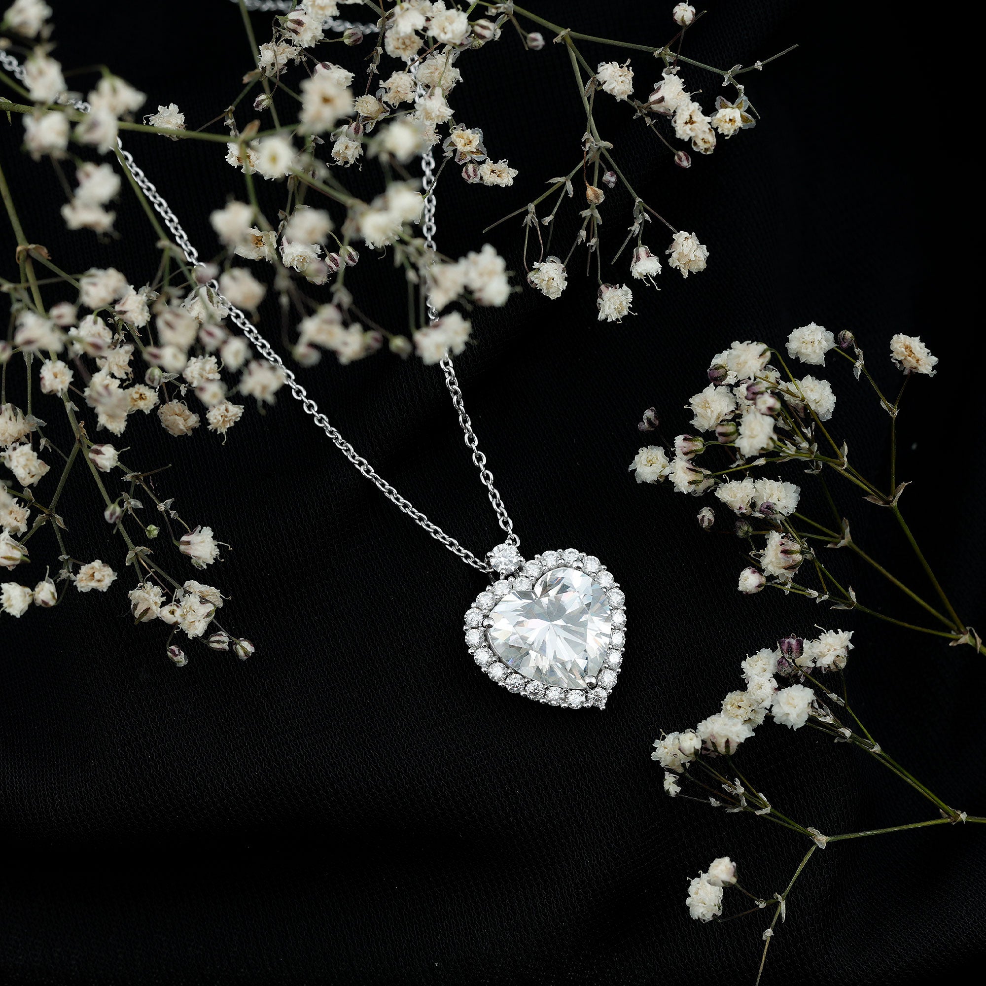 She has already won your heart, now its time for you to conquer her heart with this Moissanite Pendant Necklace crafted especially for your loved one. This pendant features a 12 MM Heart Shape Moissanite of D-VS1 Quality encircled with smaller stones, which amplifies the look of the pendant by exuding an extra layer of shimmer. This Heart Love Pendant will be the key to unlock romance in your relationship, which dangles in a silver cable chain, which makes it beautifully sit on the neckline. This Heart Necklace can be presented to your wife on the occasion of Valentines Day or your anniversary.