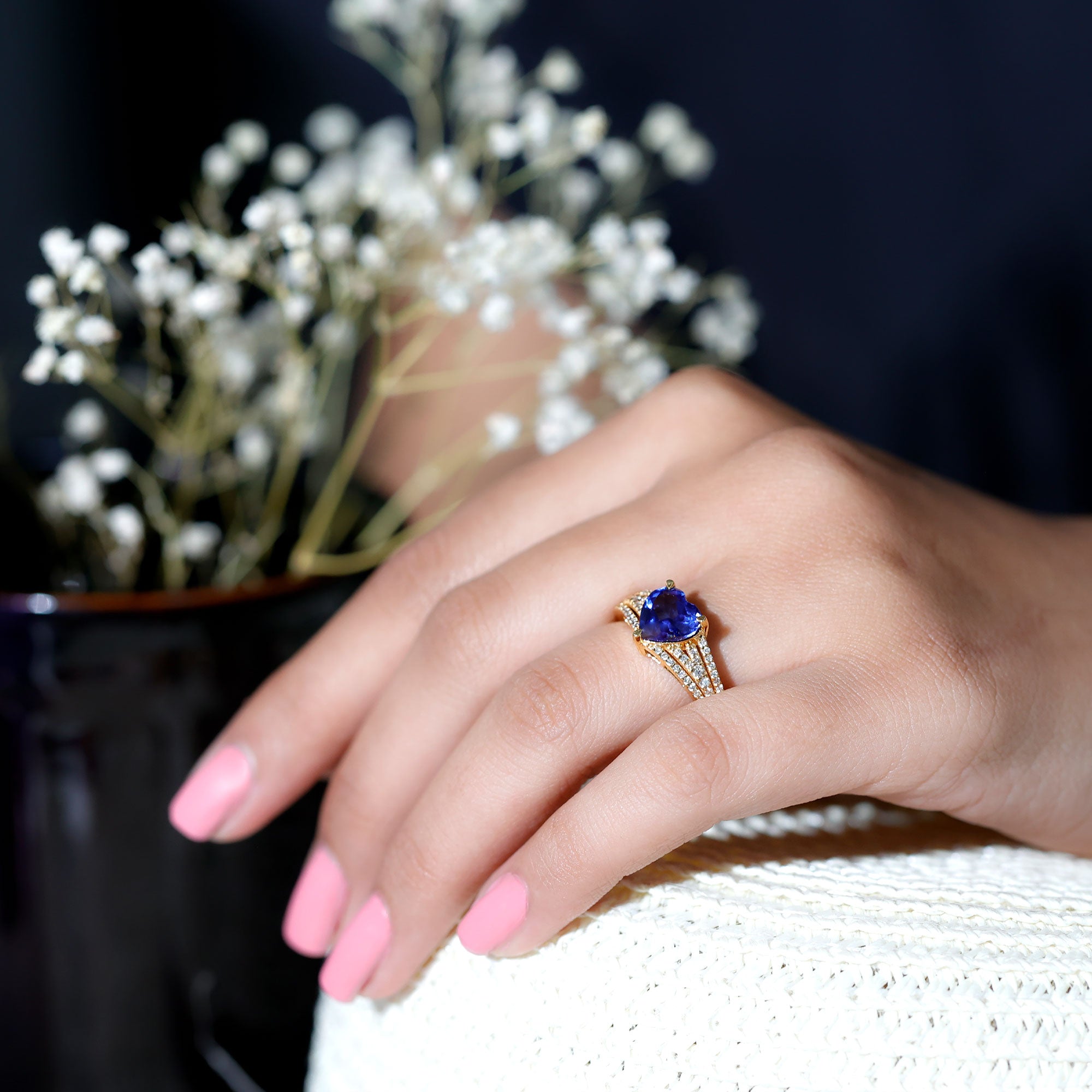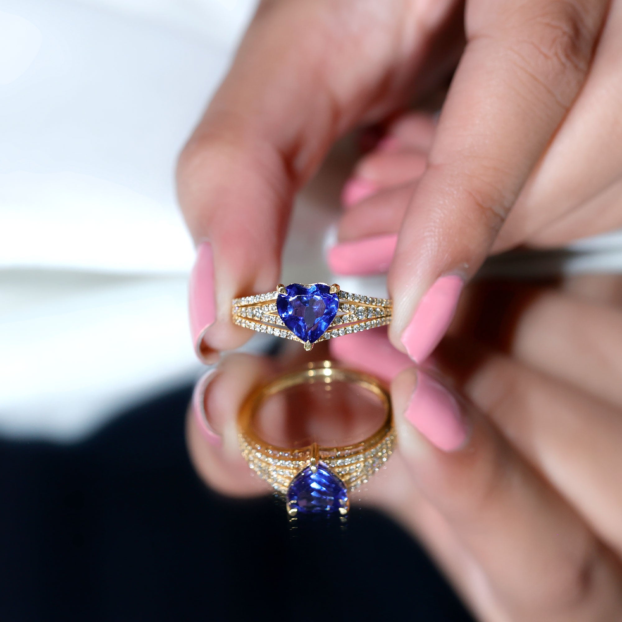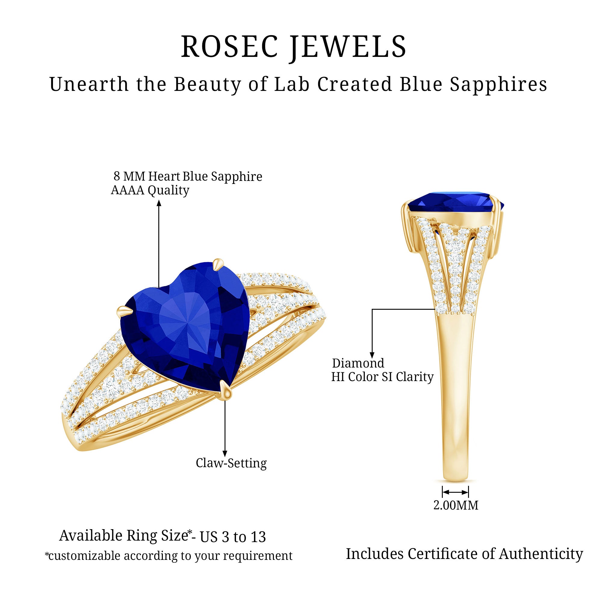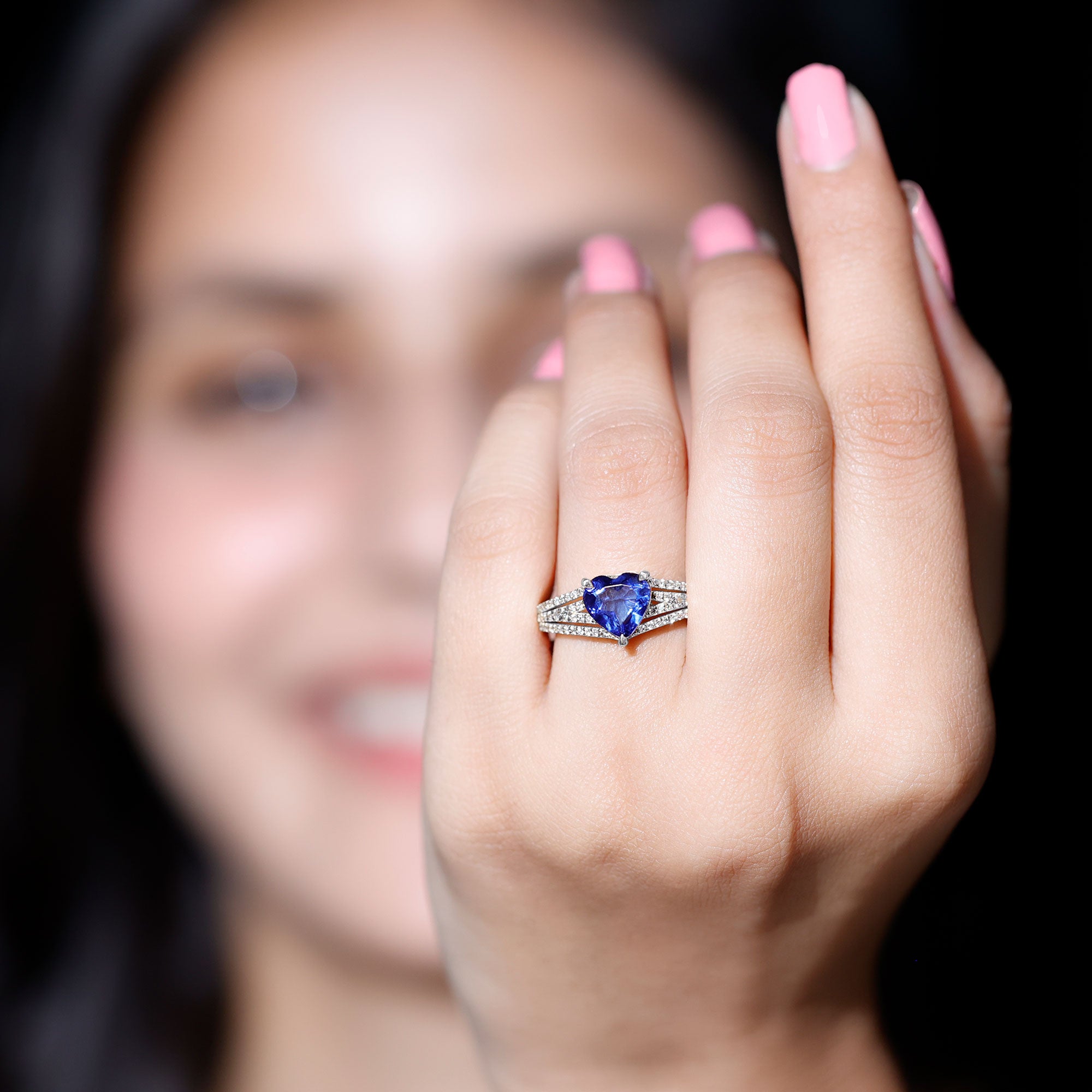 With this mesmerizing Heart Engagement Ring, love takes center stage in the most dazzling way. The 8 mm Heart Shape Lab Created Blue Sapphire at its core shines with a deep, enchanting blue that symbolizes loyalty, trust and a devotion that lasts forever. Surrounding the vibrant center, the Split Shank Band is adorned with sparkling Diamond stones, adding brilliance and elegance from every angle while drawing attention to the captivating glow of Lab Blue Sapphire. The split shank design adds a touch of modern sophistication, creating a perfect balance between bold statement and timeless romance. Every detail is crafted to highlight the depth of love and commitment that this Lab Blue Sapphire Engagement Ring represents, making it an unforgettable choice for proposals, anniversaries or special celebrations of devotion. Its elegant yet striking design pairs beautifully with classic or contemporary styles, ensuring it becomes a cherished piece for a lifetime. Presented in a signature jewelry box and available in various ring sizes for the perfect fit, this Heart Shaped Engagement Ring with Sapphire (Lab Grown) is a sparkling declaration of a love that continues to grow, shine and endure through every chapter of your shared journey.