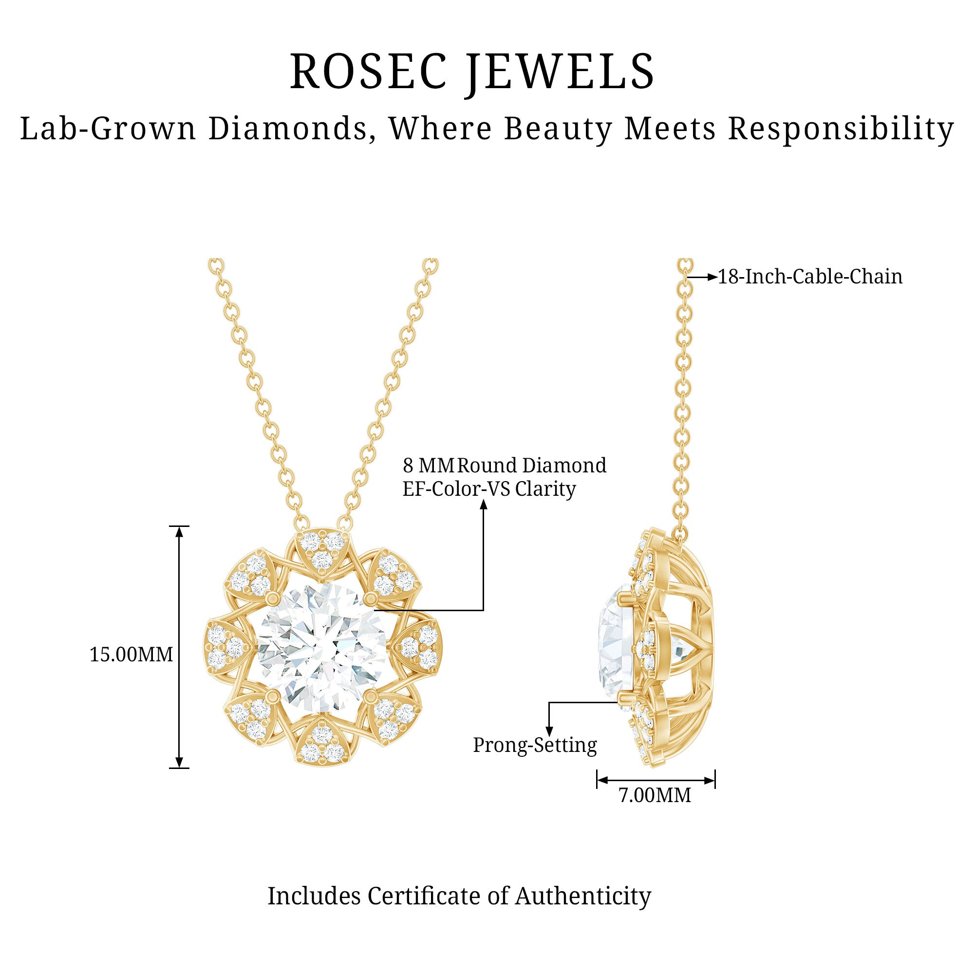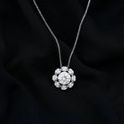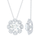 This Diamond Designer Necklace draws its inspiration from the beauty of flowers, making it a one-of-a-kind piece just for you. Adorn your neckline with this Floral Pendant, which showcases an 8 MM Round Shape Diamond of EF-VS quality set in prongs, surrounded by multiple trios of small gemstones that create a dazzling effect sure to attract attention. The simple yet elegant design of this Round Pendant Necklace beautifully represents the enduring themes of love, compassion, and lifelong commitment. Whether youre preparing for a special event or simply want to elevate a casual look, this Halo Pendant is the ideal finishing touch.