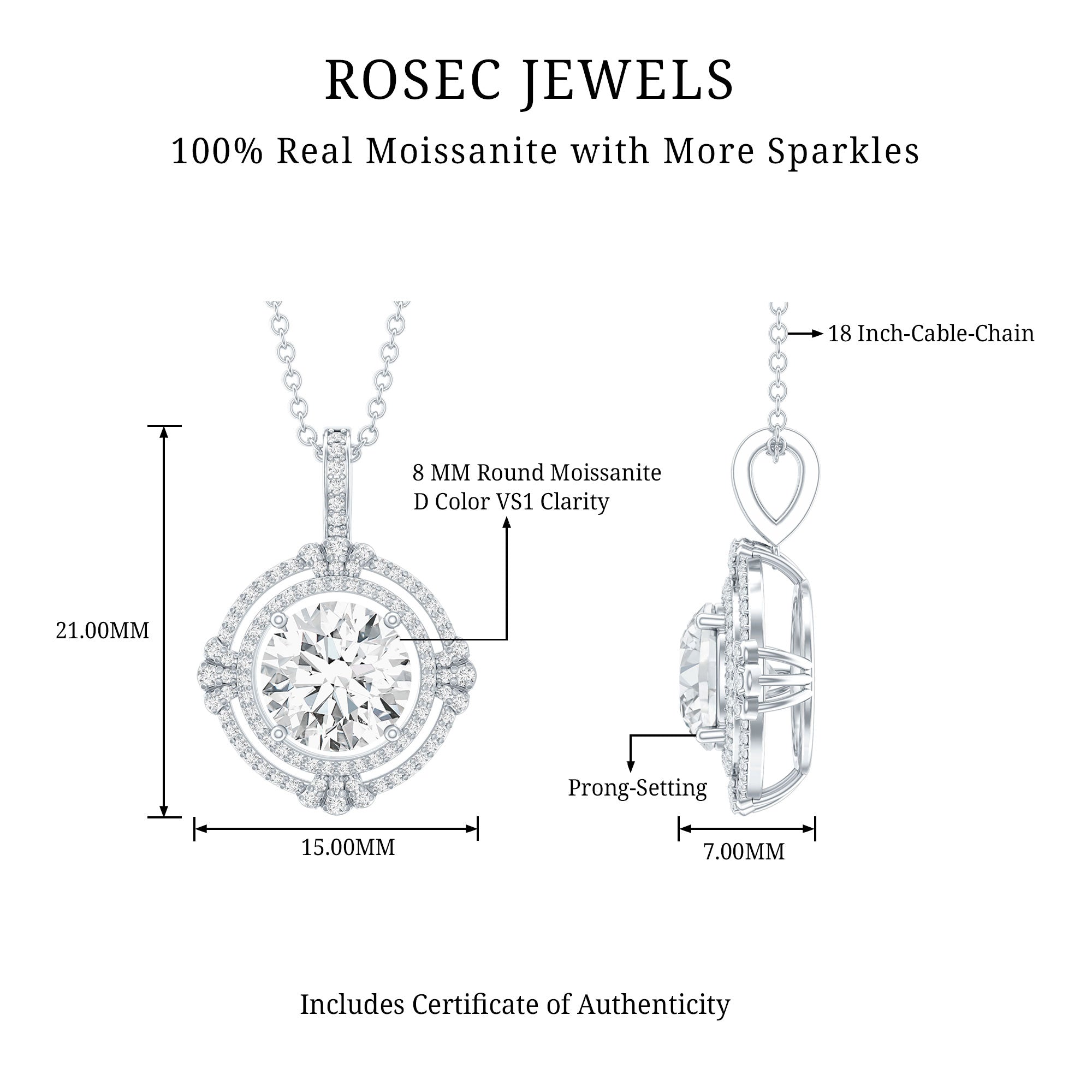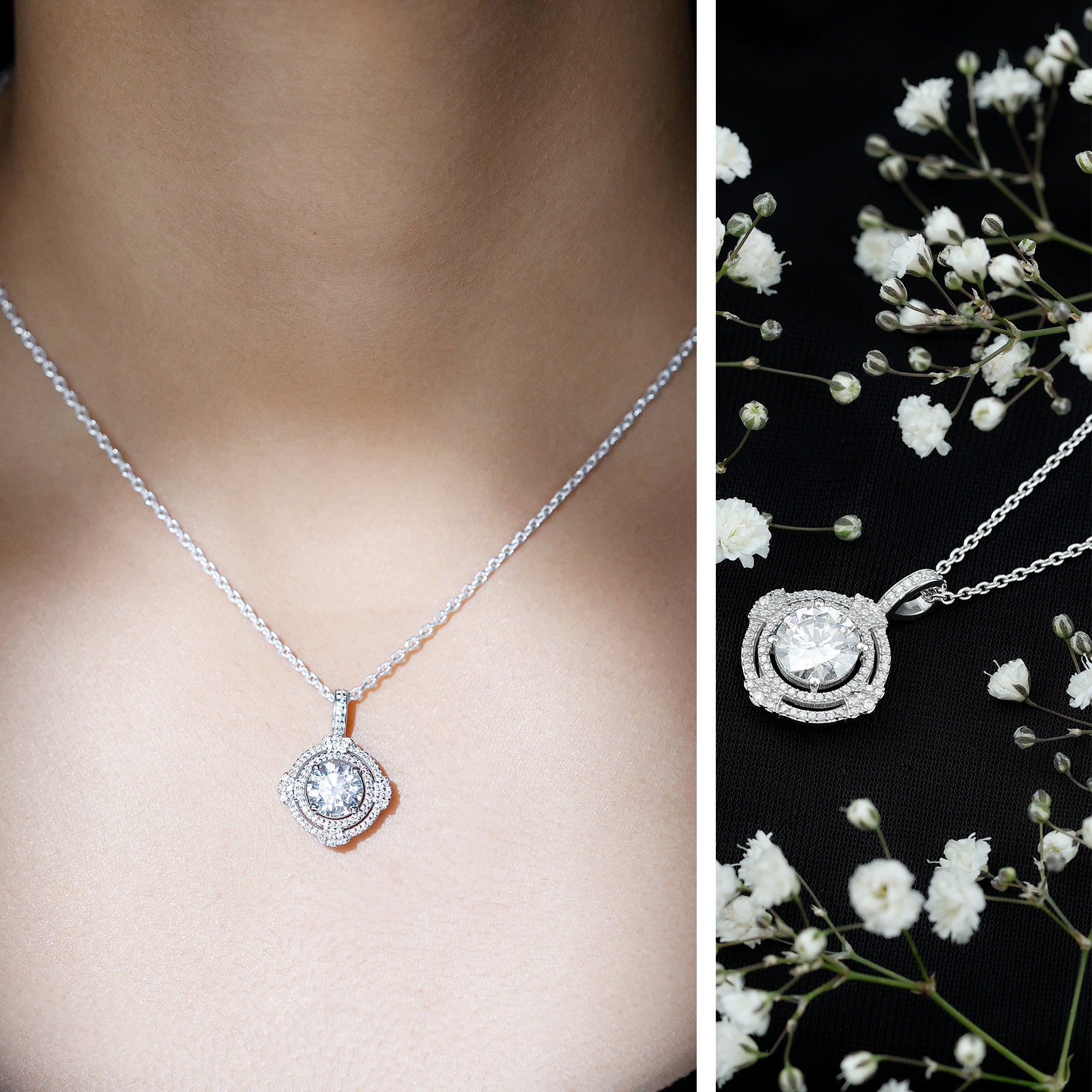Embrace your neckline with this Moissanite Pendant, precisely crafted with 14K White Gold Plated Silver. The pendant features an 8 MM Round Shape Moissanite securely placed in Prong Setting. The center stone is encircled with a double halo of petite which enhances the beauty of the pendant. This Halo Necklace dangles with a sturdy cable chain which makes it perfectly sit on your neckline which amplifies the overall look. This Circle Pendant Necklace beholds the classic shine of D-VS1 Quality Moissanite. Whether you are out for a casual meeting or savoring a romantic dinner, this 2 Carat Necklace effortlessly enhances any outfit. The charming moissanite studded bail brings a playful element, and the adjustable chain lets you style it just the way you prefer - whether layered or worn solo, bold or understated. Additionally, it comes beautifully packaged in a chic jewelry box. Whether you are treating a special someone who lights up your life or keeping it for yourself, this Double Halo Pendant Necklace is guaranteed to sprinkle a bit of magic on every occasion. After all, this piece of jewelry doesnt just complete your outfit, it elevates your entire vibe.