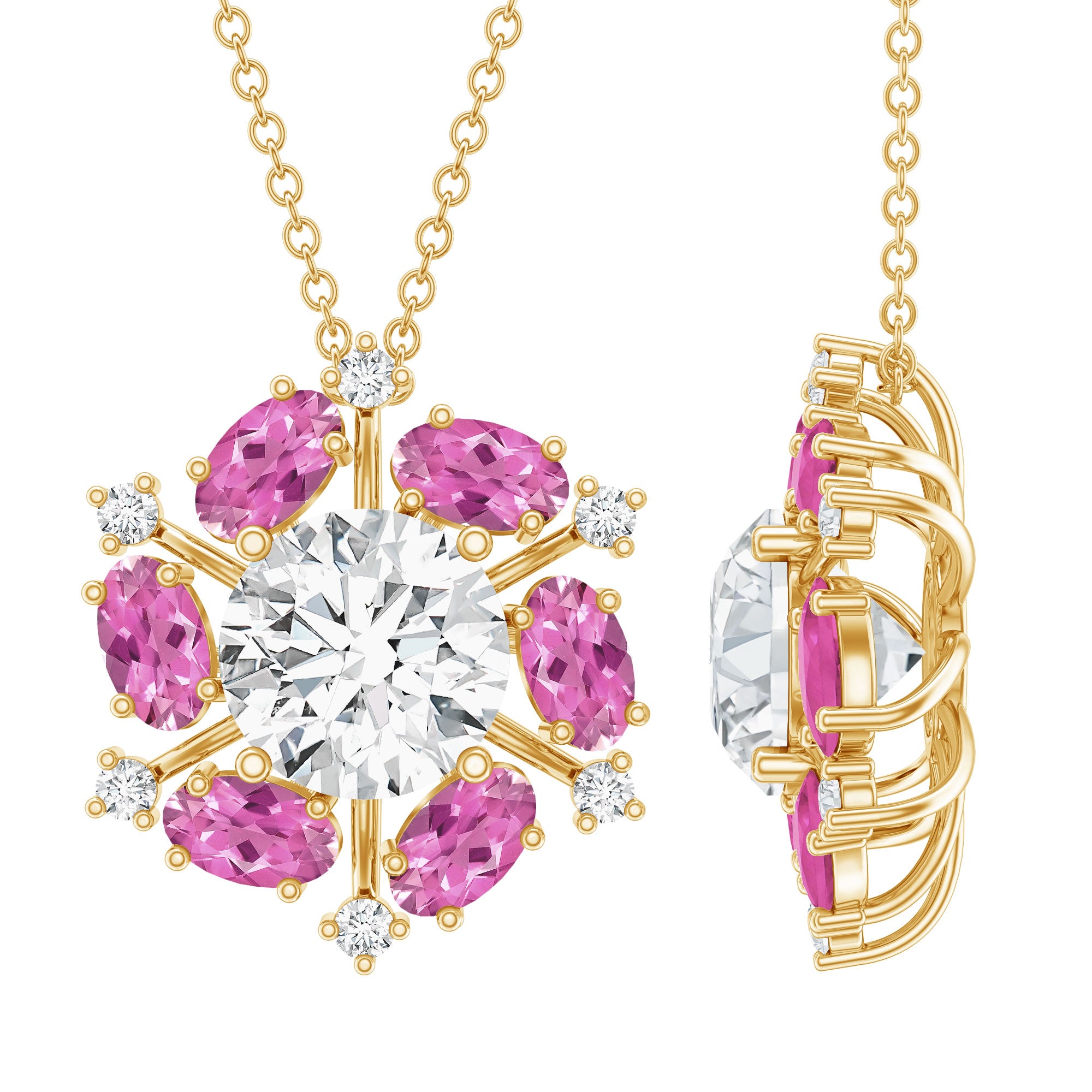 Bold, radiant, and full of charm, this handcrafted Floral Statement Necklace is a celebration of color and sparkle. Made with 14K yellow gold plated silver, this show-stopping piece features a brilliant 8 MM Round Cut Moissanite at its heart, shaped to perfection for a fire and brilliance that rivals natural diamonds. Its luminous shine instantly draws the eye and becomes the centerpiece of this floral-inspired design. Surrounding the central Moissanite are vivid 3X5 MM pink tourmalines, each carefully shaped into elegant ovals and set in a floral formation. Their rich pink hue adds a vibrant contrast to the white brilliance of the Moissanite, creating a striking balance between boldness and elegance. Between each pink gem, dainty moissanite accents complete the flower-like design with a graceful sparkle that enhances the overall radiance. The Moissanite Flower Necklace hangs gracefully from a delicate chain, offering a comfortable fit while making a powerful visual statement. With its unique combination of stones and thoughtful craftsmanship, this Statement Pendant Necklace is more than just jewelry, it is wearable art. Whether worn to elevate a formal look or to add personality to everyday outfits, this Moissanite and Tourmaline Necklace delivers sophistication with a bold twist. A true statement piece for those who love to stand out beautifully.