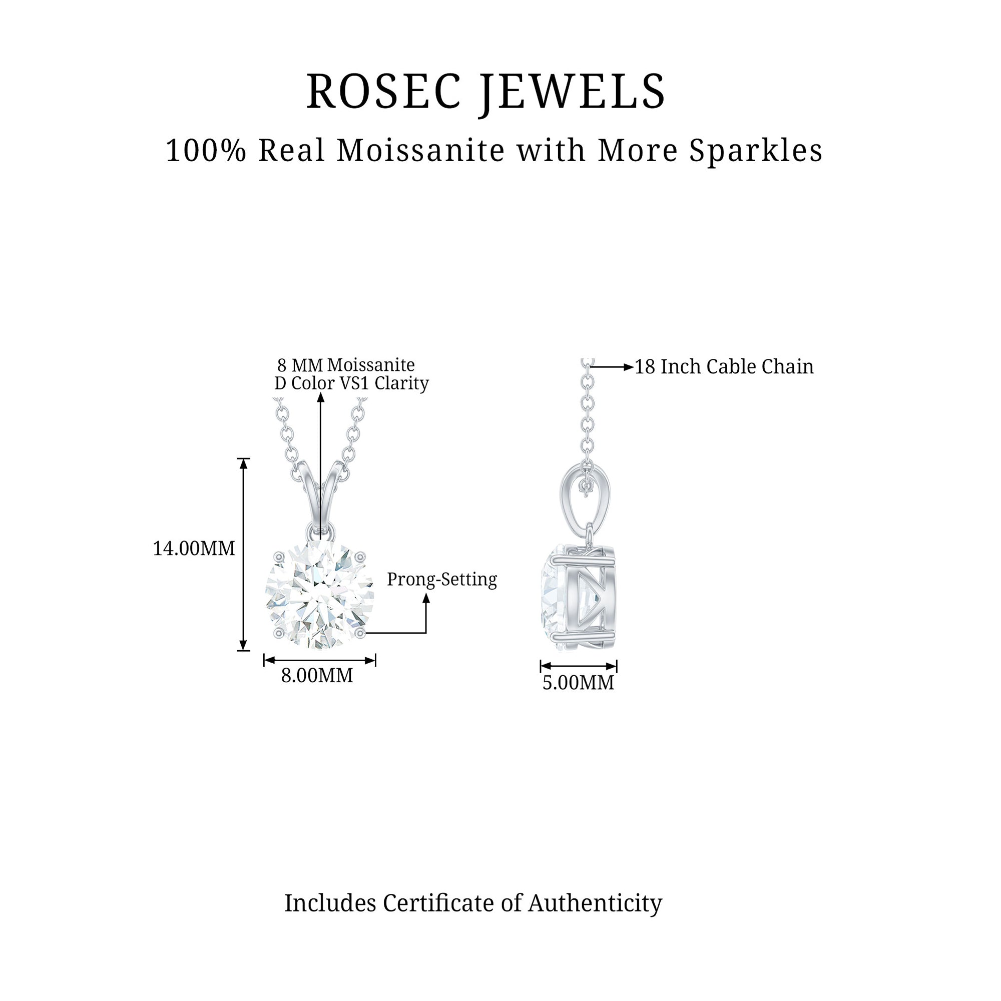 Present your beloved woman with something that is both timeless and meaningful, just like our Solitaire Moissanite Necklace. Made by Rosec Jewels, this Single Stone Pendant showcases a breathtaking 8 MM round cut moissanite set in prong setting for an elegant appearance. This 2 Carat Moissanite Necklace is more than just a piece of jewelry, it is an ideal enhancement to any woman’s collection. The Moissanite Necklace features a rabbit ear bail that allows the cable chain to glide through effortlessly. You can choose to have this necklace with or without a chain, based on your preference. By giving her this Round Pendant Necklace, you will enrich her jewelry collection with a hint of luxury that she can flaunt anytime, anywhere. Additionally, the secure Signature Jewelry Box packaging not only provides a wonderful surprise but also ensures safe storage for her treasured piece. The dazzling charm of this Solitaire Pendant Necklace makes it suitable for everyday wear or for dressing up on special occasions.
