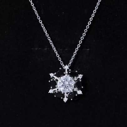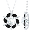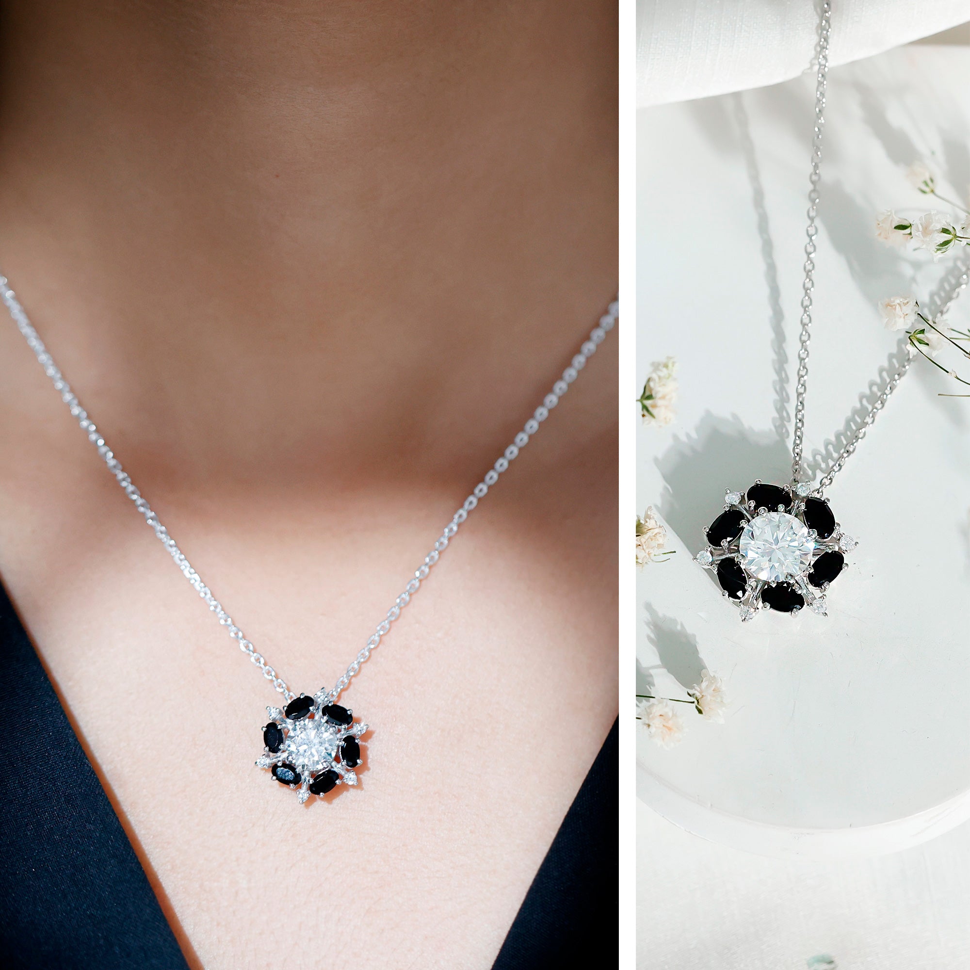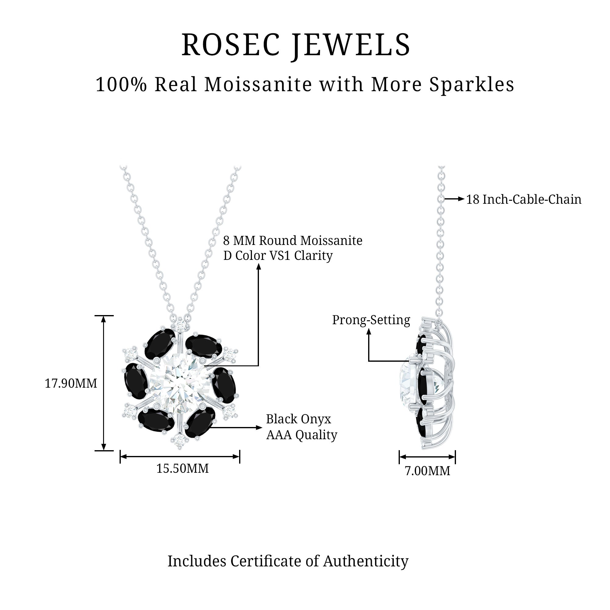 Enhance your neckline with this Moissanite Pendant Necklace, expertly made with 14K White Gold Plated Silver. The pendant showcases an 8 MM round Moissanite, securely held in a prong setting, adorned with additional delicate round cut moissanite stones and a halo of oval cut black onyx stones arranged in an east-west style. This Monochrome Necklace radiates the timeless brilliance of D color VS1 clarity Moissanite and AAA Quality black onyx. It hangs from a strong and simple cable chain that allows it to rest beautifully on the neckline, completing your look. This Moissanite Pendant and Chain will arrive in a velvet pouch for safe, dust-free storage, accompanied by a certificate of authenticity.
