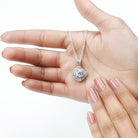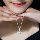 Embrace your neckline with this Moissanite Pendant, precisely crafted with 14K White Gold Plated Silver. The pendant features an 8 MM Round Shape Moissanite securely placed in Prong Setting. The center stone is encircled with a double halo of petite which enhances the beauty of the pendant. This Halo Necklace dangles with a sturdy cable chain which makes it perfectly sit on your neckline which amplifies the overall look. This Circle Pendant Necklace beholds the classic shine of D-VS1 Quality Moissanite. Our Large Pendant Necklace will be delivered to you in a premium quality velvet pouch with the certificate of authenticity.