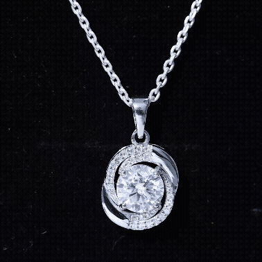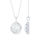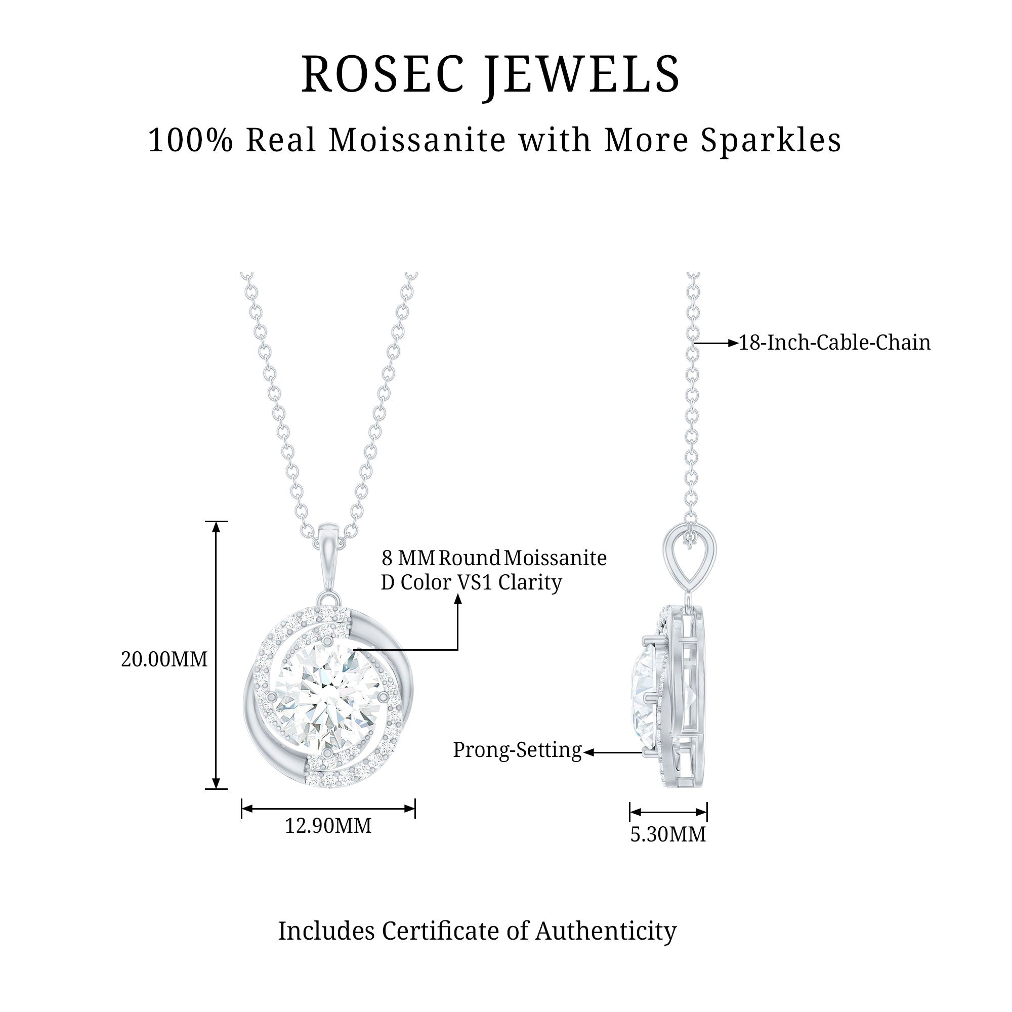 Swirl with confidence by wearing this Moissanite Pendant Necklace, which is handcrafted with white gold plated silver. This classic pendant features an 8 MM Round Shape Moissanite of D-VS1 Quality placed at the center of a metallic swirl pattern, partially embedded Smaller Moissanite. This Swirl Necklace adorns the neckline beautifully and completes the look for the day. This Round Pendant Necklace can be layered with other necklaces to achieve a signature look or can worn solely to achieve a minimal yet statement look. This classic pendant can be the perfect option for a gift for your beloved while celebrating a relationship milestone.