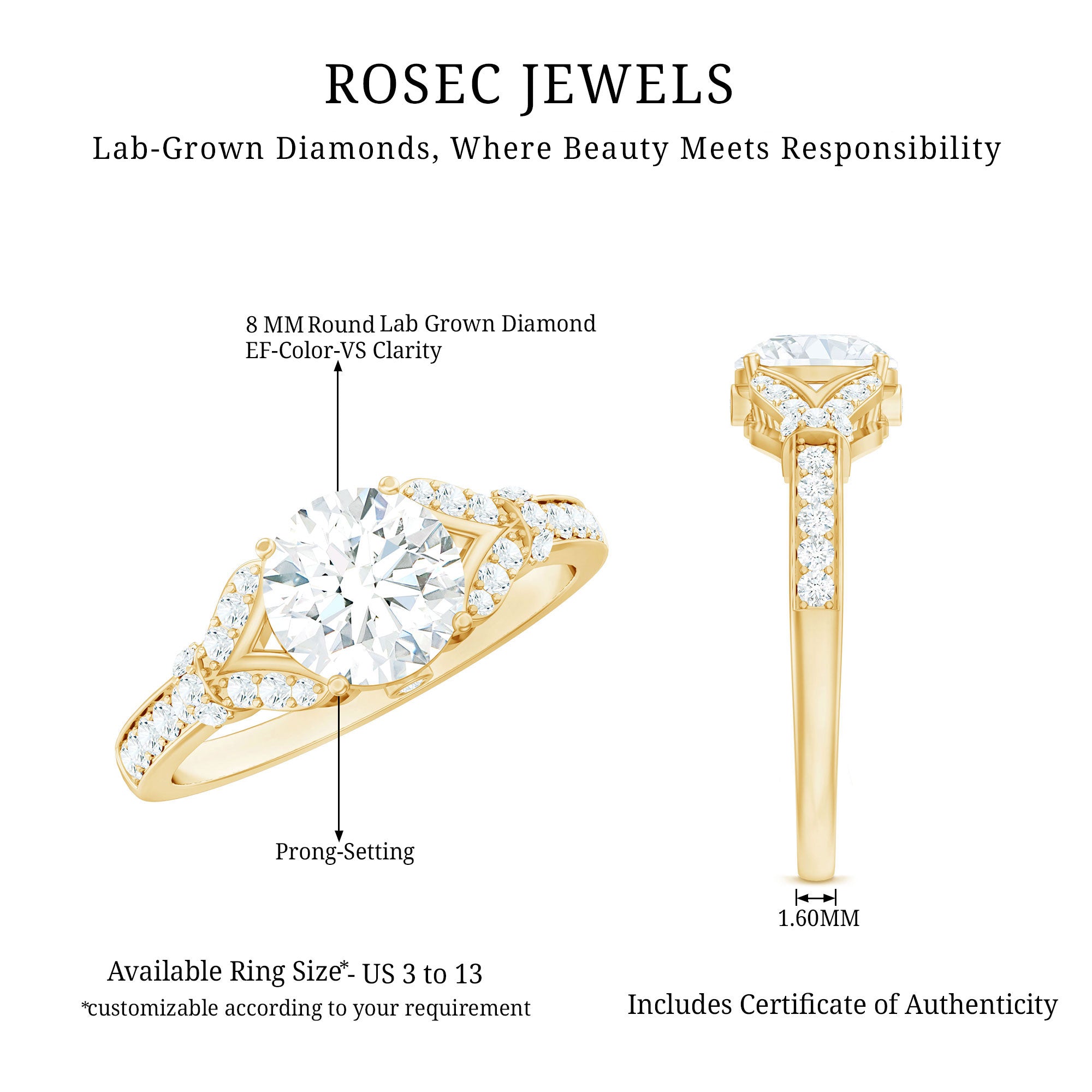Add an bold but elegant style statement on the big day with this Diamond Engagement Ring, designed by Rosec Jewels. The center features a brilliant 8 MM round shaped EF-VS quality diamond set in prong setting while the smaller diamonds line the split shank, giving this Solitaire Ring a modern, eye catching look and adding the perfect sparkle. We design jewelry thats easy on your wallet and the planet. Every gemstone in this Split Shank Engagement Ring is lab-grown which is ethically made, responsibly sourced, and absolutely amazing. We ship this Fine Ring in the appropriate packaging ensuring they are ready for gift upon arrival.