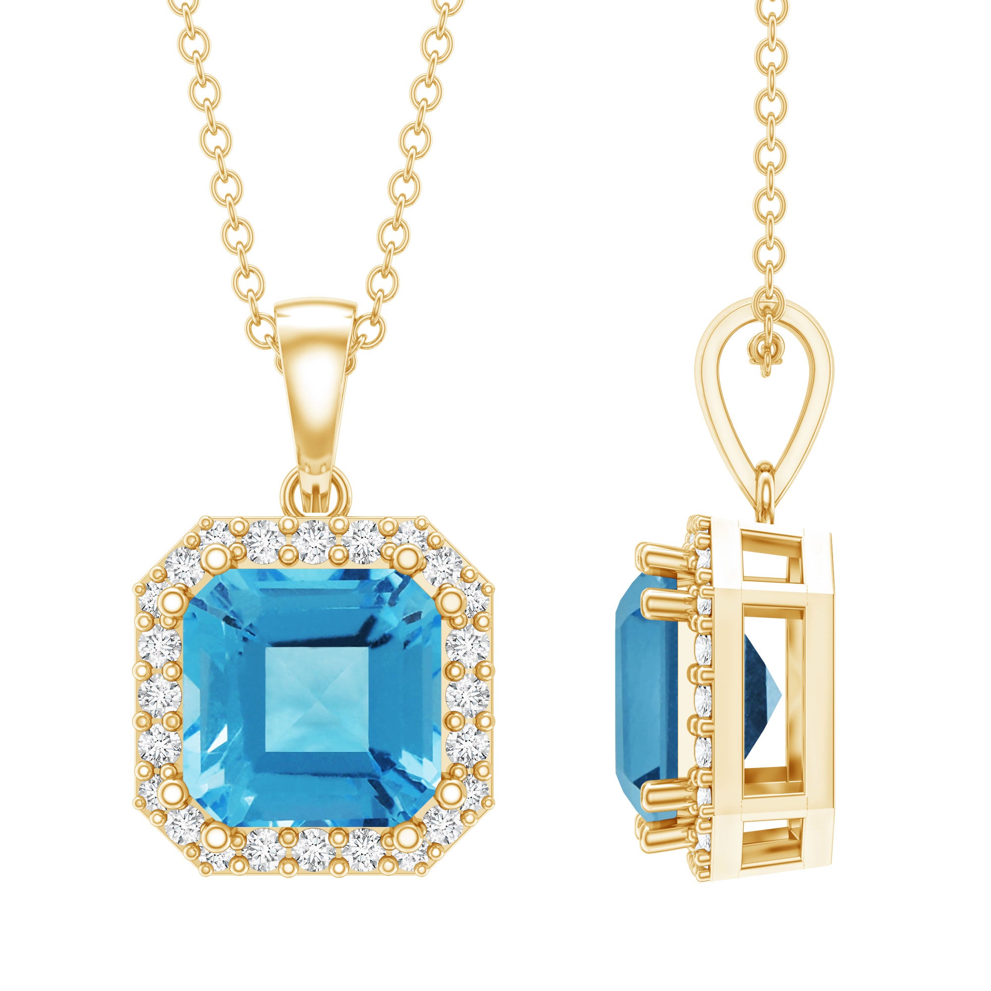 Add a refreshing pop of color to your jewelry collection with this stunning Swiss Blue Topaz Pendant, a timeless piece designed to bring elegance and meaning to your everyday look. Handcrafted in 14k yellow gold plated silver, this Halo Necklace features a beautiful 8 MM Asscher cut Swiss Blue Topaz at the center, securely set in prong setting. Surrounding the center stone is a sparkling round lab grown diamond halo, giving the piece a bright and eye-catching finish that enhances its modern charm. Whether you are dressing up for a special event or simply looking to add a little extra shine to your outfit, this Swiss Blue Topaz and Diamond Necklace offers the perfect blend of color and sparkle. The blue hue pairs effortlessly with both casual and formal wear, making it a go-to choice for any occasion. Swiss Blue Topaz, known for symbolizing peace and communication, also happens to be a birthstone for December. This makes the pendant a thoughtful gift for someone born in that month or for anyone who loves vibrant, meaningful jewelry. Its minimal yet stylish design speaks of grace, making it perfect for birthdays, anniversaries, or just to show your appreciation. The December Birthstone Necklace hangs beautifully from a durable chain that is easy to adjust to your desired length, secured with a reliable clasp. Comfortable to wear all day, this pendant is lightweight yet full of presence.
