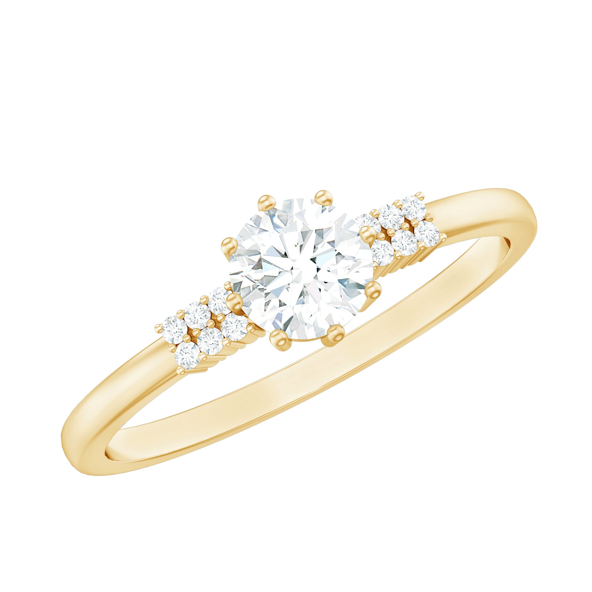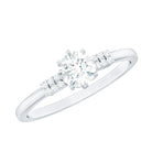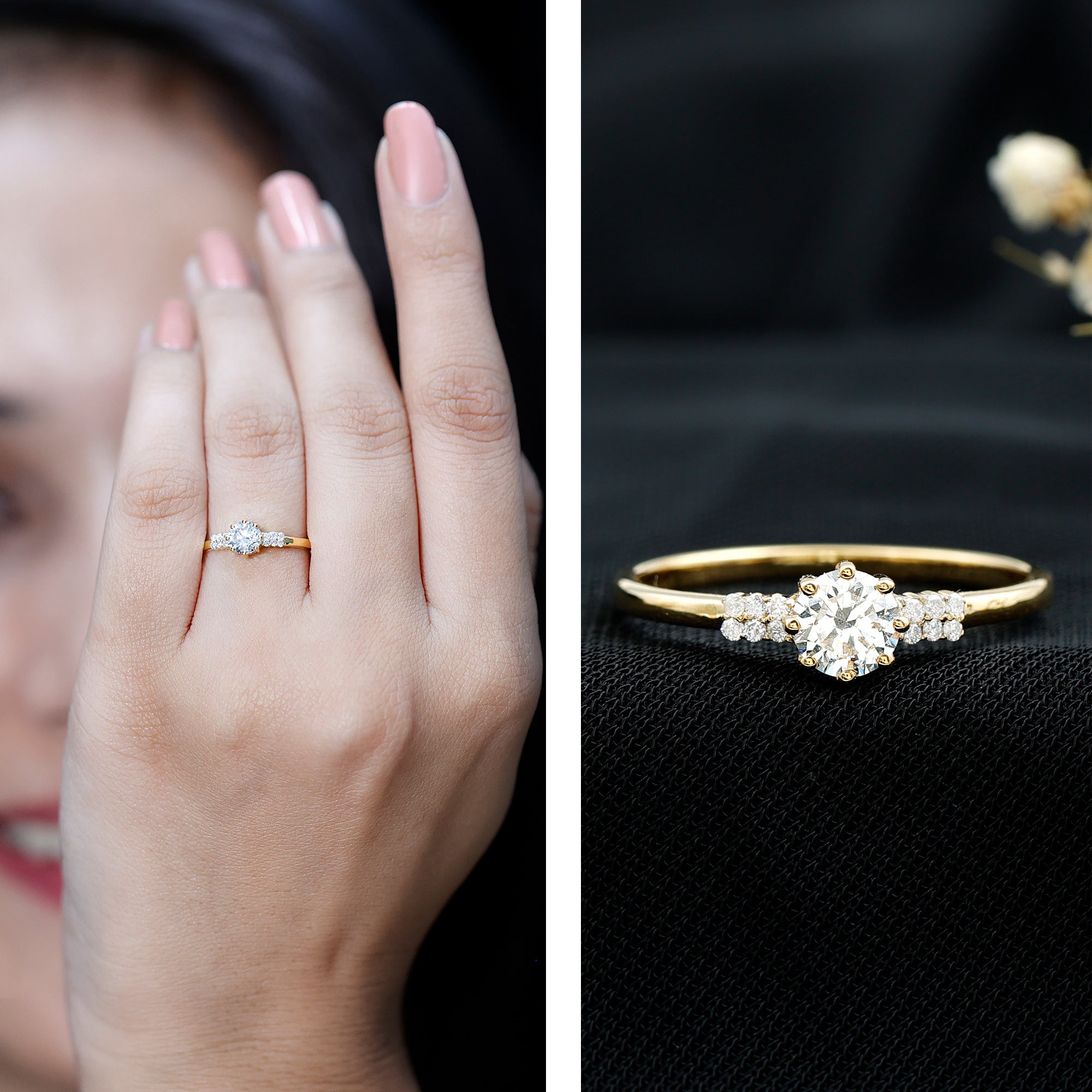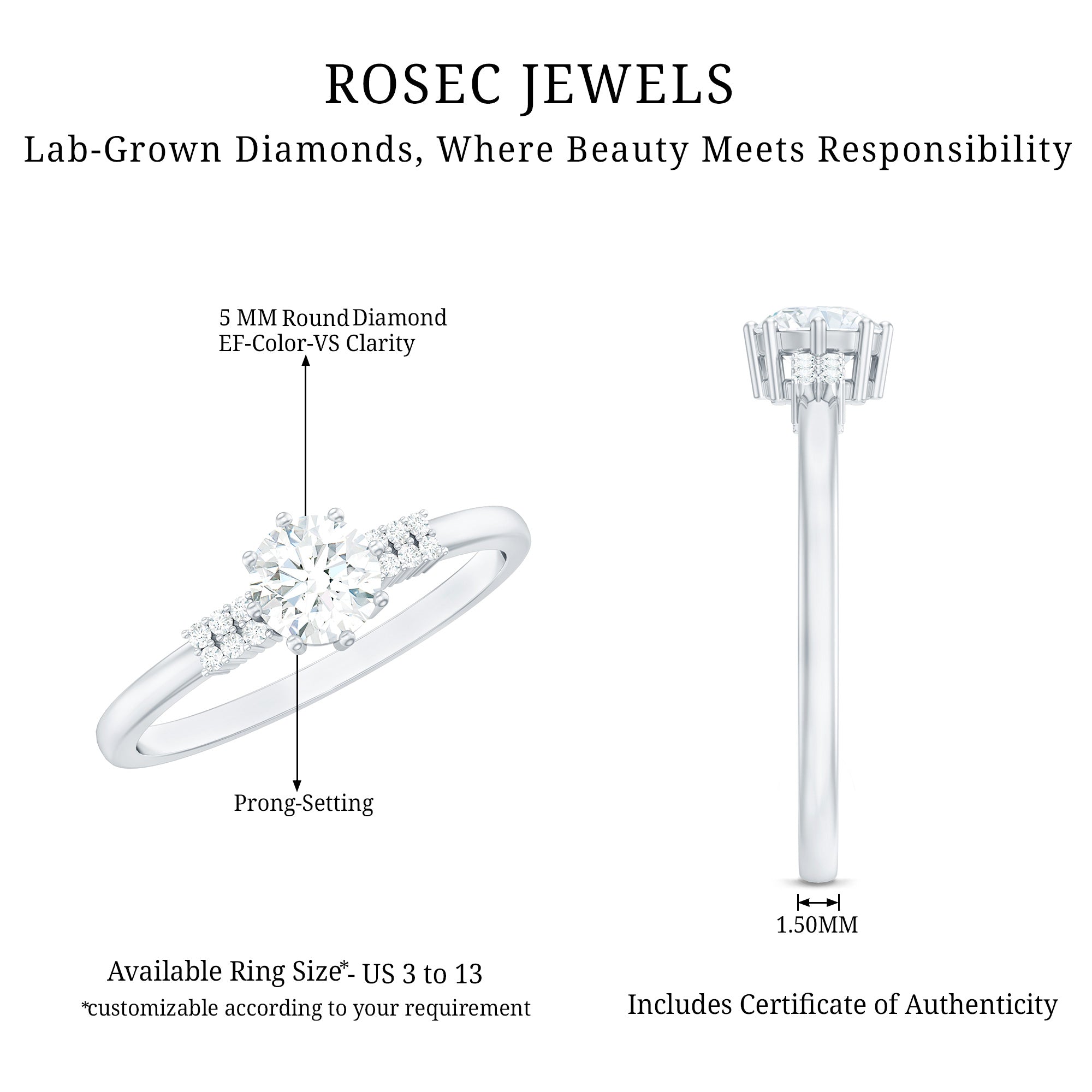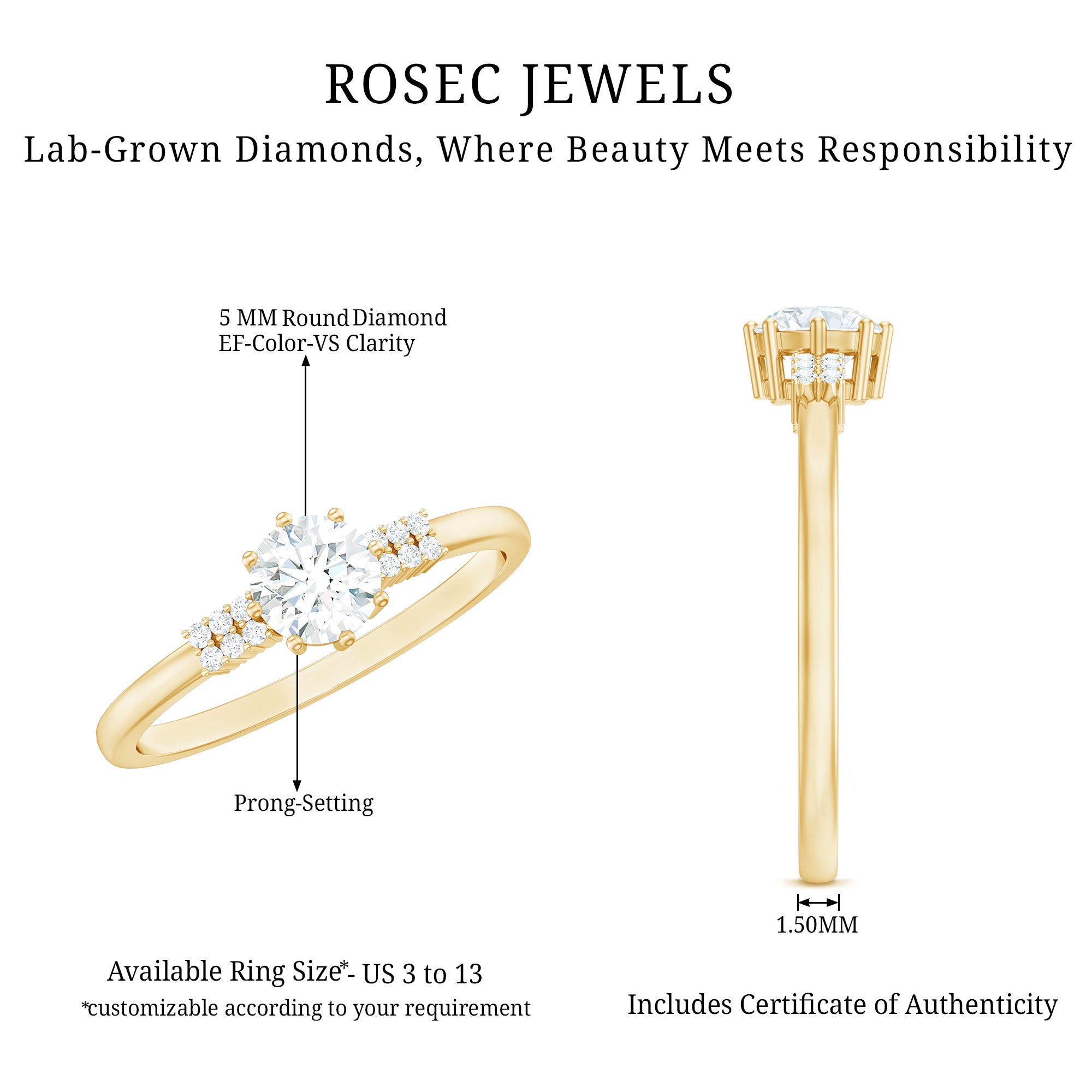 Make heads turn and hearts skip a beat with the stunning shine of this Diamond Proposal Ring, handcrafted by Rosec Jewels. This Solitaire Ring features a 5 MM round shape synthetic diamond set in 8-prong setting, while the smaller petite diamonds on both sides enhance the beauty of the centerpiece. Adore your lady with this Promise Engagement Ring and make the moment of love memorable forever. The shine of EF-VS Quality lab grown diamond will enlighten the occasion and make her happiness double. To make your moment more special we will send this Round Cut Diamond Ring in our Signature Jewelry box and to ensure the quality of the gemstone, it comes with a certificate of authentication.