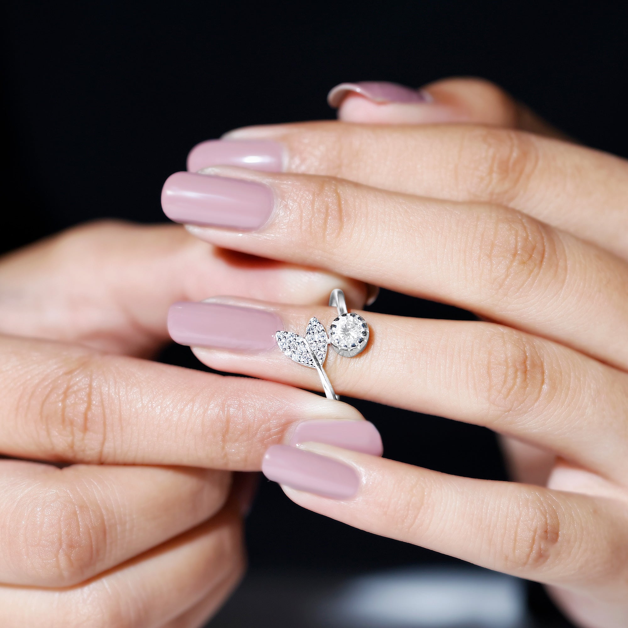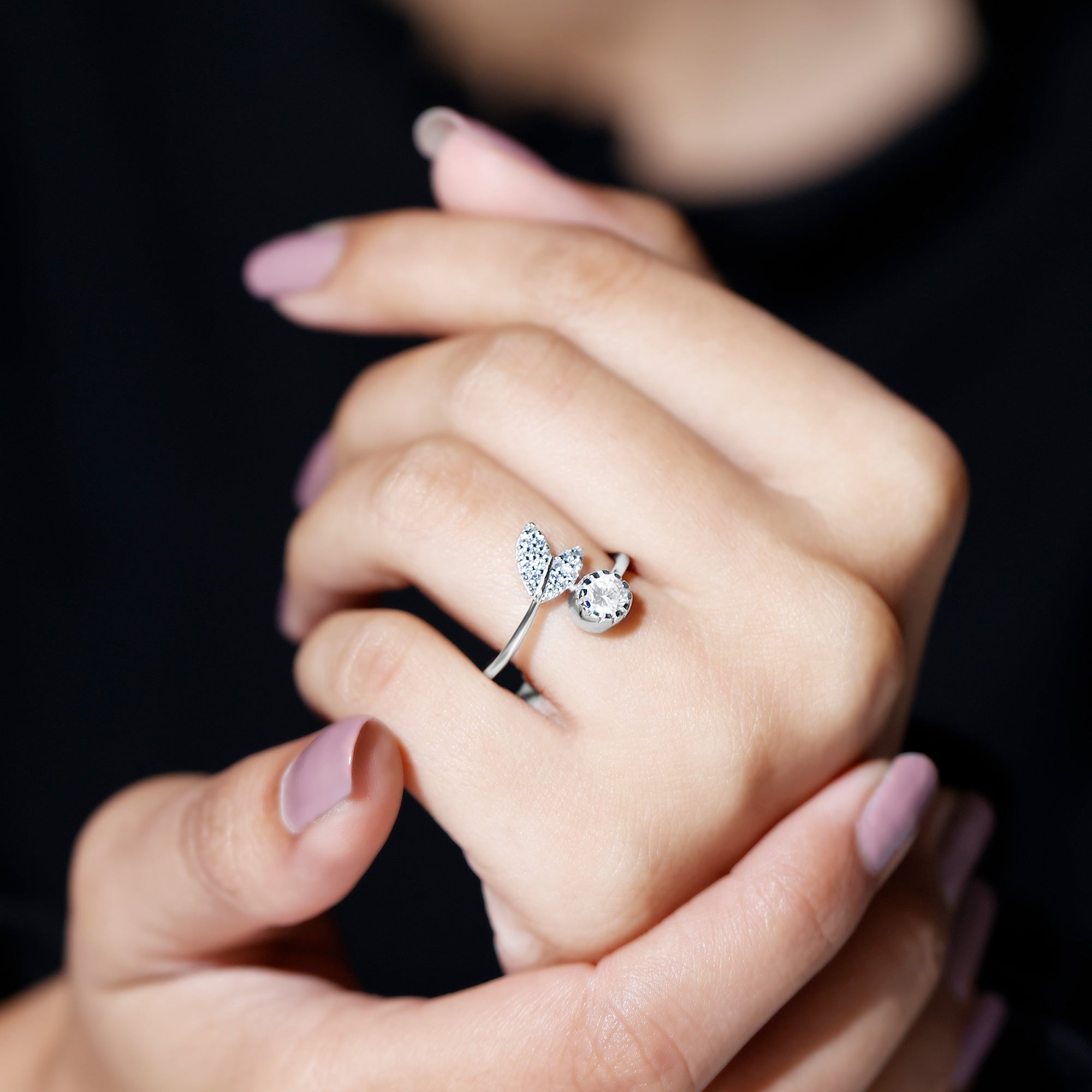 Inspired by the grace of a mermaids tail, this Diamond Engagement Ring captures the beauty of the oceans mystery and the sparkle of a love that knows no limits. Our Round Diamond Ring is a perfect blend of elegance and modern artistry, designed to capture hearts at first sight. One side of this Open Cuff Ring features a fishtail-inspired design that is adorned with shimmering pave set diamonds. The other side is crowned with a breathtaking 5 MM solitaire round cut diamond (lab made) set in prong setting. Whether it is an engagement, anniversary, or a meaningful gift, this unique Animal Inspired Ring is a timeless statement of love, making her feel truly special every time she wears it.