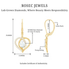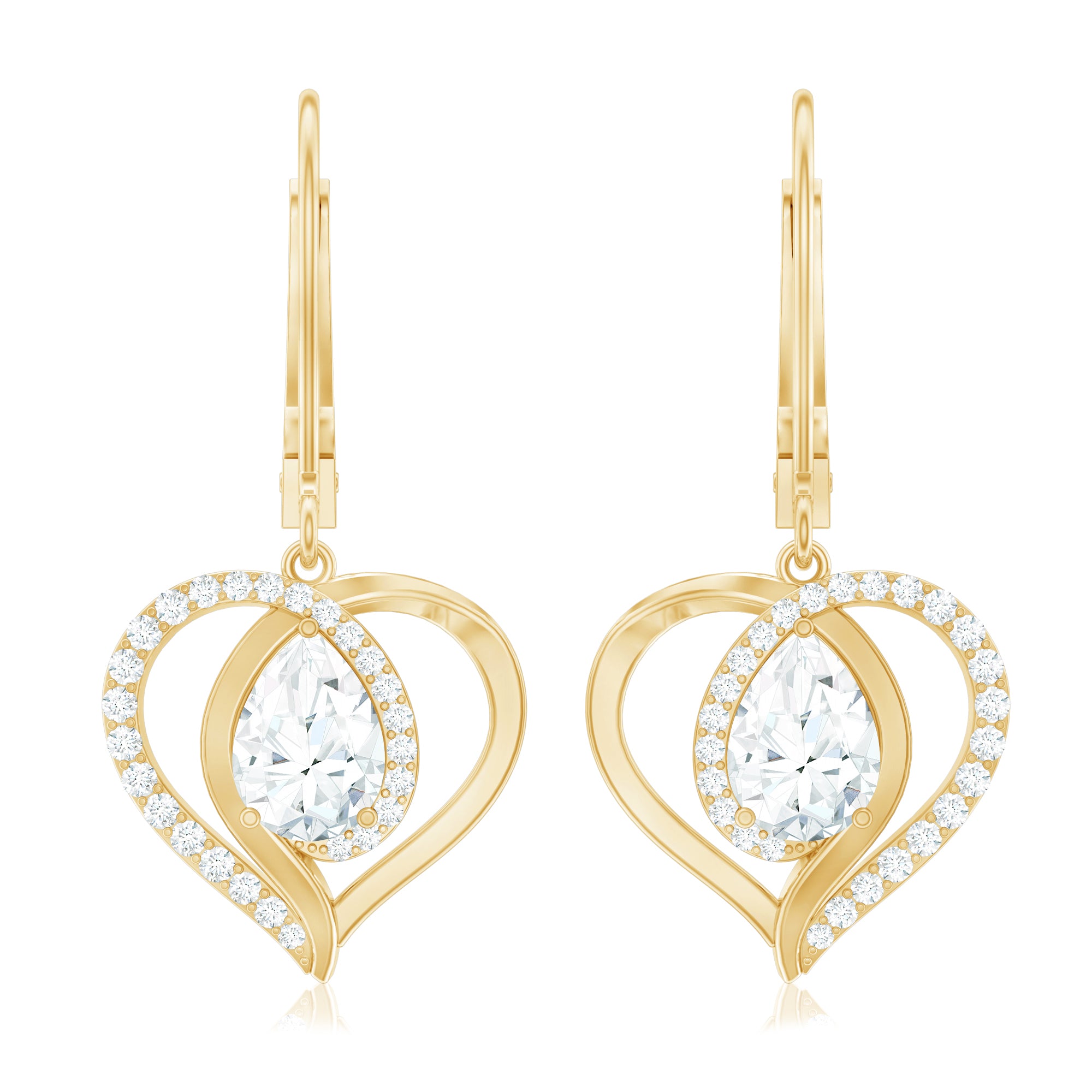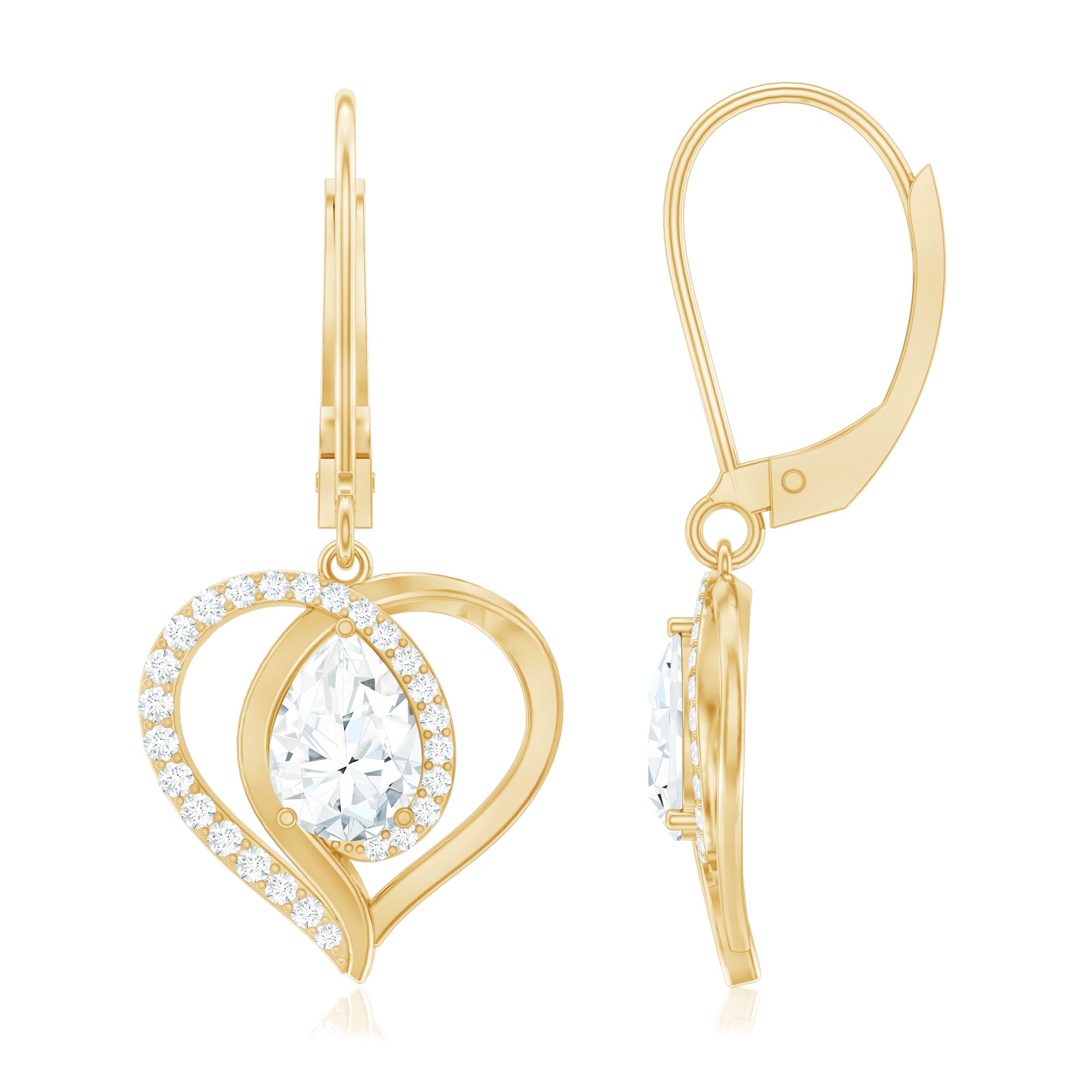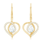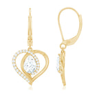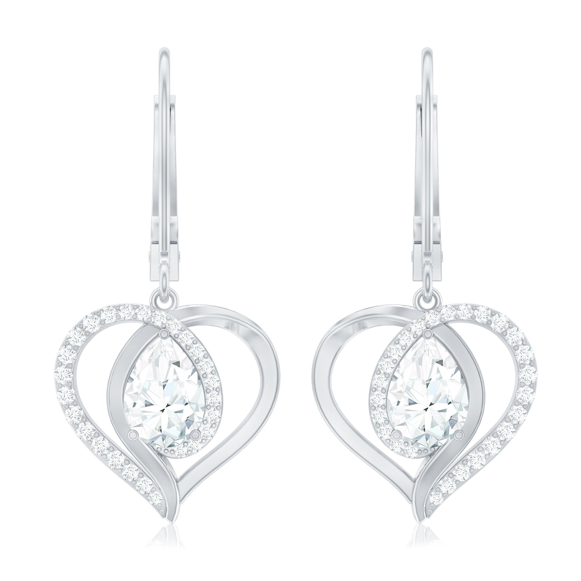 Add charm and sparkle to your look with these Hanging Diamond Earrings. They feature an open heart design that beautifully frames a 5X7 MM pear shaped synthetic diamond set in the center in prong setting. One side of the heart is adorned with round cut diamonds, adding a touch of extra shimmer and contrast to the polished metal on the other side. The easy to use lever back closure of these Heart Drop Earrings makes them easy to wear and remove. Handcrafted with lab-grown gemstones, these Diamond Heart Earrings offer exceptional brilliance, clarity, and fire. As a budget-friendly option for April birthstone jewelry, these Dangling Earrings make a thoughtful and meaningful gift for birthdays, anniversaries, Valentines Day, and other special celebrations.