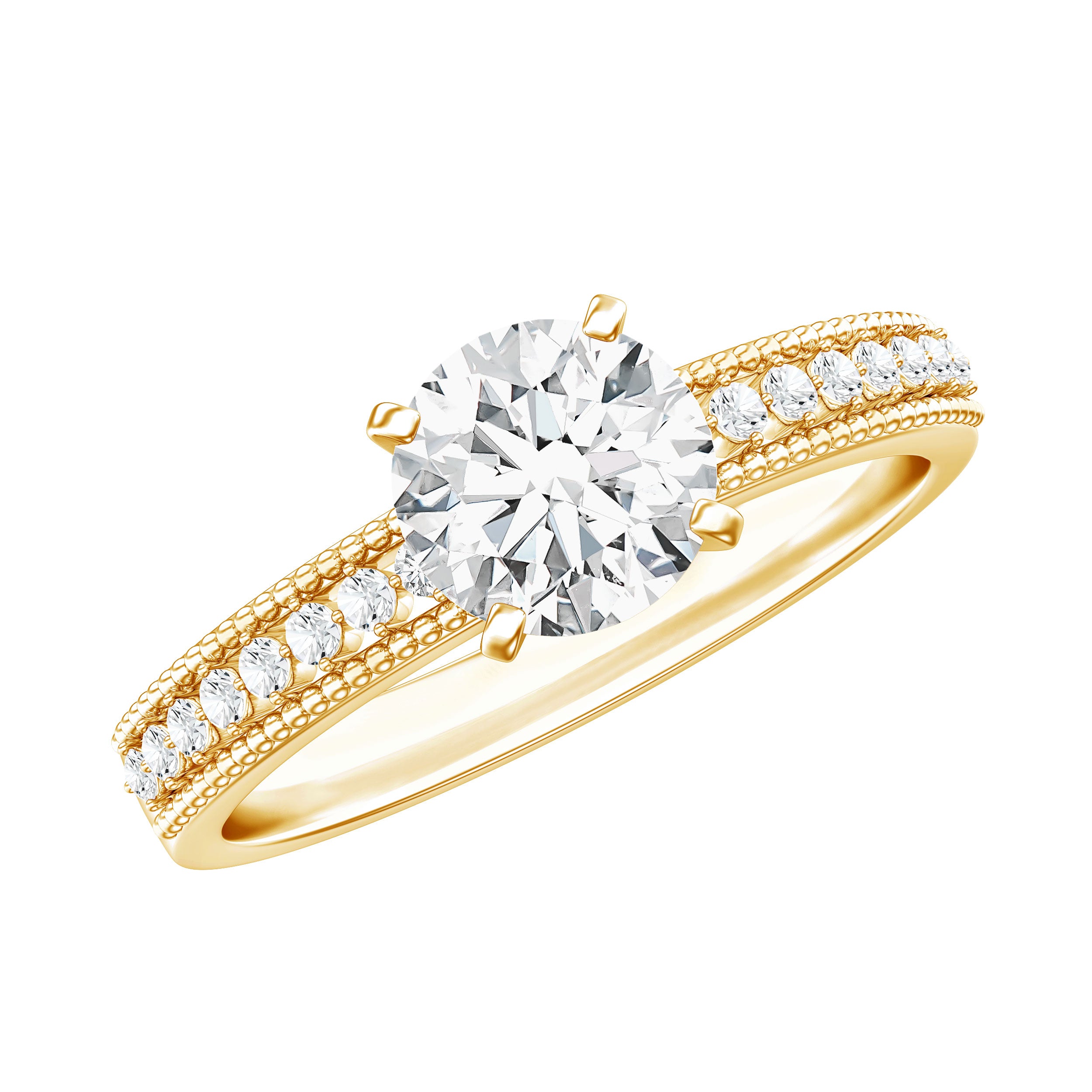 This elegant Solitaire Engagement Ring showcases a dazzling 6 MM round shaped diamond in secure prong setting. The band of this man made Diamond Ring is adorned with intricate beaded detailing and a row of sparkling accents, adding a touch of vintage charm to its modern design. Crafted with care, the lab grown diamond is ethically sourced and eco-friendly, making it a meaningful choice for couples who value sustainability. Its timeless design ensures it will be cherished for a lifetime, while the included certificate of authenticity assures its quality and value. Make your proposal unforgettable with a Round Cut Diamond Engagement Ring that is as special as your love.