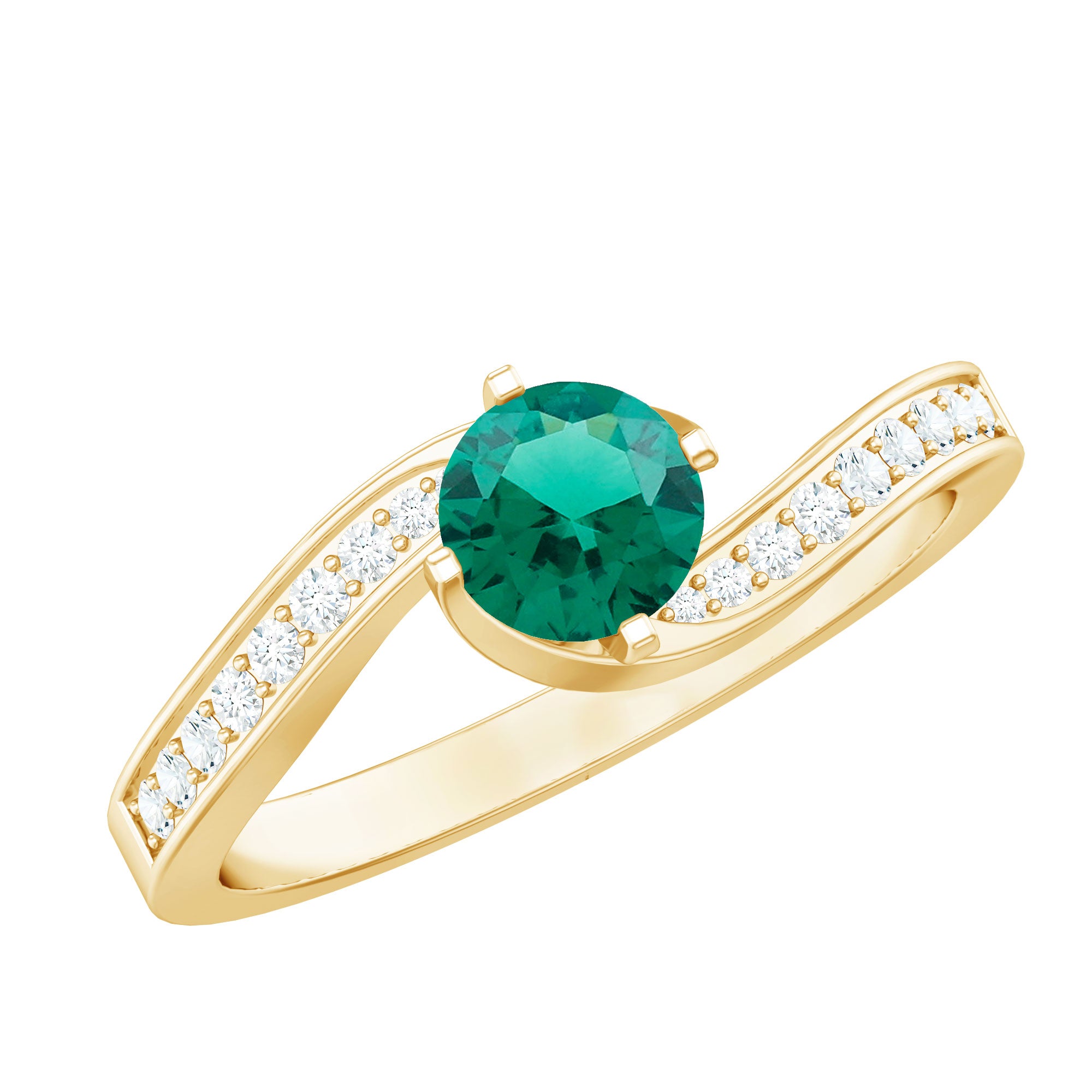 This stunning Solitaire Engagement Ring is a perfect blend of modern design and meaningful symbolism. Designed to captivate hearts, this Fine Ring features a striking 6 mm Round Shape Lab Grown Emerald of AAAA Quality as the center stone, set gracefully in Twisted Prong Setting between a bypassing band that elegantly curves around the finger. The Bypass Band symbolizes two lives coming together, intertwining and moving forward in harmony that makes this Bypass Engagement Ring a powerful representation of your unique love story. Adding extra brilliance to the design, sparkling HI-SI Diamond stones are carefully studded over the Bypass Band that gives this Lab Grown Emerald Ring a delicate yet eye-catching sparkle. Crafted for comfort and everyday elegance, this Emerald Diamond Engagement Ring is available in various sizes to ensure the perfect fit for your special someone. It comes beautifully packaged in an elegant jewelry box that makes it ready for a memorable proposal or special occasion. This Round Engagement Ring is a meaningful symbol of your everlasting commitment. Its graceful curves, vibrant Lab Emerald and shimmering Diamond stones together create a timeless design she will treasure forever. For someone who values a blend of unique style, symbolic design and sustainable luxury, this Lab Emerald Green Engagement Ring is the perfect choice to express your deepest affection.