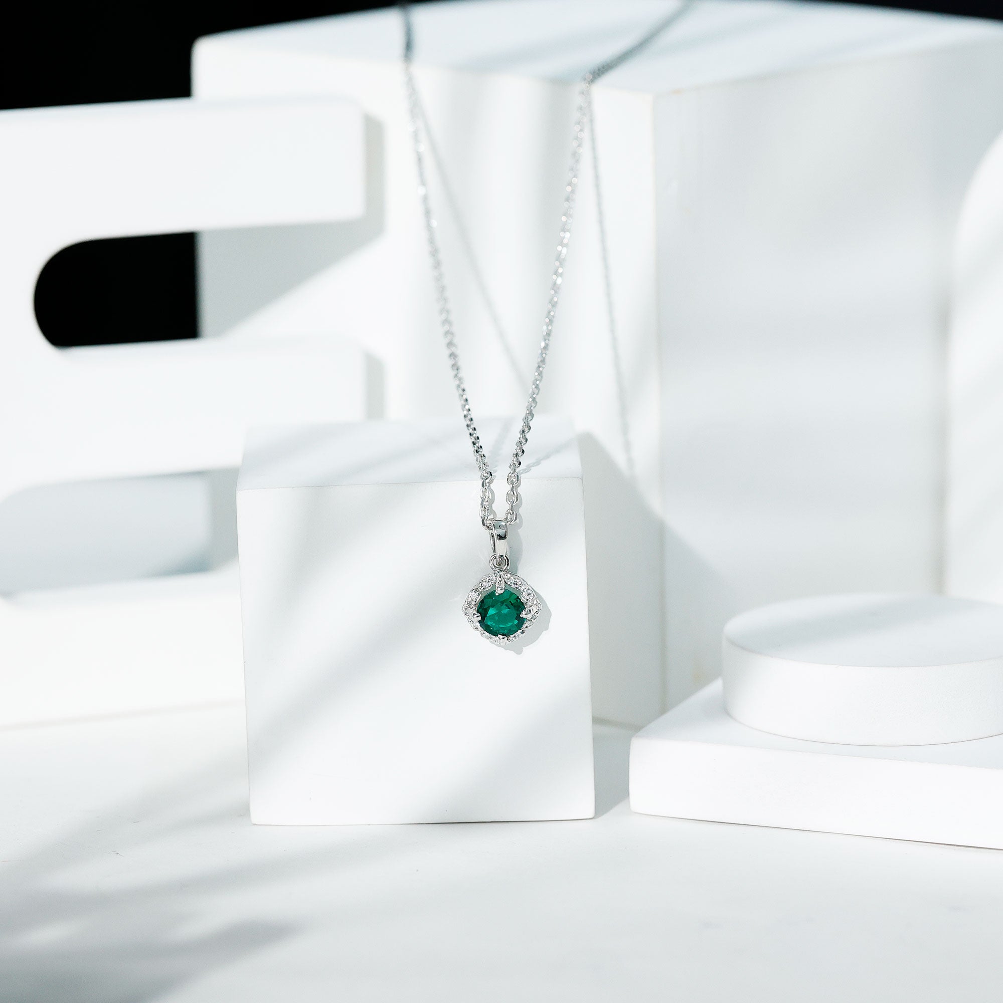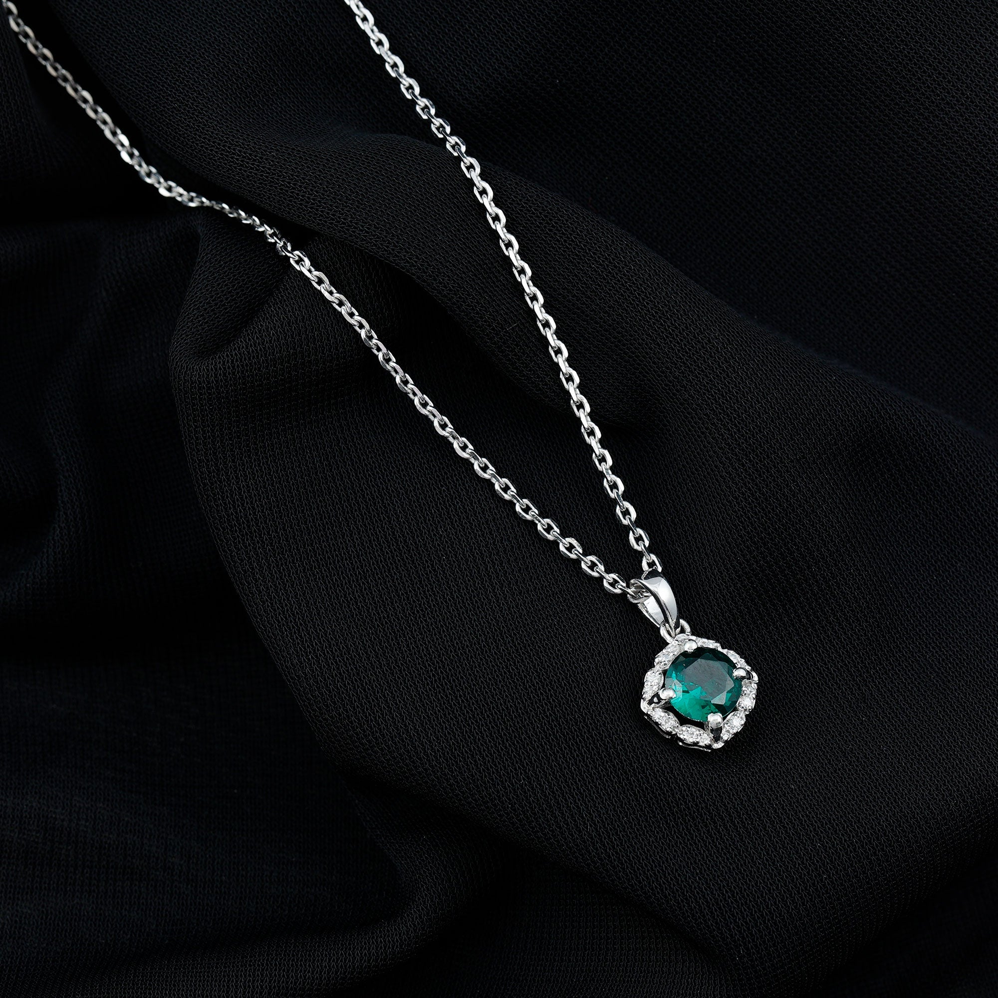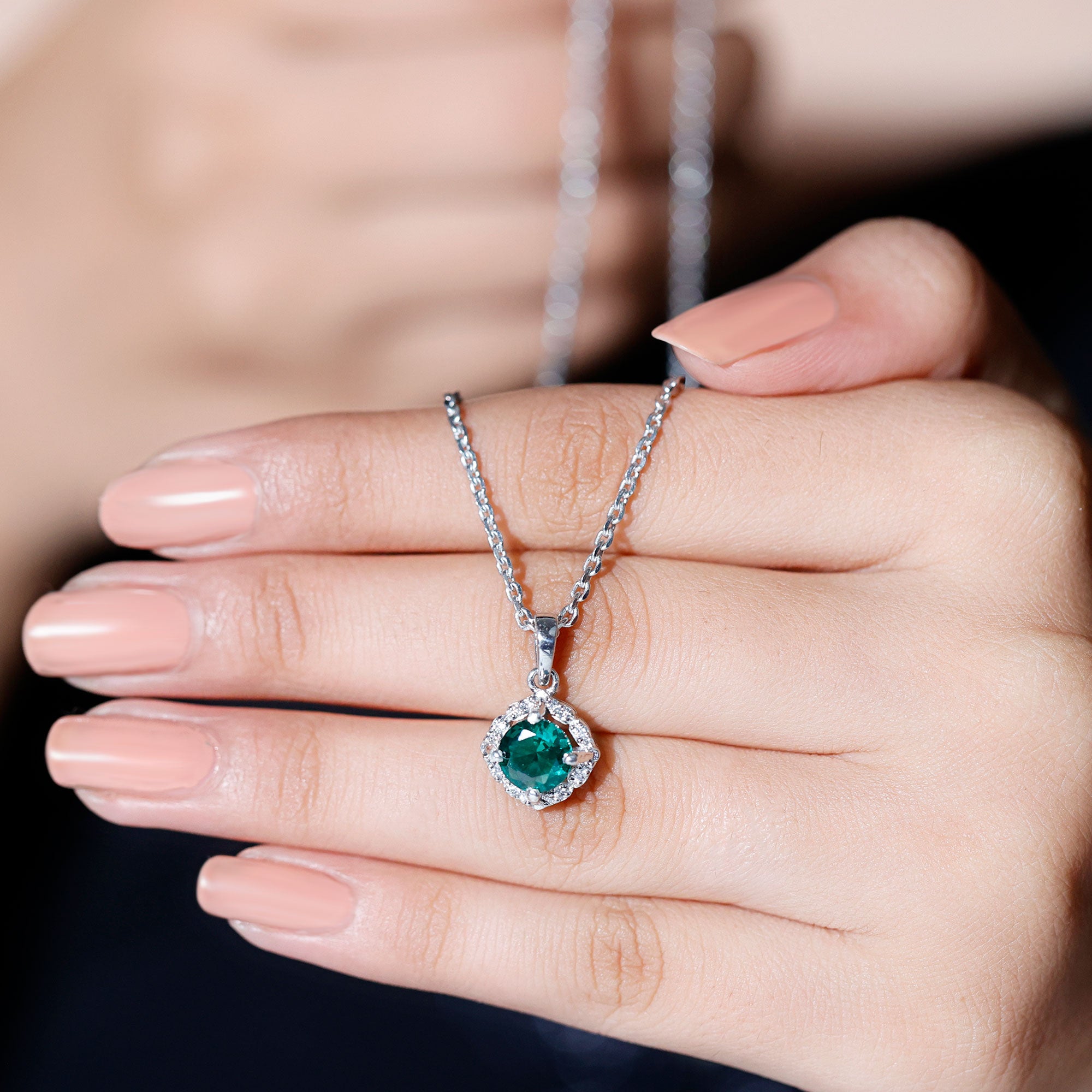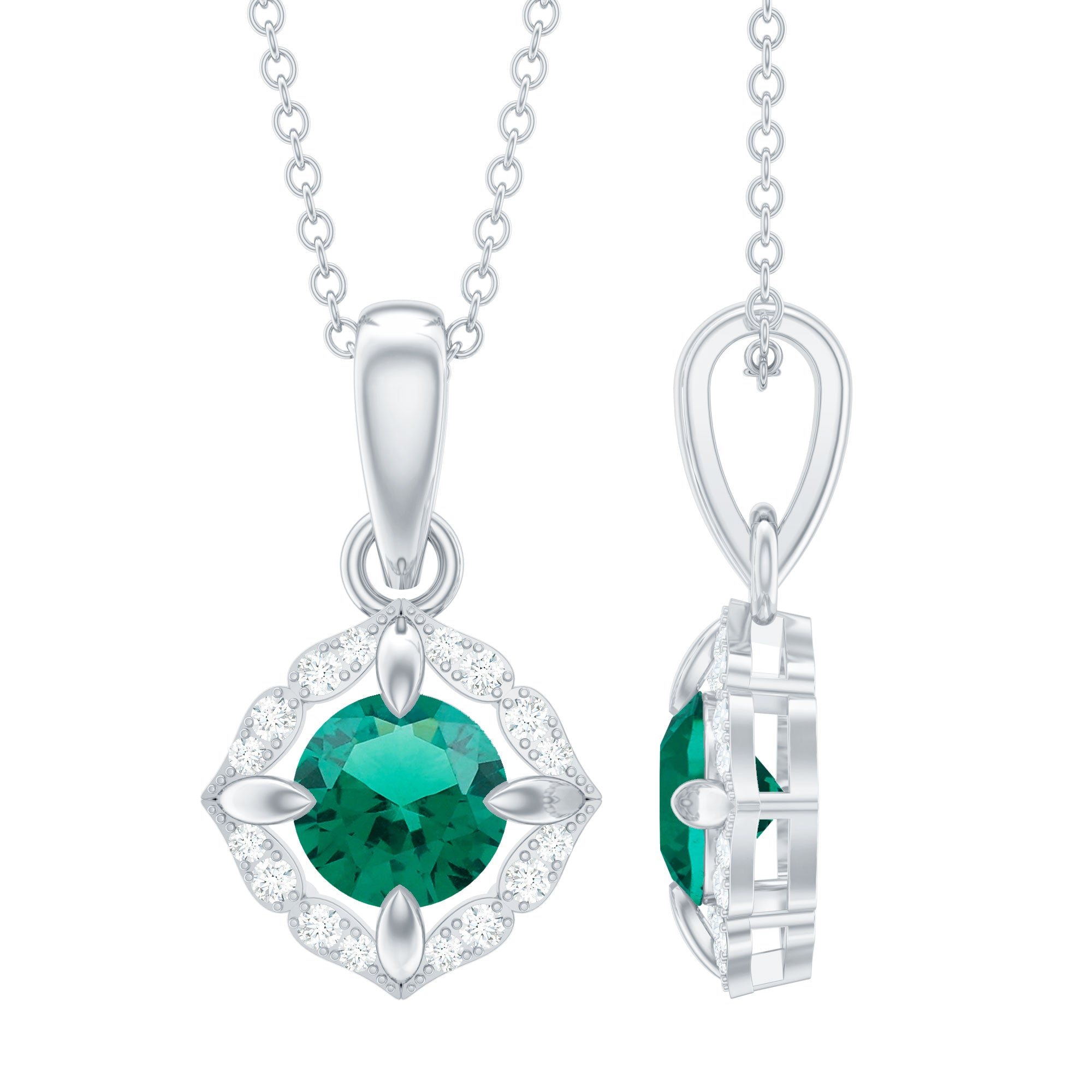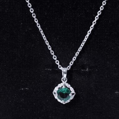 Choose a timelessly elegant look with this Emerald and Moissanite Pendant that blends classic charm with designer flair. Enjoy subtle luxury with our stylish Halo Pendant Necklace. At its center, a claw-set 6 MM lab-grown emerald shines with a rich and alluring green hue, perfectly enhanced by the sparkle of certified Moissanite stones in a designer halo. Made from 14k white gold plated sterling silver, this Designer Statement Necklace offers both a brilliant shine and long-lasting quality. Featuring AAAA quality lab emerald and D-VS1 quality Moissanite, this necklace showcases refined elegance and careful craftsmanship. Whether you are going for a casual vibe or dressing up for a special occasion, this Green Gem Necklace is the ideal representation of beauty. It hangs from a cable chain with a lobster clasp for easy length adjustments. This stunning Round Emerald Necklace is a standout piece that will always be in style. Its a must-have for any jewelry enthusiast, as a splash of green is what we need everywhere, from living room to jewelry bloom.
