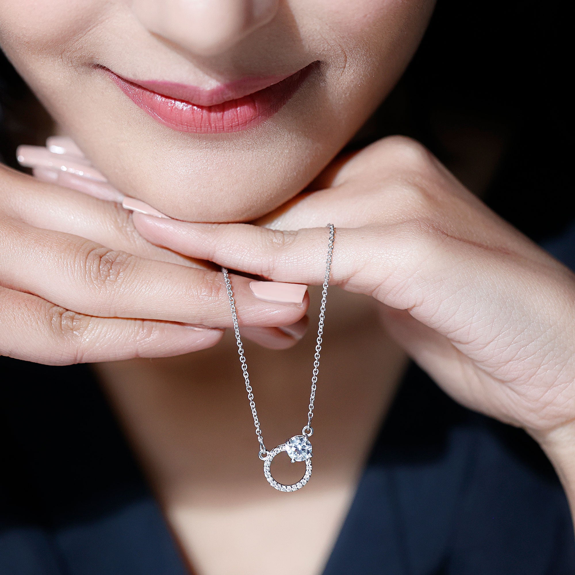 Rosec Jewels Moissanite Circle of Love Necklace is cherished not just for its elegant design but also for its representation of everlasting love. Just like the circle has no beginning or end, love is whole and infinite. Gifting this Round Moissanite Necklace to someone special beautifully expresses your feelings for them. This Circle Pendant Necklace is a sophisticated piece of jewelry, showcasing 20 meticulously hand-set small round cut Moissanite stones alongside a 6 MM Moissanite, all securely held in prong setting. This sophisticated and impressive necklace features a sleek and minimalist design. Wear this pendant on its own or layer it with additional necklace for a contemporary look, this versatile accessory can effortlessly elevate both casual and formal outfits. Whether youre looking for an eye-catching accessory for special occasions or a sophisticated addition to your everyday ensemble, this Eternity Necklace makes an excellent choice. It also serves as a thoughtful gift for anniversaries, birthdays, or just because you want to show your loved one how special they are.