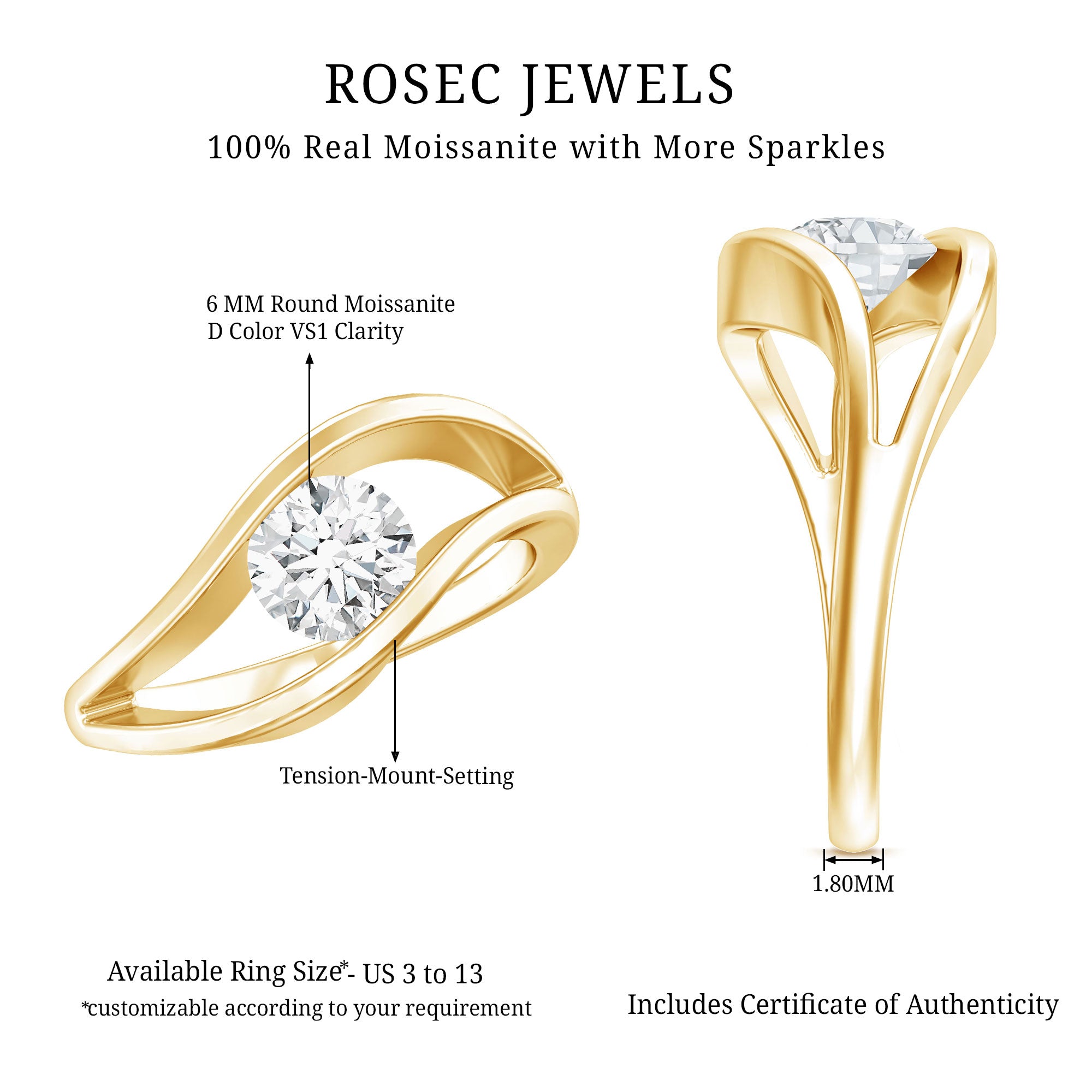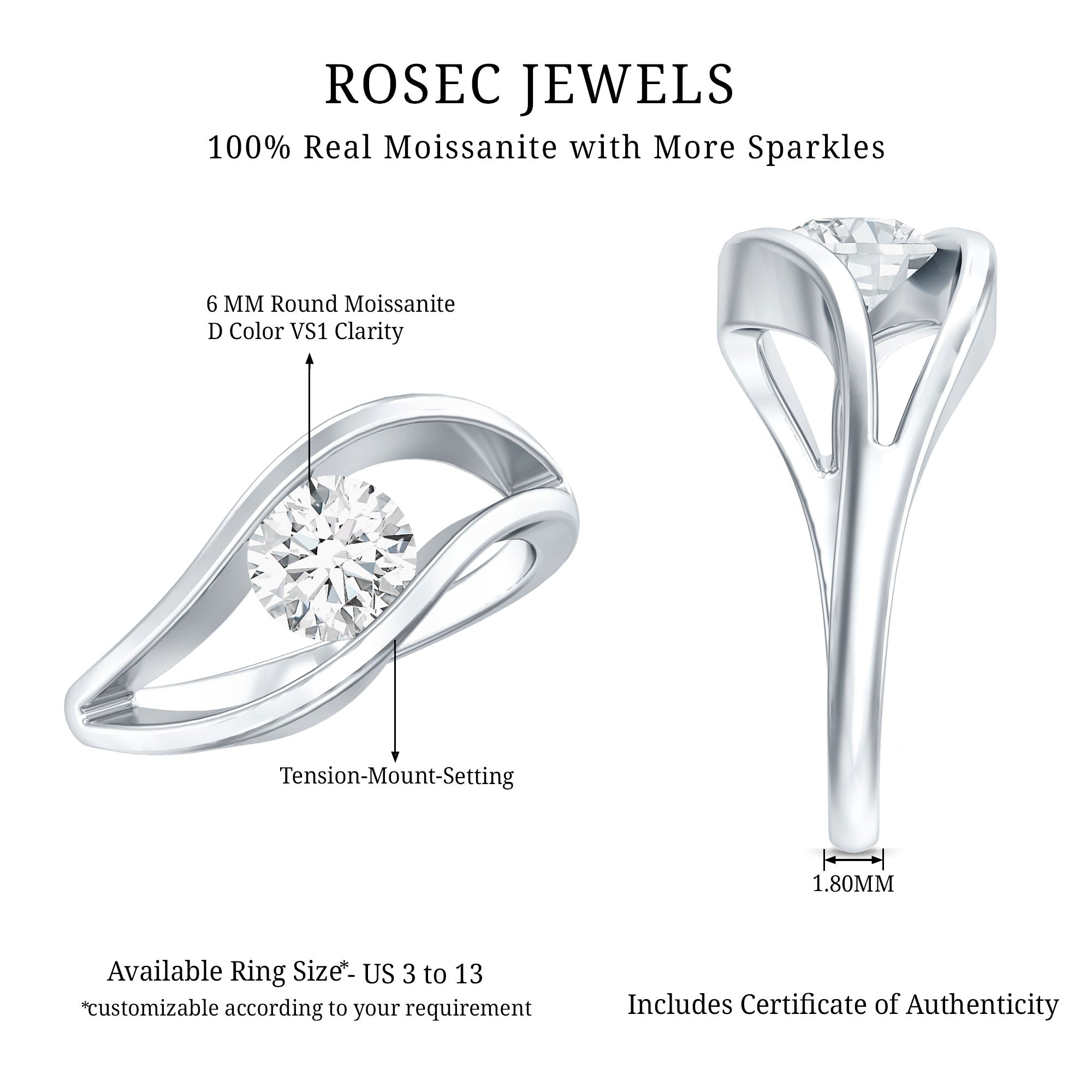 Make a lasting impression with this Moissanite Solitaire Ring. It features a 6 MM Round Shape Moissanite placed elegantly in Tension Mount Setting, on a Curved Shank. This Promise Engagement Ring beholds the shine of D-VS1 Quality Moissanite. Make your commitment to love prominent with this Round Moissanite Ring which dazzles with a timeless shine. Get this Moissanite Ring for your special one and witness a priceless expression. The ring will be delivered to you in the premium quality jewelry box for storage.