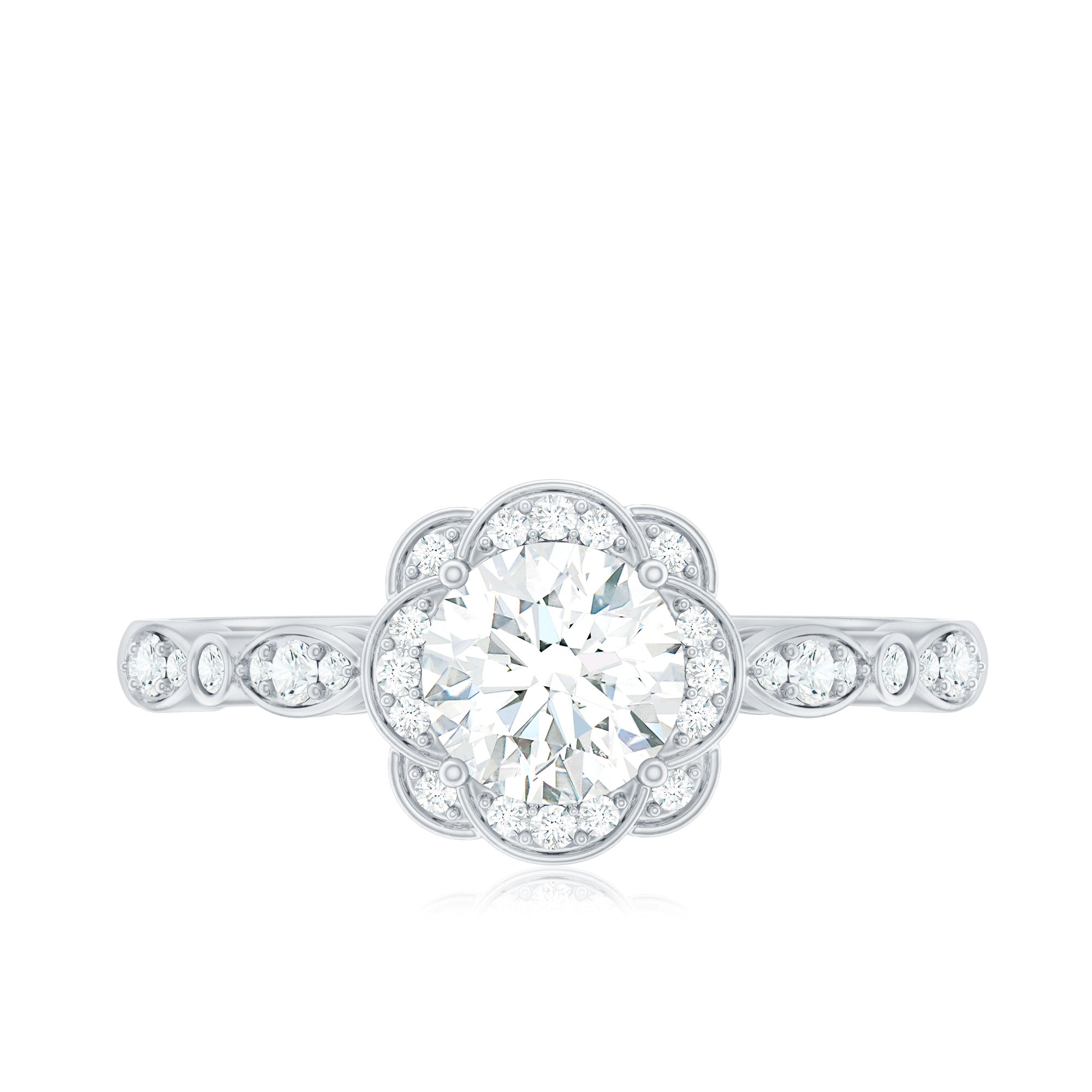 Our Diamond Flower Engagement Ring is a beautiful blend of nature-inspired elegance and modern craftsmanship. This Floral Ring showcases a 6 MM round cut EF-VS quality diamond (lab grown) set in prong setting and surrounded by a floral halo of round cut gemstones. The additional diamonds are set on the scalloped pattern band, giving it a vintage-inspired look. This Diamond Ring for Women comes with a certificate of authenticity, the unique design enhances the beauty of the gemstones, creating a timeless piece that effortlessly complements any attire. This Statement Engagement Ring reflects the commitment to quality and sustainability synonymous with Rosec Jewels, making it a symbol of refined sophistication.