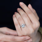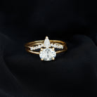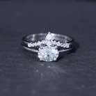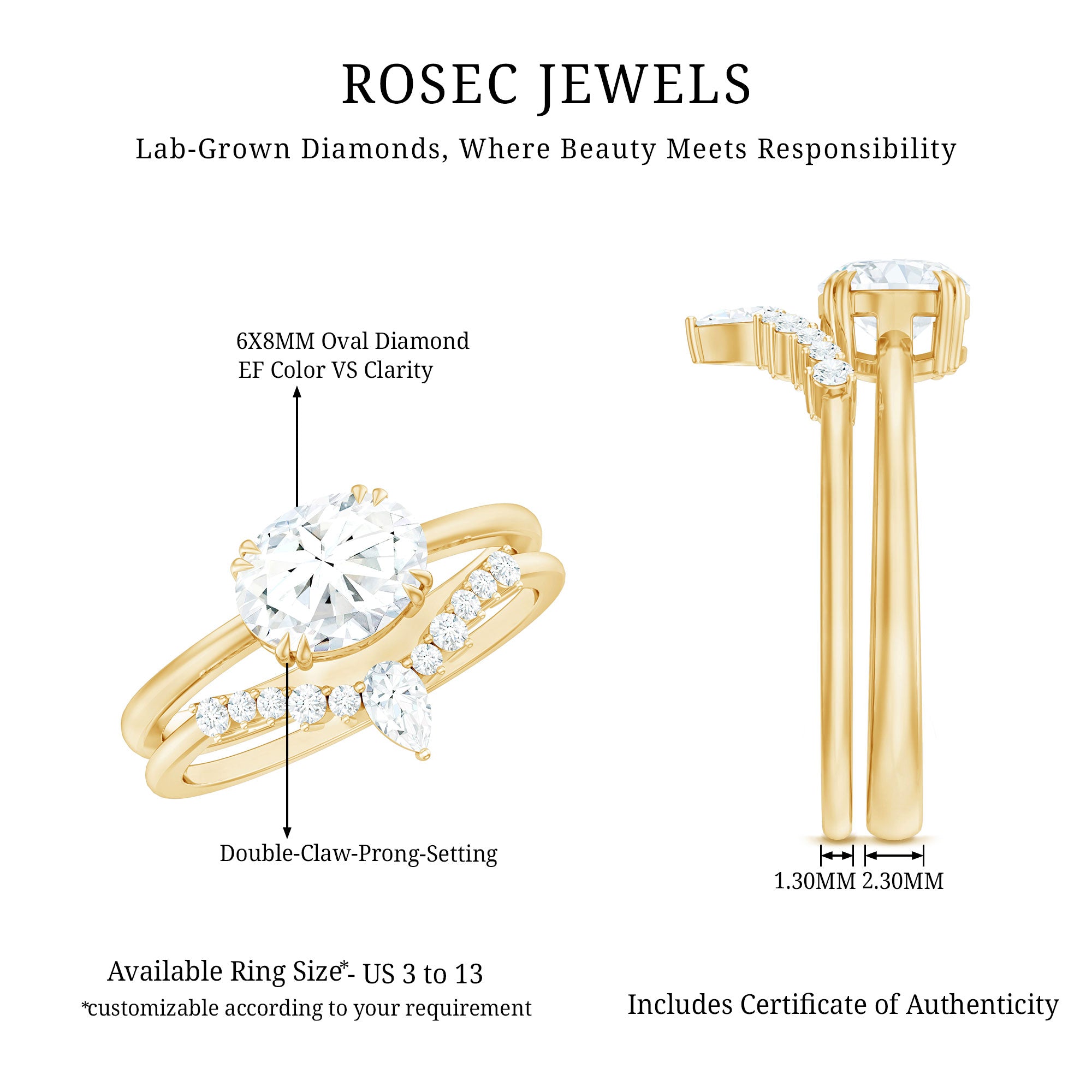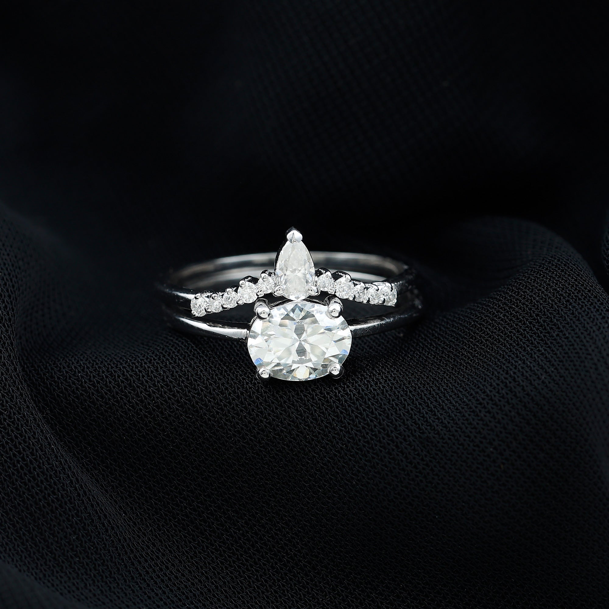 May your lifetime memory remain till eternity with this Diamond Wedding Ring Set which showcases unconditional love and unmatched sparkle. This stunning Bridal Ring Set is the epitome of elegance, featuring a breathtaking Solitaire Ring paired with a perfectly matching curved enhancer ring. The Engagement Ring showcases a 6X8 MM oval shaped lab made diamond of EF-VS quality securely set in a double claw prong setting in east-west style. Complementing the ring is a gracefully designed Chevron-style stackable ring, adorned with a dazzling combination of pear and round shaped diamonds in prong setting. This is an ideal Engagement Ring with Wedding Band for your lady as this duo symbolizes the unbreakable bond and eternal commitment you share.