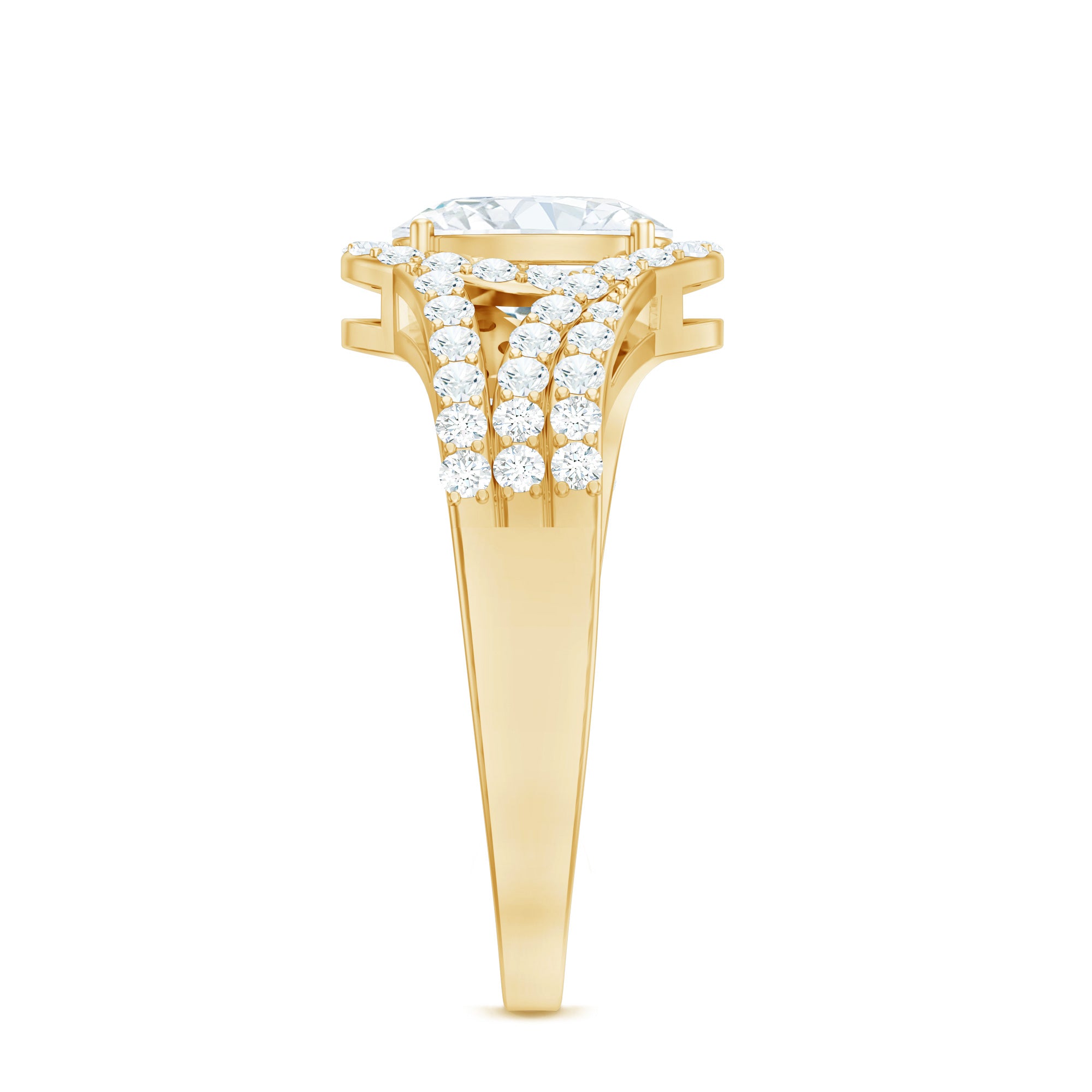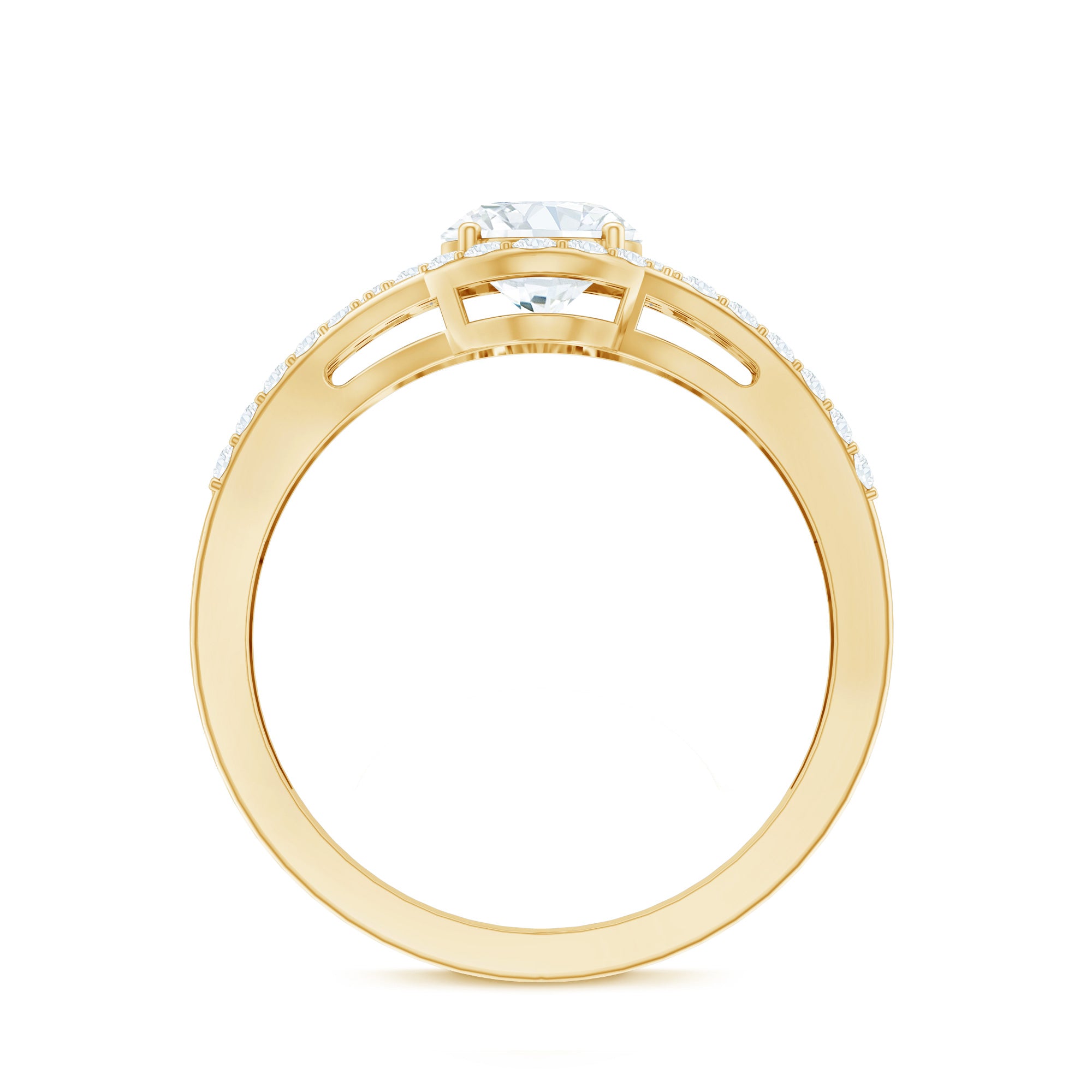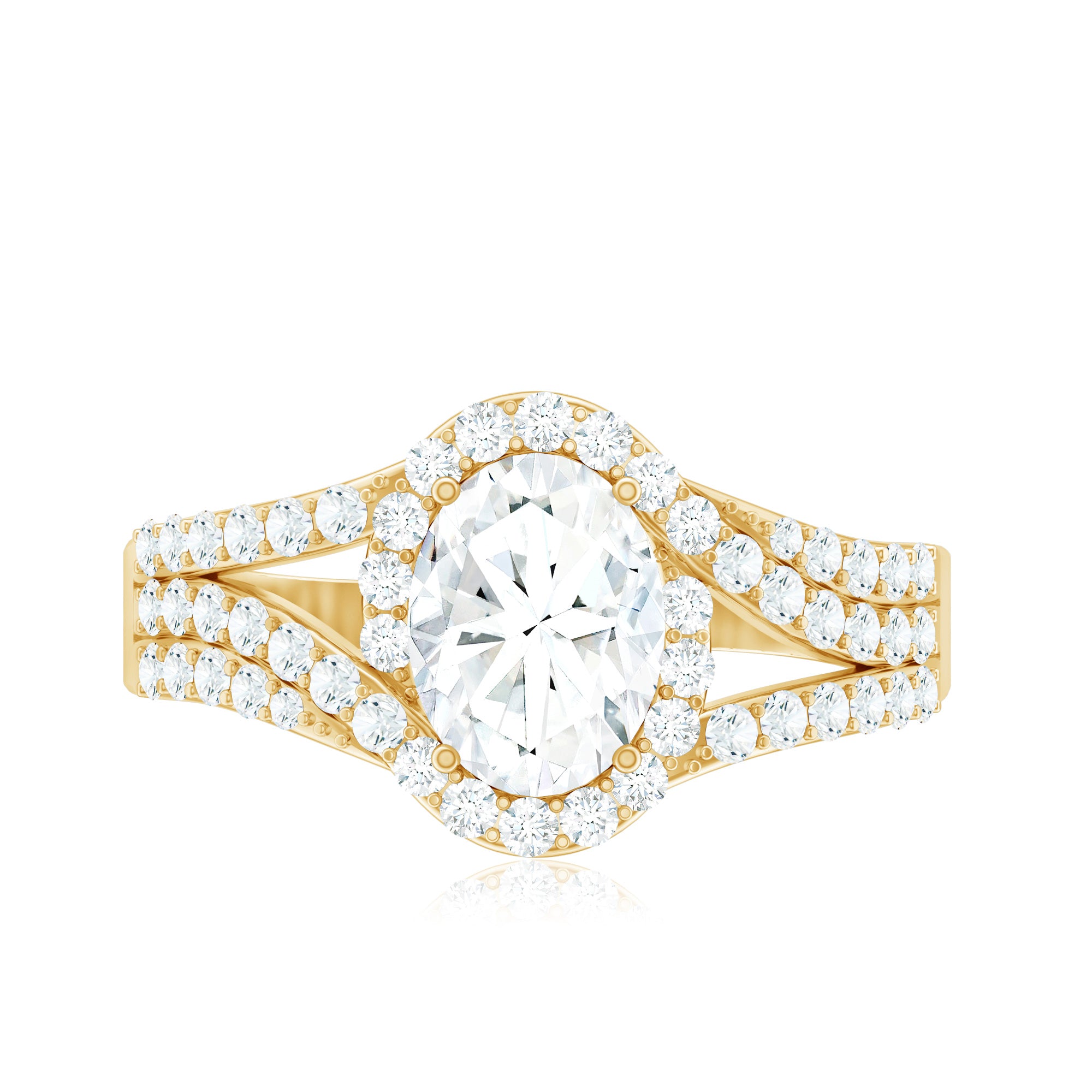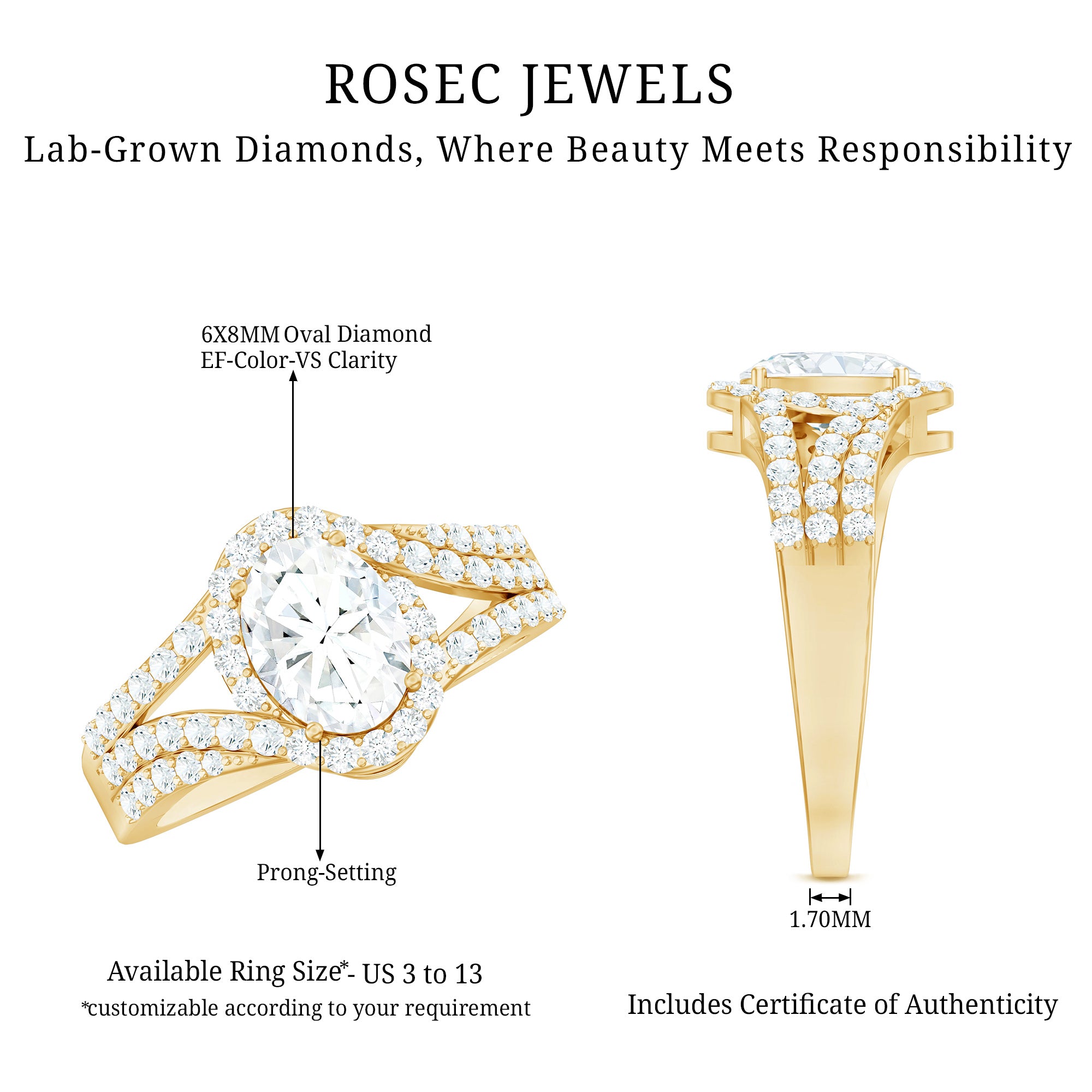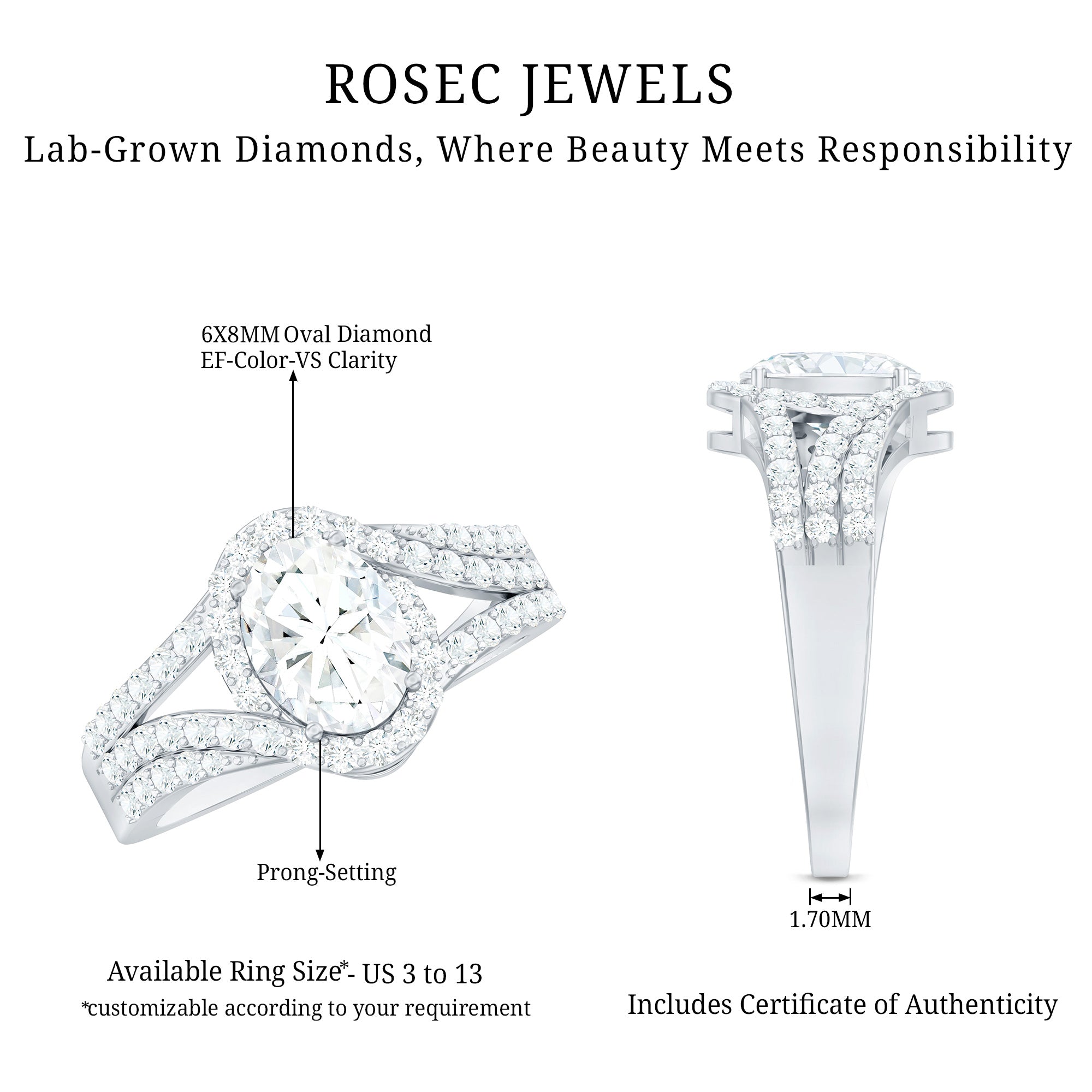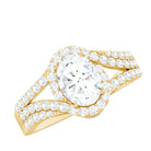 Make her heart skip a beat with the stunning craftsmanship of this Oval Diamond Engagement Ring. The center features a brilliant 6X8 MM oval shaped EF-VS quality diamond set in prong setting while the smaller diamonds line the split shank and surround the focal stone, giving this Halo Engagement Ring an eye catching look and adding the perfect sparkle. The diamonds in this Split Shank Ring are lab-grown which means they are ethically made, responsibly sourced and provide you the same sparkle and durability as the mined ones but at a more affordable price tag. Mark the moment of love with this masterpiece and let her cherish it forever.