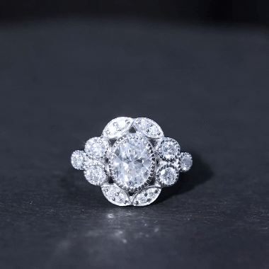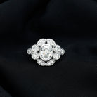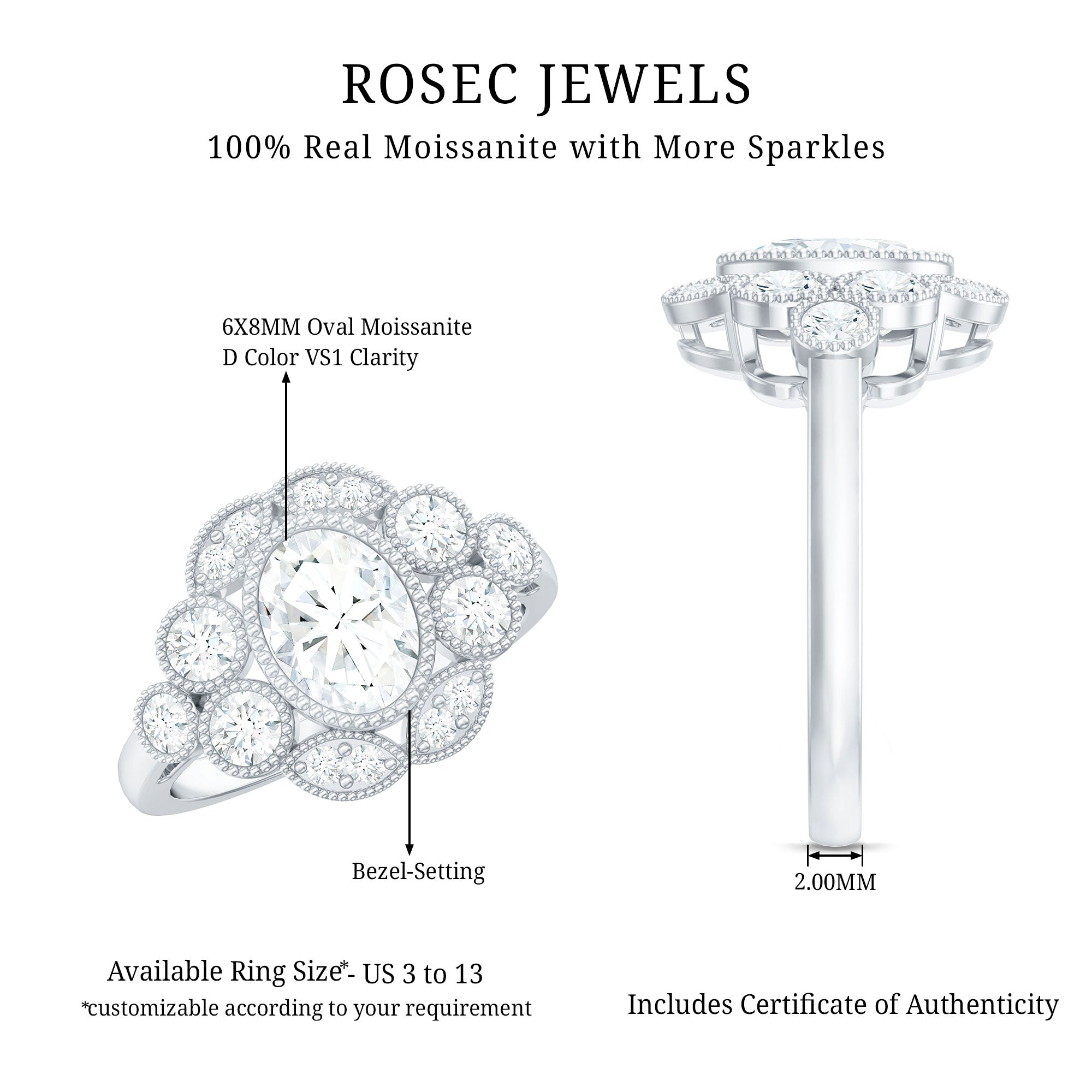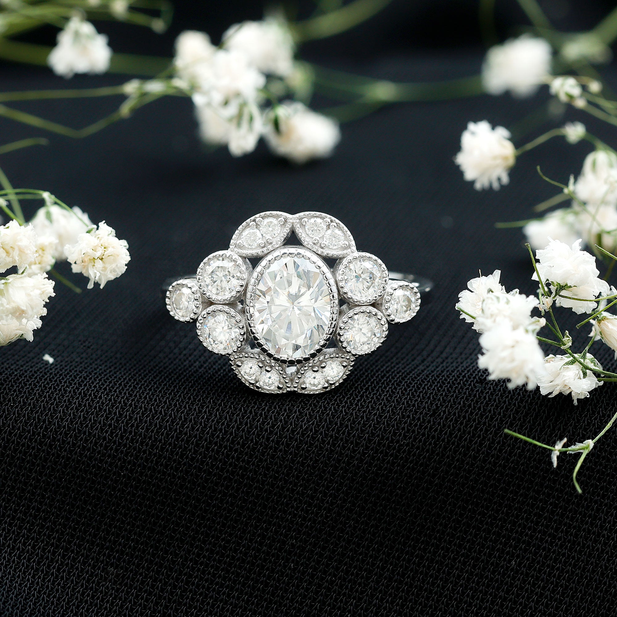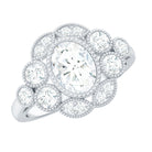 Elevate your Style statement with this Moissanite Engagement Ring which is crafted with 14K White Gold Plated Silver. This Statement Ring features a 6X8 MM Oval Shape Moissanite secured in Bezel Setting. The center stone is adorned with a halo of round shape Moissanite embellished with beaded detailing at the top of the ring. Present this Cluster Ring to your lady love on engagement and complete the celebration. The ring holds the adorable shine of D-VS1 quality Moissanite which makes it perfect to make her stun on the big day. This Statement Engagement Ring will adorn her fingers beautifully and always remind her of your love.