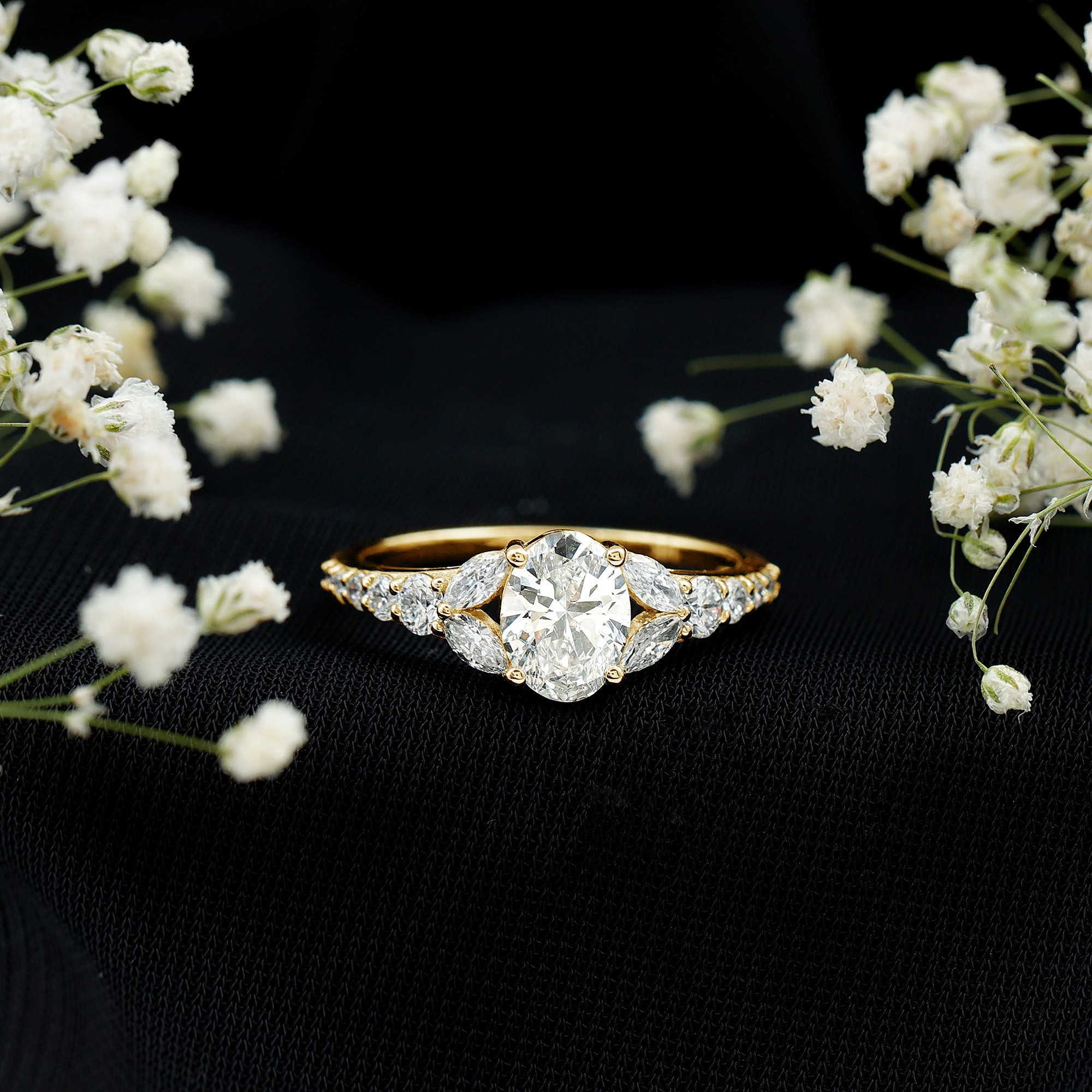 Celebrate every moment of your love story with this classic Diamond Ring. This Designer Engagement Ring is more than just a piece of jewelry, its a reflection of your unconditional love. Features 6X8MM oval cut lab made diamonds (EF-VS Quality), set in a secure prong setting with marquise shaped diamonds on both sides of the center stone. The graduated side stones are placed over the band and provide sparkle from every side. Designed with timeless elegance, the Oval Cut Diamond Ring is perfect for celebrating a bond that will last forever. Whether you are starting a new chapter together or looking for a way to express your commitment to your lady love, this Classic Ring will forever remind you of the love you share.