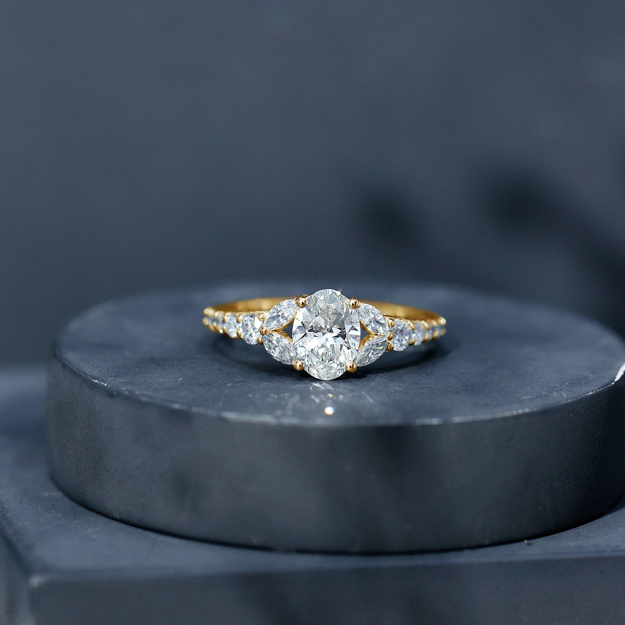 Celebrate every moment of your love story with this classic Diamond Ring. This Designer Engagement Ring is more than just a piece of jewelry, its a reflection of your unconditional love. Features 6X8MM oval cut lab made diamonds (EF-VS Quality), set in a secure prong setting with marquise shaped diamonds on both sides of the center stone. The graduated side stones are placed over the band and provide sparkle from every side. Designed with timeless elegance, the Oval Cut Diamond Ring is perfect for celebrating a bond that will last forever. Whether you are starting a new chapter together or looking for a way to express your commitment to your lady love, this Classic Ring will forever remind you of the love you share.