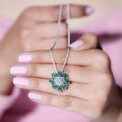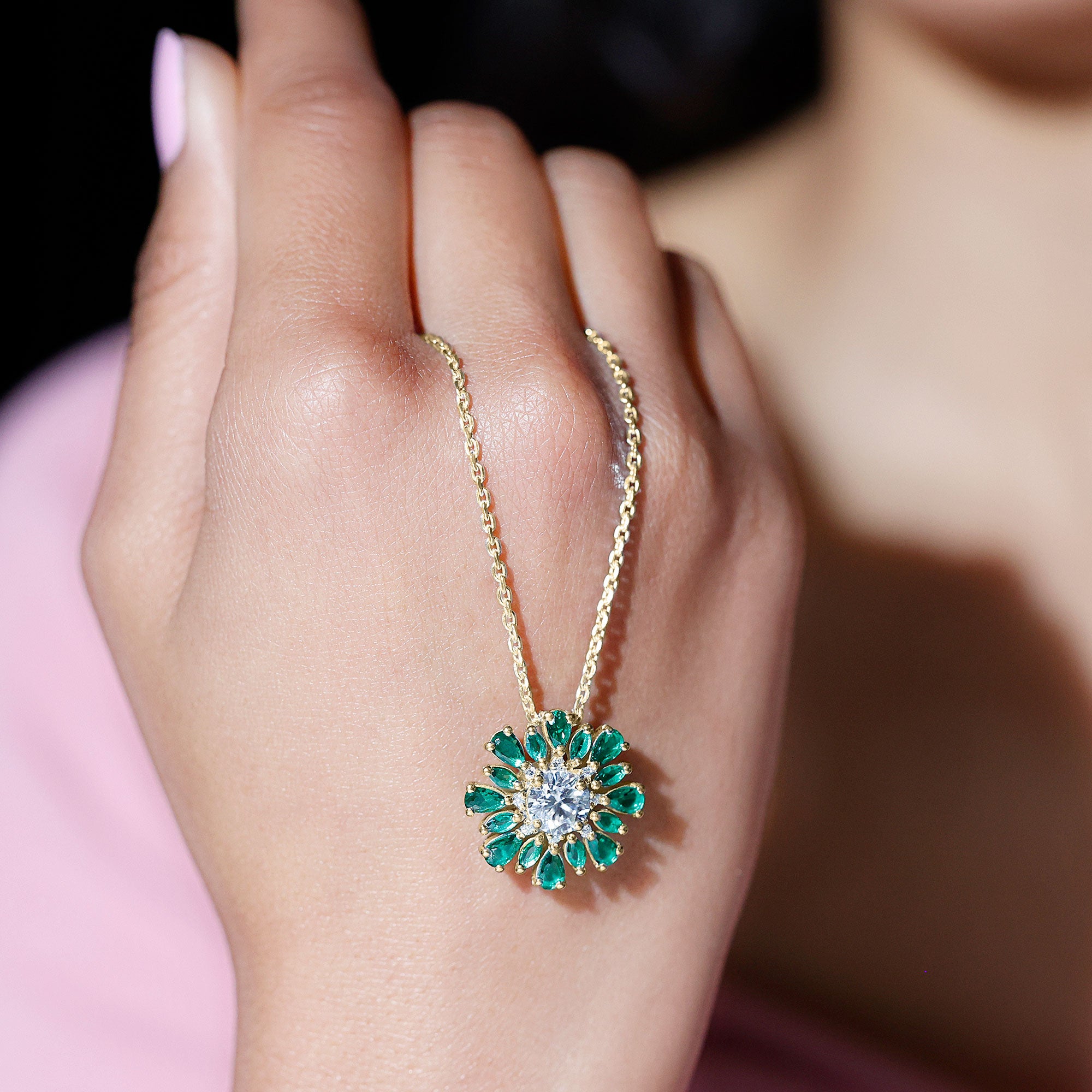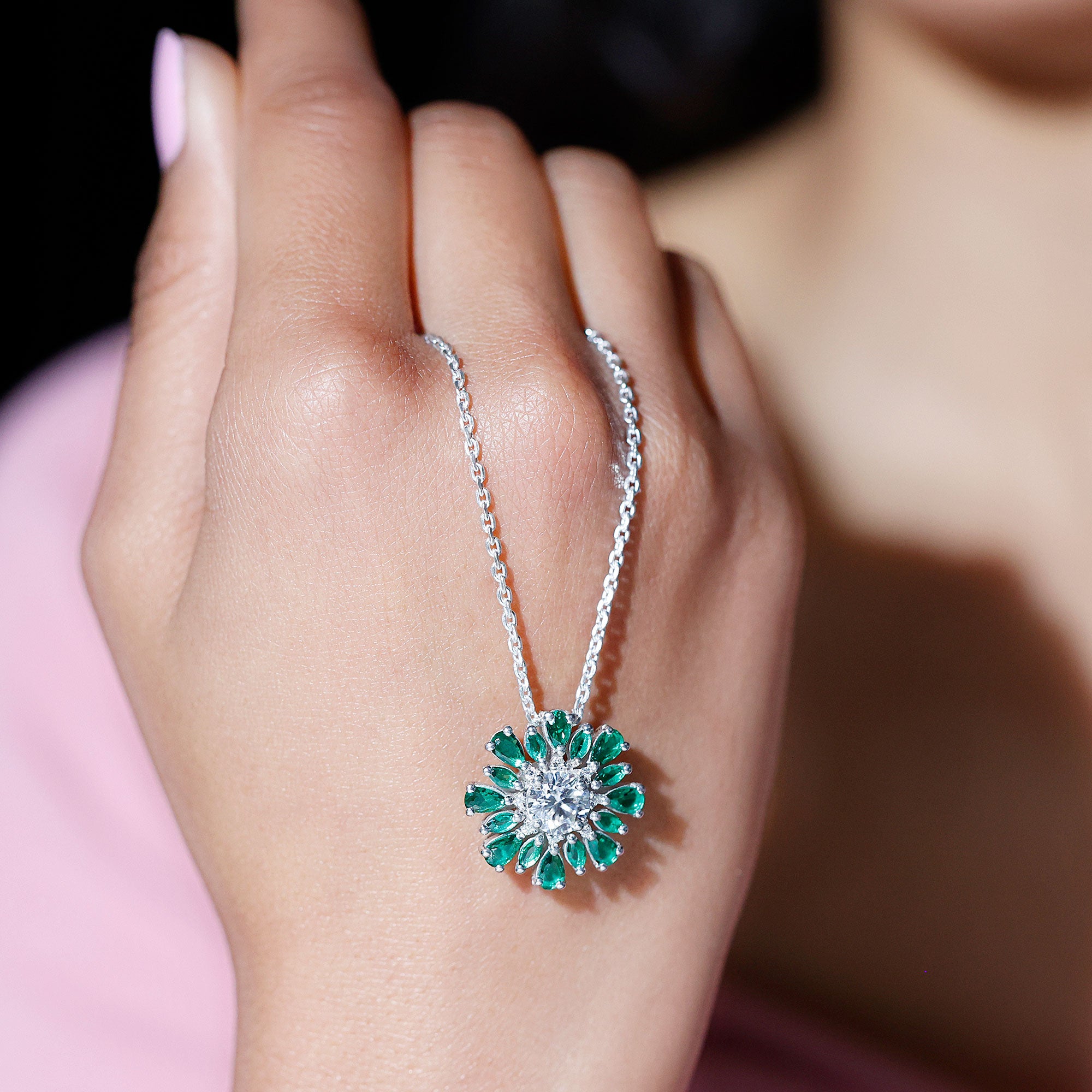This beautiful Diamond Floral Necklace boasts a mesmerizing design that highlights the natural allure of the emerald stone, guaranteed to draw everyones attention. It features a 7 MM Round Shape diamond set in prongs, along with a unique combination of pear and marquise shape emeralds and delicate diamonds that enhance the charm of this Cocktail Necklace. Its truly the ideal accessory for your upcoming party. This Diamond and Emerald Necklace is available in a variety of metal color options so you can choose whatever suits your unique style and make it a truly personalized piece. As an April birthstone diamonds are known to enhance strength, clarity, and everlasting love. This pendant makes for an ideal gift for those born in April, symbolizing their inner radiance and refined grace.