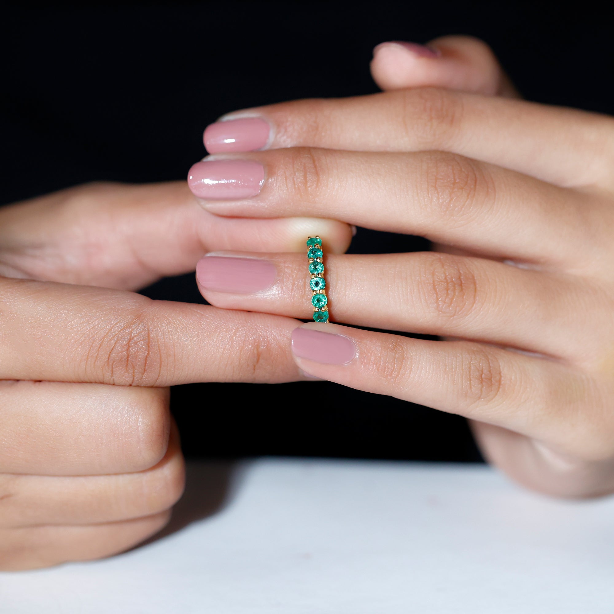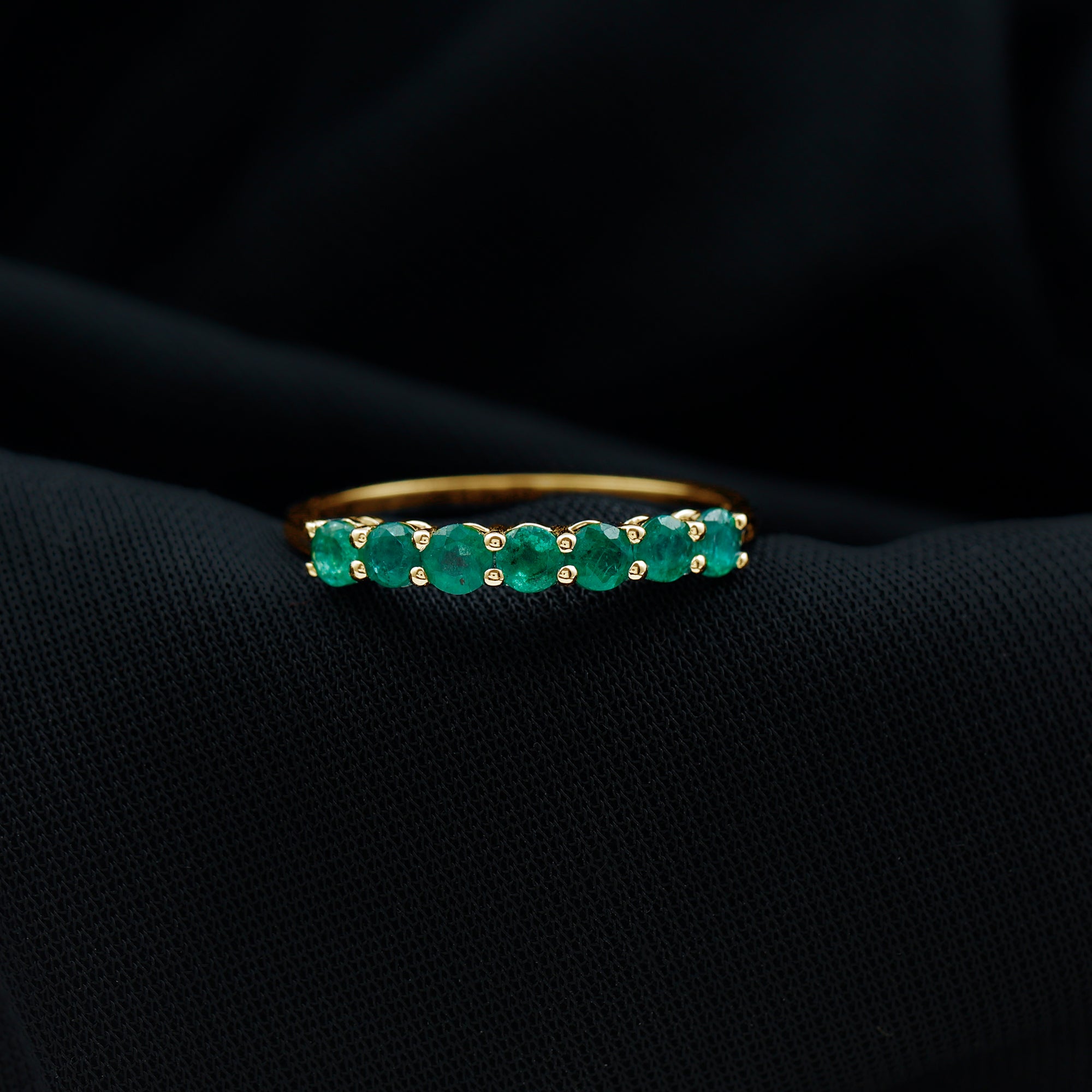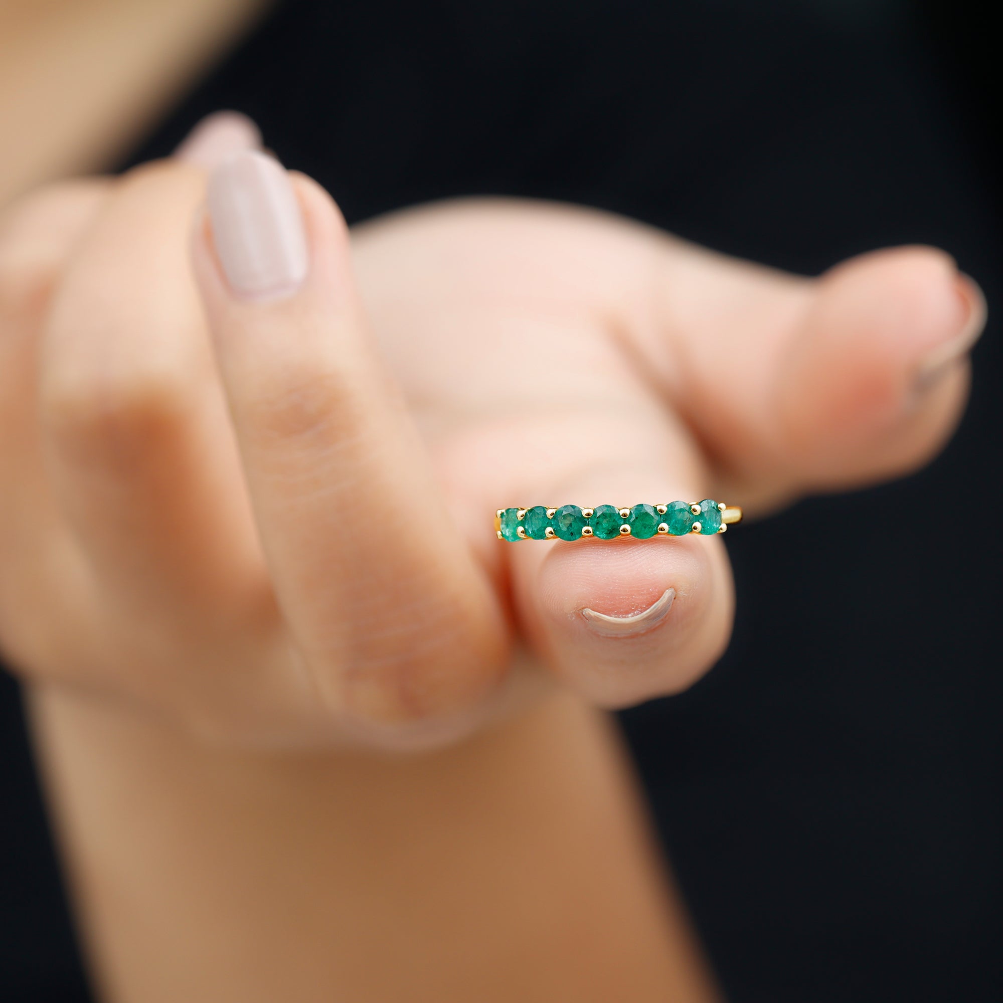 An Extraordinary and Elegant Eternity Ring adorned with Round shaped Emerald Gemstones set in Prong setting. The Ring features an array of round shapes of Emerald which creates a classic alluring reflection that represents prosperity in the relationship. This Half Eternity ring can be styled in both ways solely or as a basis of the stack. This 7 Stone Ring represents the 7 vows of love and embraces the purity and loyalty of the relationship. This May Birthstone Ring features the unmatchable shine of AAA quality Emerald that dazzles the celebration.