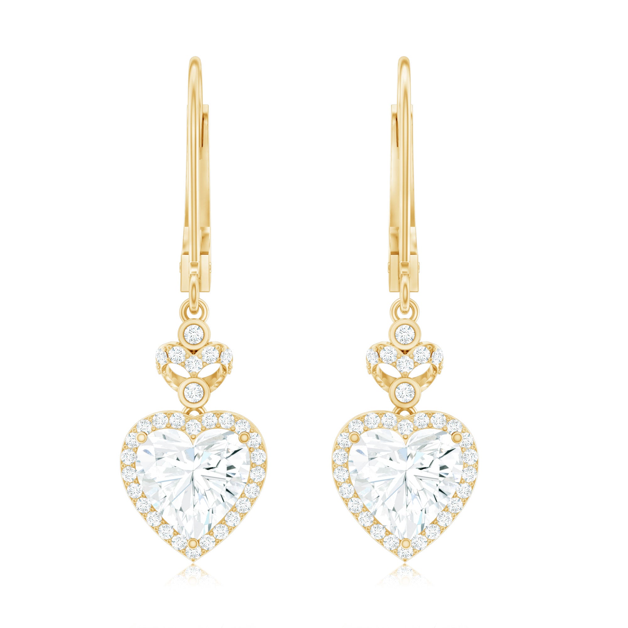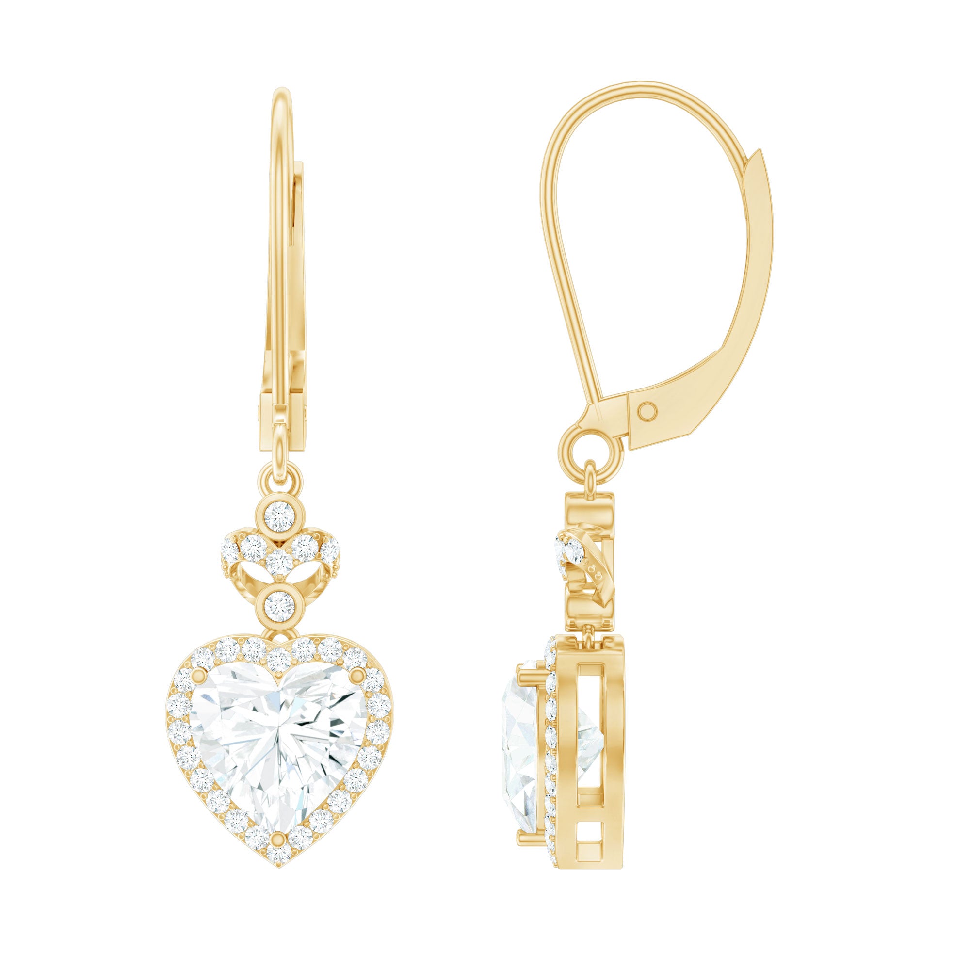 Celebrate love and romance with these breathtaking Heart Drop Earrings, ideal for a bride on her special day. The design features a captivating prong set 7MM heart shape diamond (lab created) as a centerpiece, surrounded by a delicate round cut diamond halo. Above the main stone, two dainty bezel set diamonds are set with an open heart motif adorned with small stones. The drop style allows the Diamond Heart Earrings to sway beautifully with every movement, making them a mesmerizing addition to any jewelry collection. Handcrafted with precision, the secure lever back closure ensures a comfortable and snug fit, allowing you to wear them effortlessly throughout the day. They are ideal as Bridal Earrings or a thoughtful Anniversary Gift for Her.