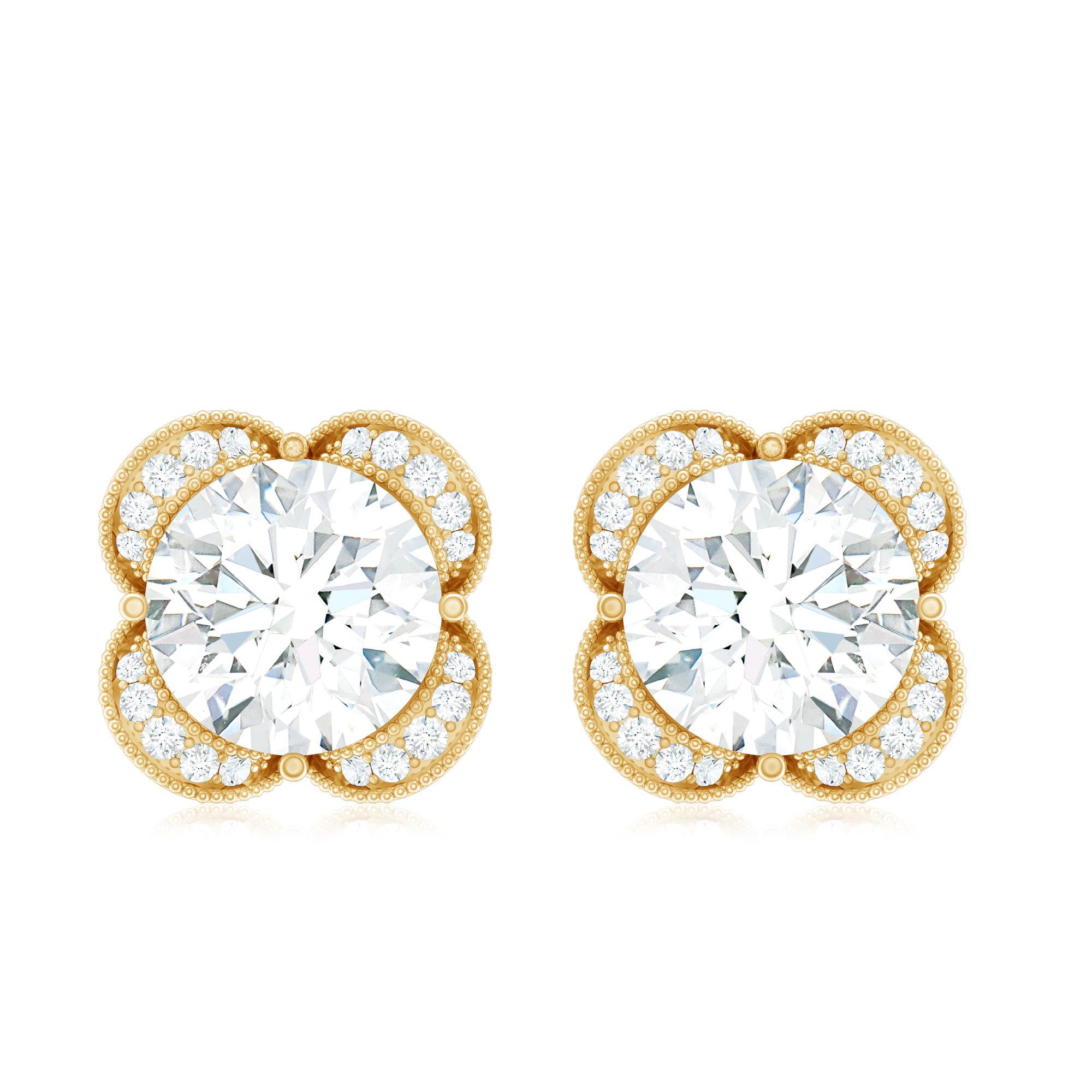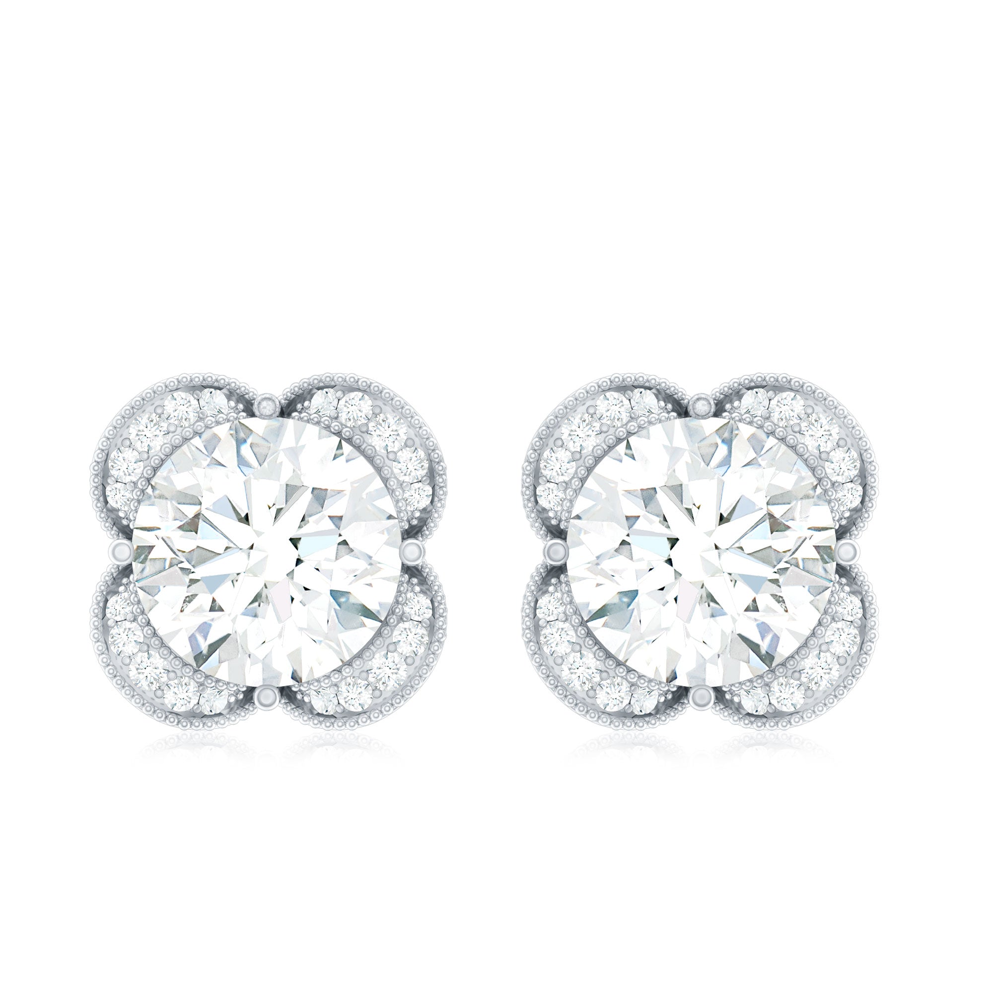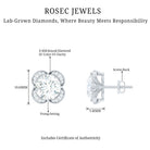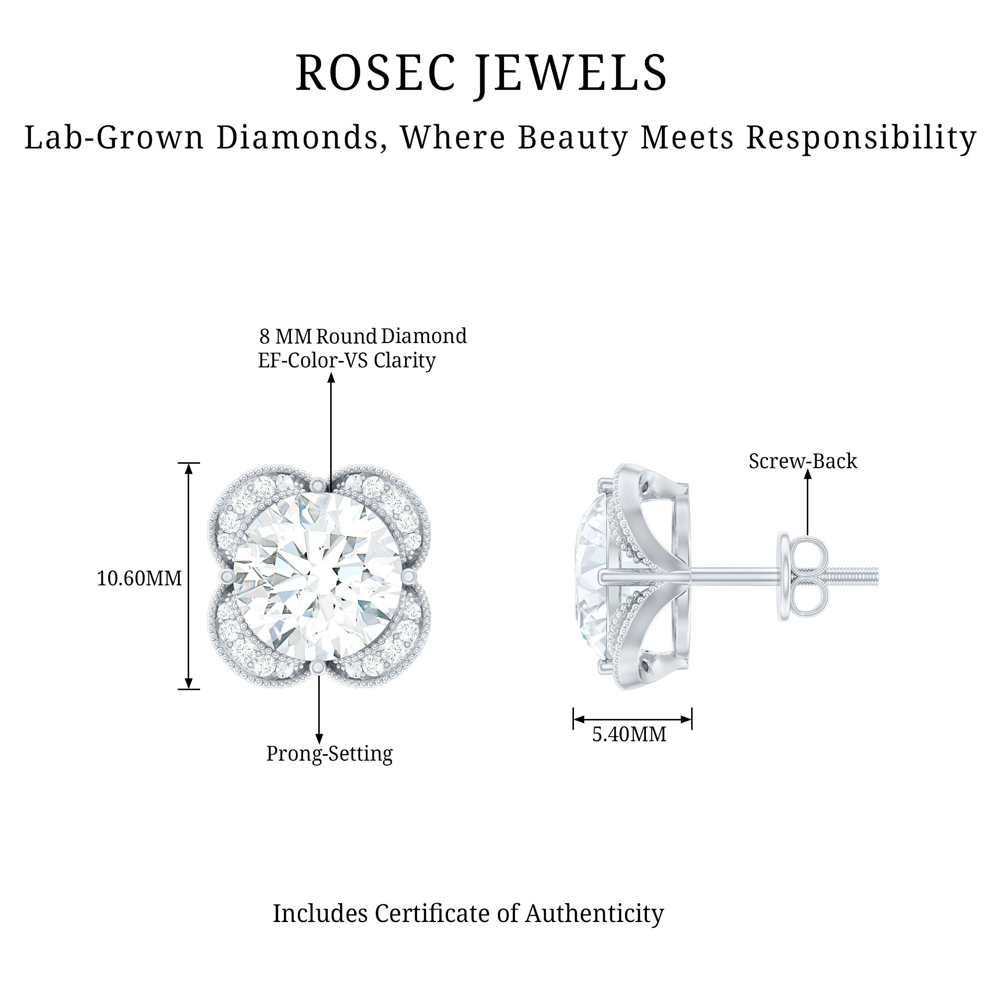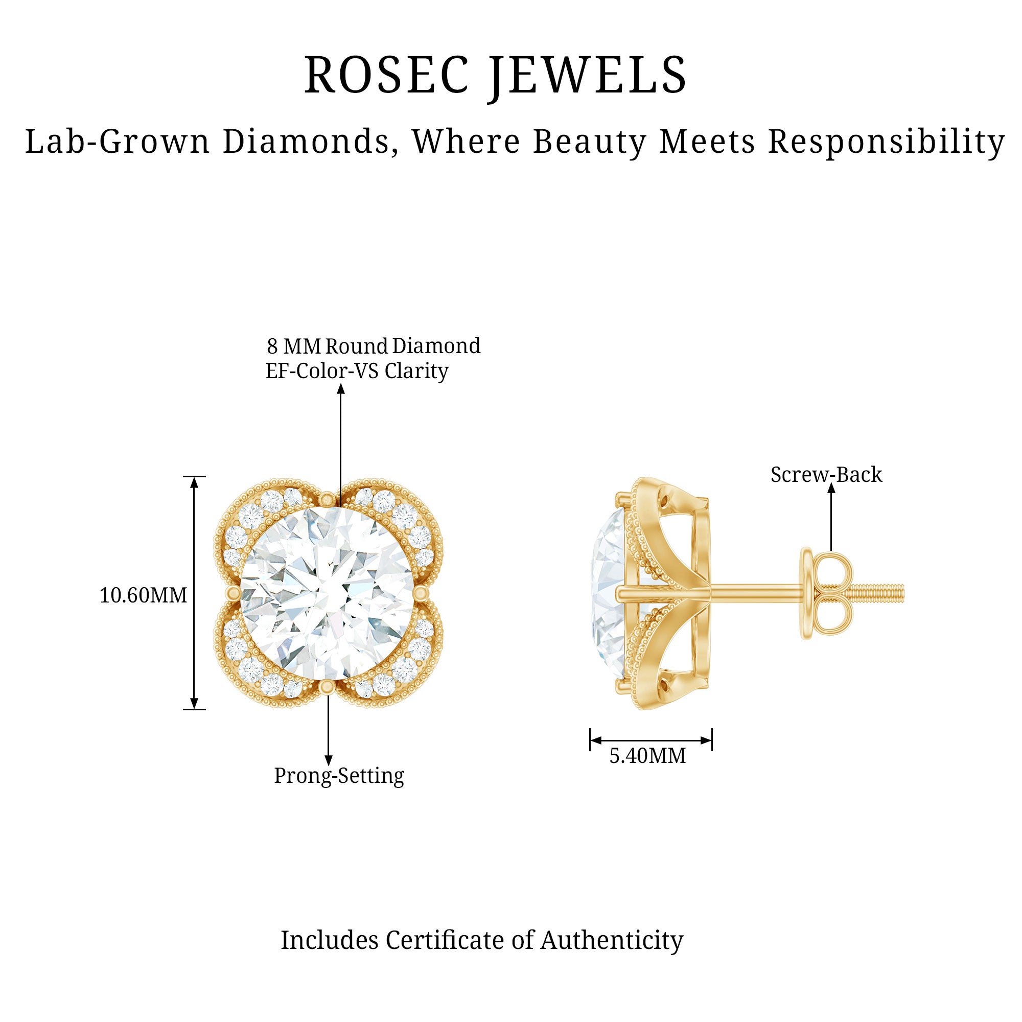 Do not settle for the ordinary when you can shine effortlessly. These exquisite Diamond Flower Earrings are designed to compliment your elegance. At the heart of each earring lies a brilliant 8 MM round cut unnatural diamond of EF-VS quality. Surrounding the centerpiece are four delicately crafted petal like motifs, each adorned with a collection of smaller diamonds and bordered with fine beaded detailing to add a vintage inspired charm. These Floral Stud Earrings feature a secure screw back closure, ensuring both comfort and security. Made with ethically sourced lab made gemstones, these Diamond Studs offer the beauty of natural stones with a sustainable touch.