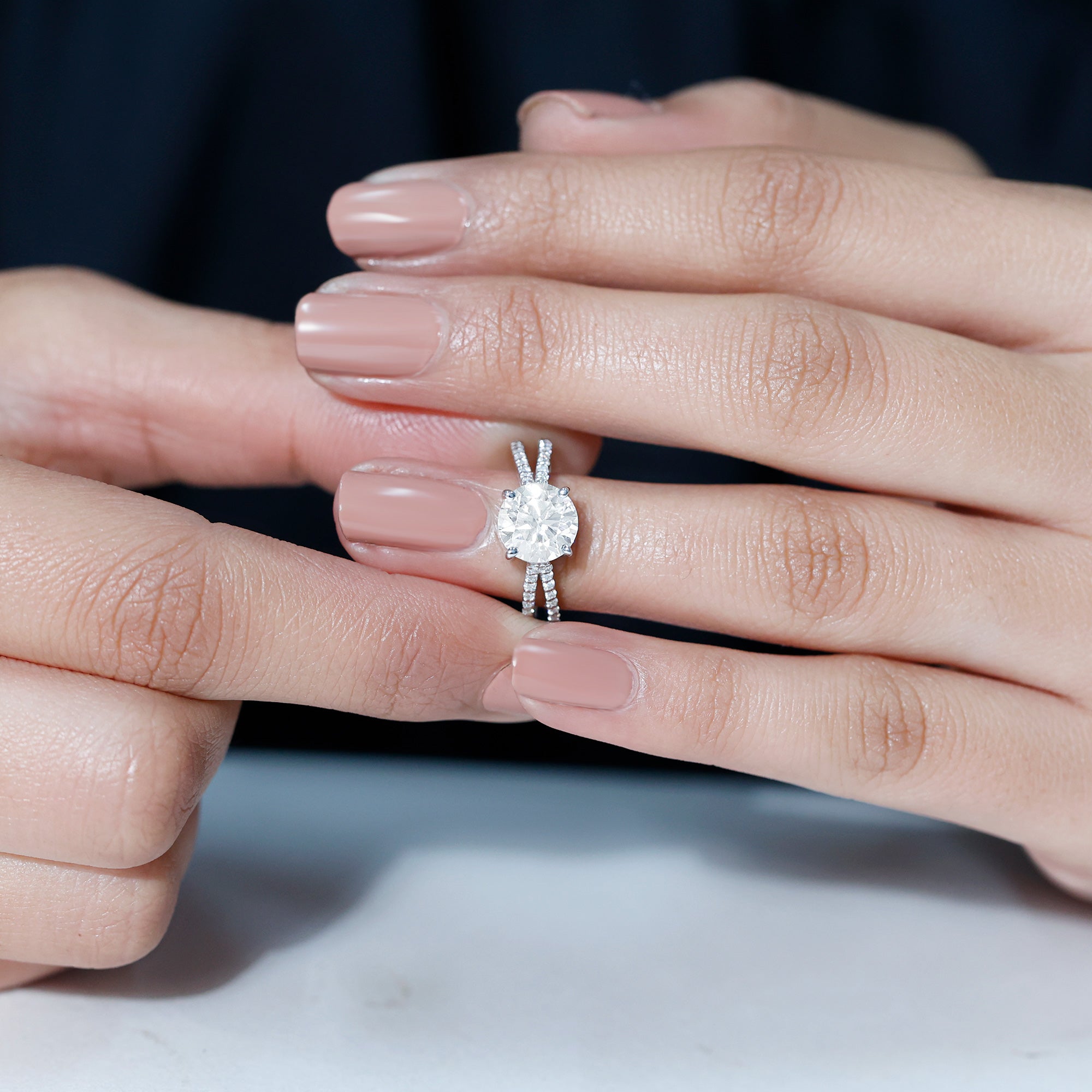 Your search for the Best Engagement Ring ends here. This stunning 2 Carat Engagement Ring features a dazzling 8 MM round shaped lab grown diamond of EF-VS quality set in prong setting at its center. Below the center stone, two round shaped diamond studded strands merge into one, creating a modern Split Shank. This certified Diamond Solitaire Ring is an absolute showstopper that will make your special day unforgettable, and the gemstone will catch everyones eye and leave them wondering where you got such a stunning piece. Our Round Cut Diamond Ring comes in the appropriate packaging ensuring it is ready for presenting upon arrival.