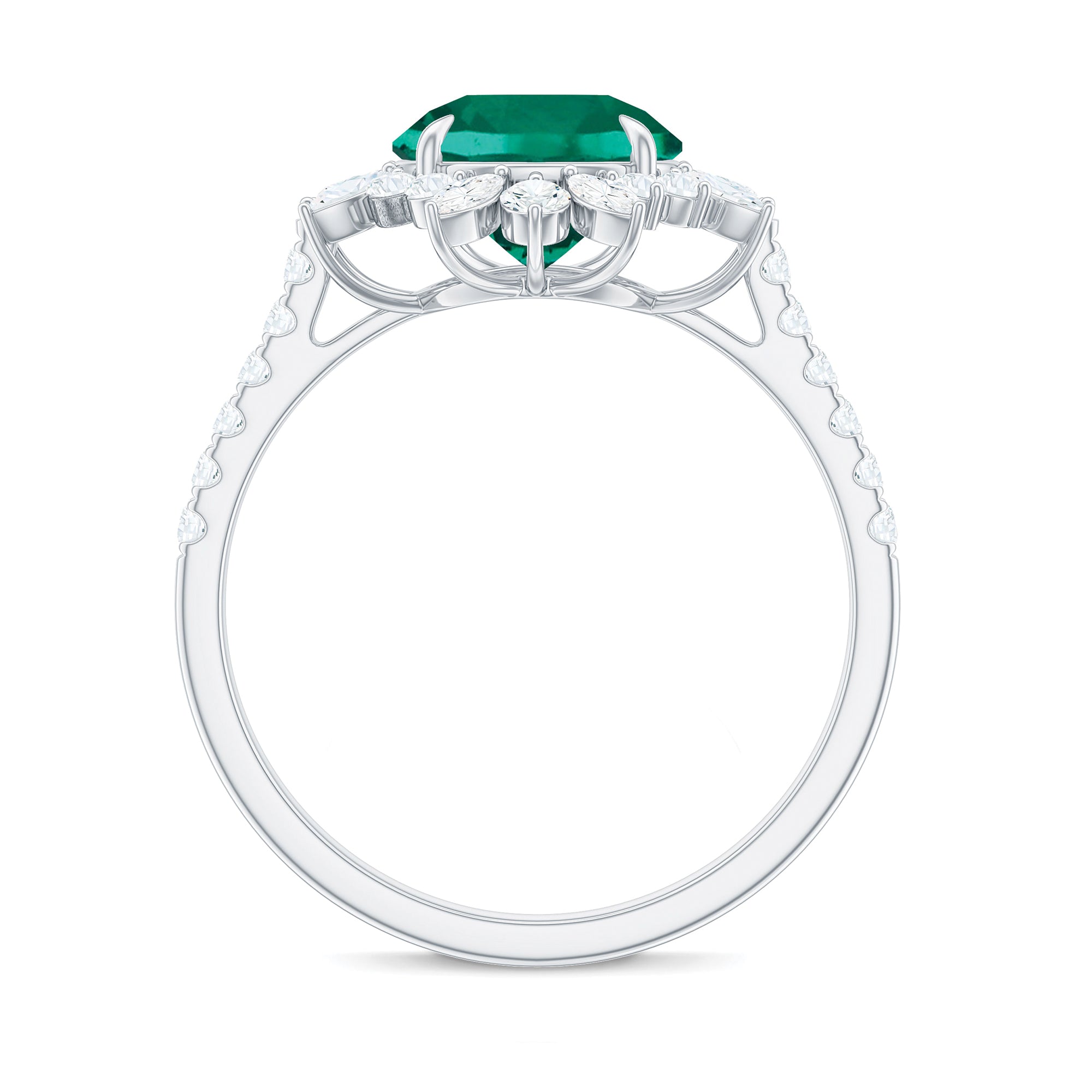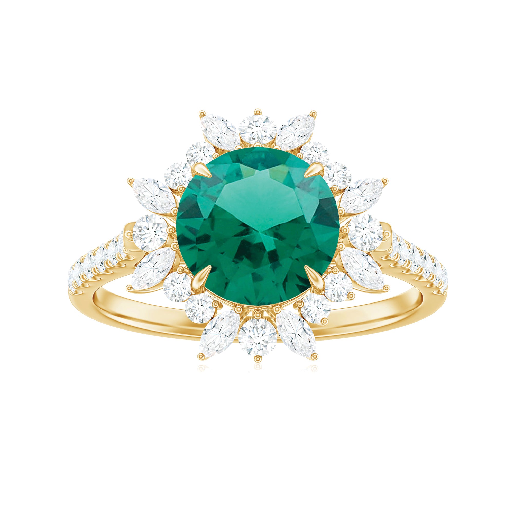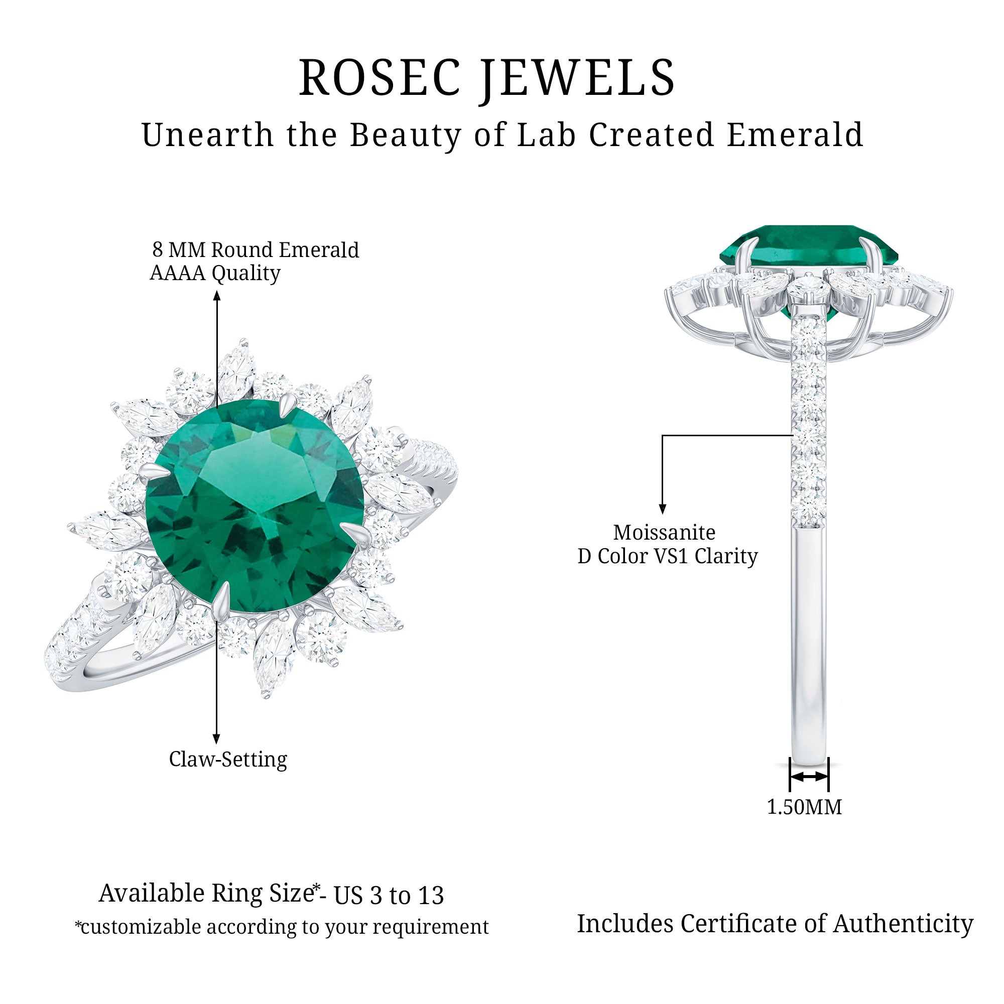 Dazzle with a burst of vibrant green and sparkling brilliance in this Lab Emerald Cocktail Ring, a showstopper designed to turn heads wherever you go. At the center of this Fine Ring is a beautifully rich 8 mm Round Shape Lab Grown Emerald, glowing with a deep green color that symbolizes growth and harmony. Surrounding it is a dazzling Halo of Round and Marquise Shape Moissanite stones, each one catching the light to create a mesmerizing sparkle that enhances the vibrant glow of Lab Emerald. The band is also delicately adorned with tiny Moissanite stones that add just the right touch of shimmer without overpowering the centerpiece. This thoughtful design makes this Lab Grown Emerald Ring perfect for a special night out or even as a unique engagement ring that breaks from tradition. To make the experience even more special, this Lab Emerald Engagement Ring with Halo arrives in a beautiful jewelry box, ready to gift or treasure for years to come. Whether you are celebrating a milestone, making a bold fashion statement or proposing with a ring that is as ethical as it is stunning, this Big Engagement Ring brings together beauty, sparkle and meaning in one unforgettable piece.