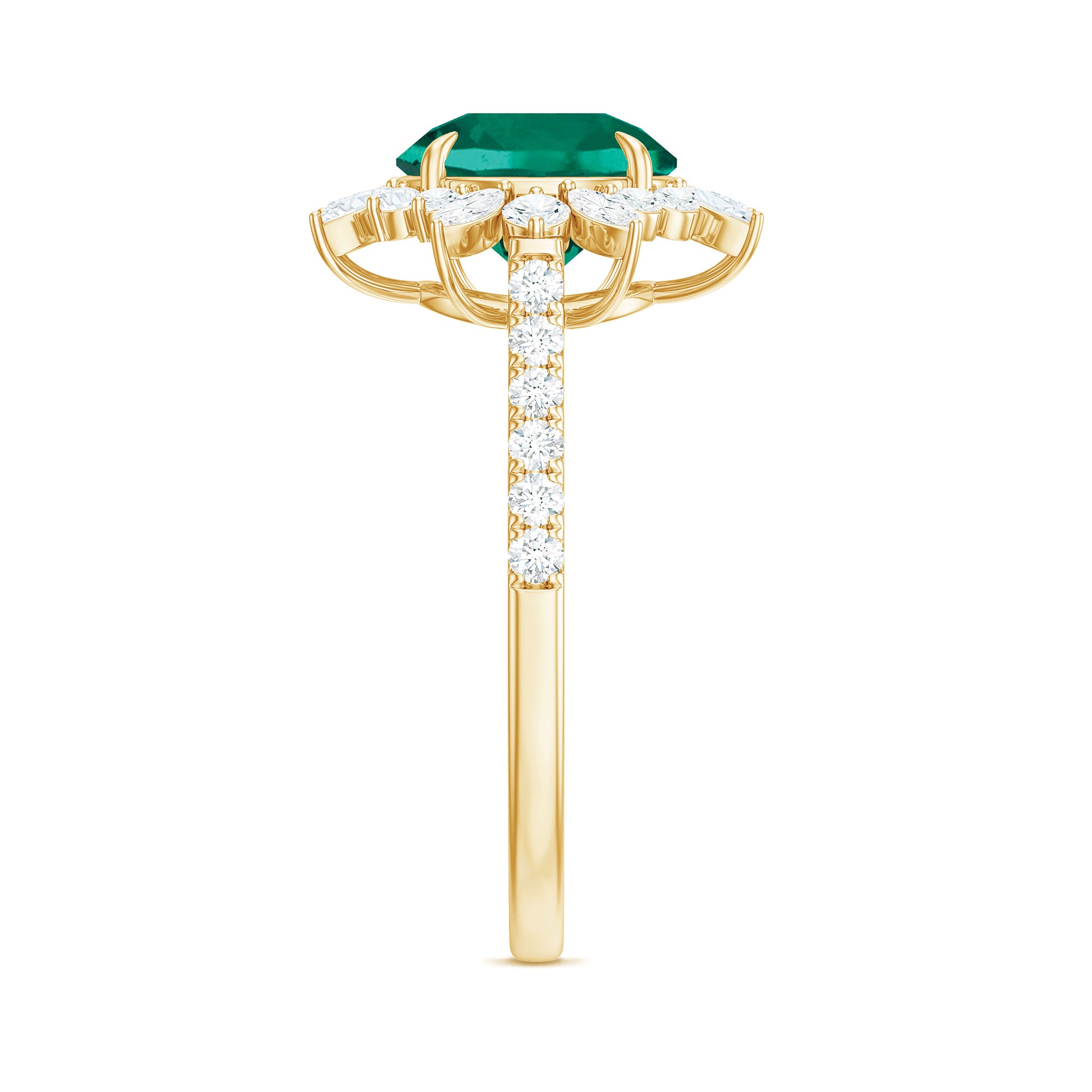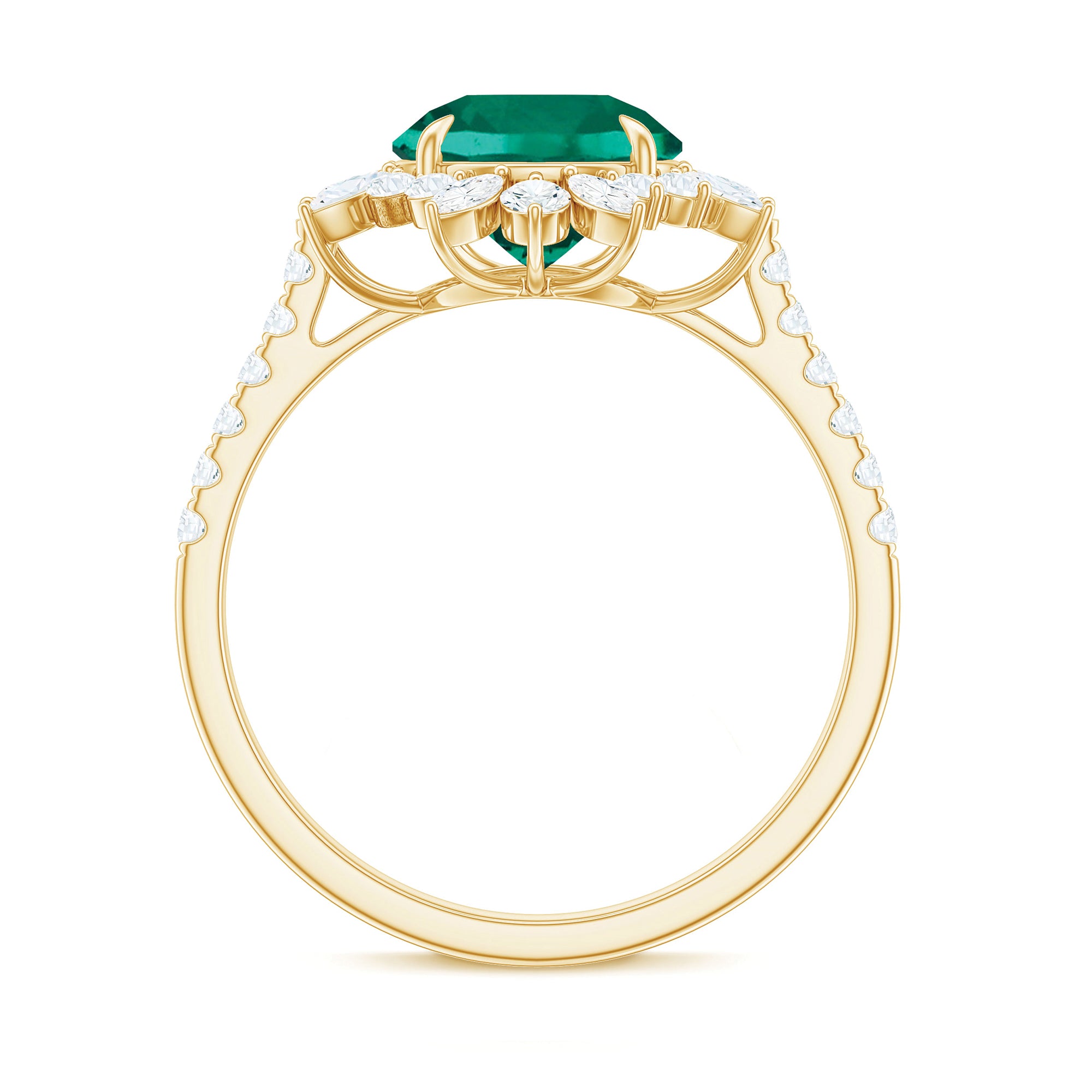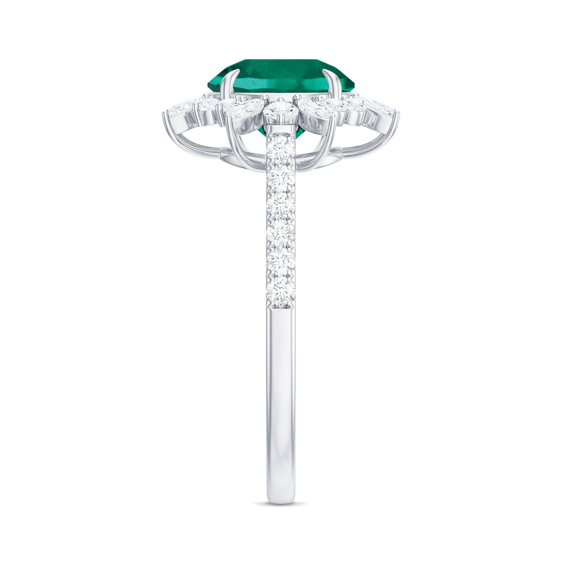 Dazzle with a burst of vibrant green and sparkling brilliance in this Lab Emerald Cocktail Ring, a showstopper designed to turn heads wherever you go. At the center of this Fine Ring is a beautifully rich 8 mm Round Shape Lab Grown Emerald, glowing with a deep green color that symbolizes growth and harmony. Surrounding it is a dazzling Halo of Round and Marquise Shape Moissanite stones, each one catching the light to create a mesmerizing sparkle that enhances the vibrant glow of Lab Emerald. The band is also delicately adorned with tiny Moissanite stones that add just the right touch of shimmer without overpowering the centerpiece. This thoughtful design makes this Lab Grown Emerald Ring perfect for a special night out or even as a unique engagement ring that breaks from tradition. To make the experience even more special, this Lab Emerald Engagement Ring with Halo arrives in a beautiful jewelry box, ready to gift or treasure for years to come. Whether you are celebrating a milestone, making a bold fashion statement or proposing with a ring that is as ethical as it is stunning, this Big Engagement Ring brings together beauty, sparkle and meaning in one unforgettable piece.