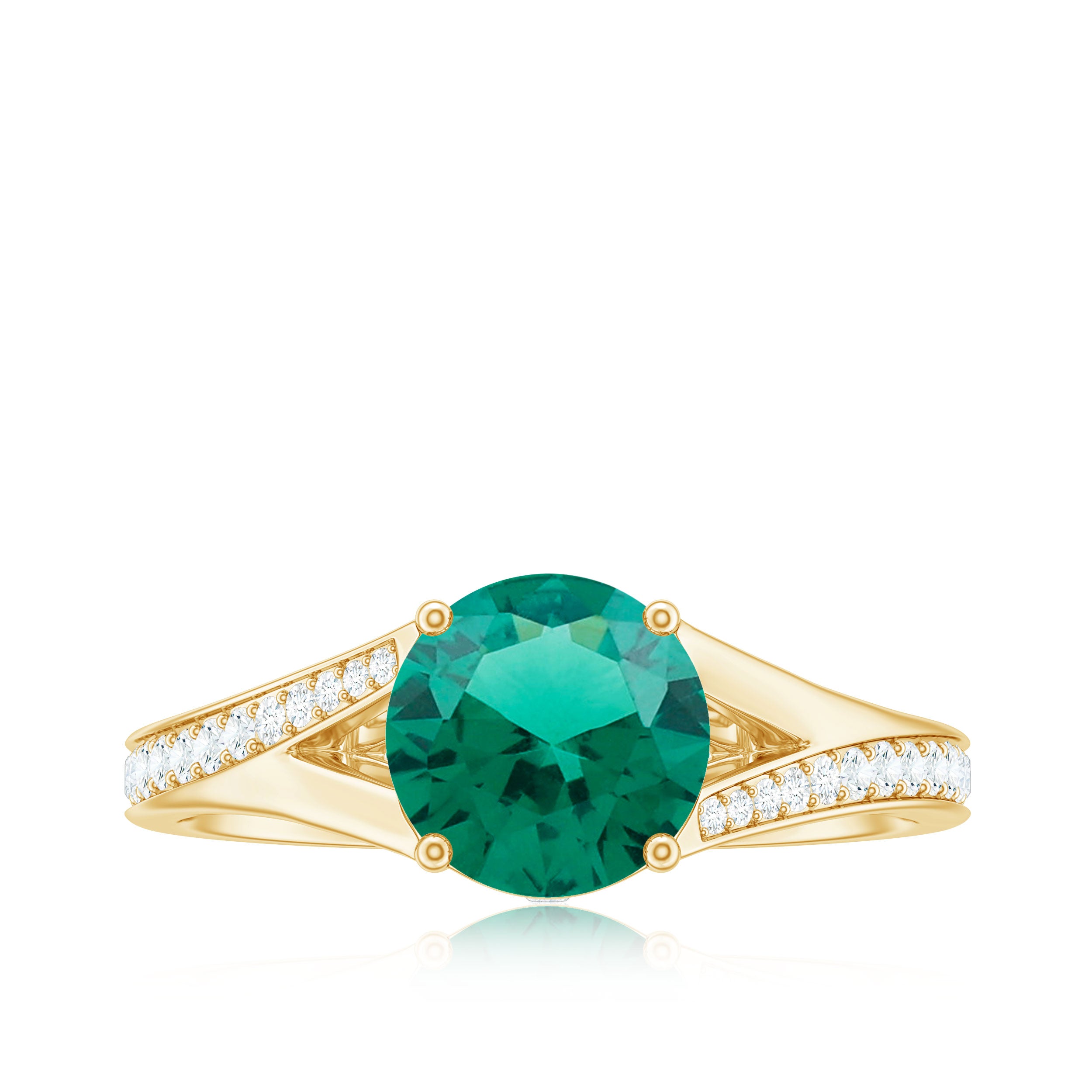 Commemorate your unique love story with this Split Shank Engagement Ring. A beautiful 8 mm Round Shape Lab Created Emerald of AAAA Quality shines at the center, offering a rich green color. What makes this Solitaire Engagement Ring extra special is its Split Shank design, where the band gently splits into two as it reaches the center stone. This design represents two lives coming together, intertwining while remaining individual, just like your journey as a couple. The band is further enhanced with sparkling HI-SI Diamond stones, adding extra brilliance and making the whole ring shimmer from every angle. Handcrafted with care, this Lab Emerald Engagement Ring balances classic beauty with a modern touch, perfect for someone who appreciates simple elegance with deep meaning. Available in different US ring sizes, this Split Shank Engagement Ring ensures the perfect fit for your loved one. Presented in an elegant Jewelry Box, this Lab Emerald Diamond Engagement Ring is ready to symbolize your promise of forever in the most beautiful way.