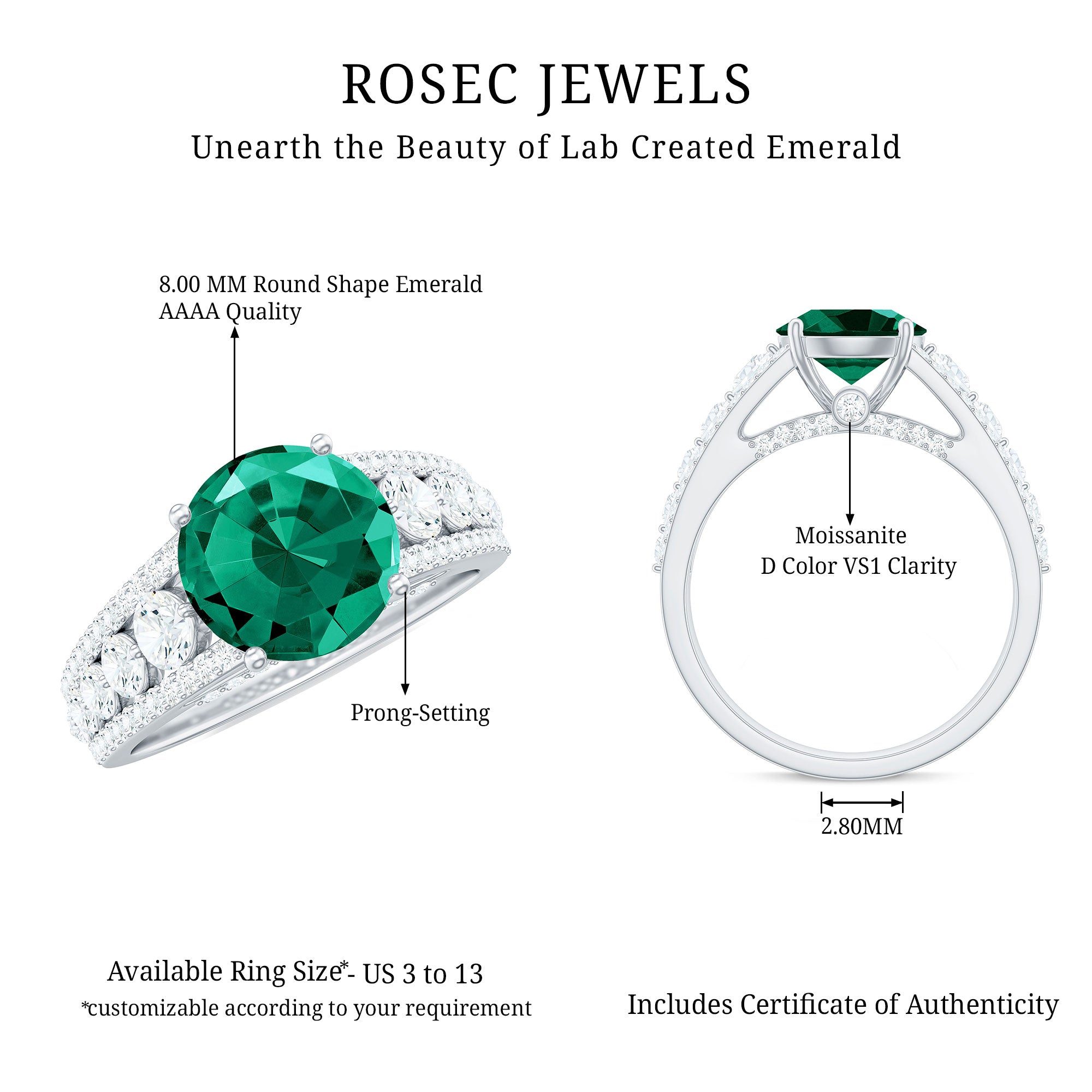 Step into the spotlight with this stunning Solitaire Engagement Ring designed to make a statement. The vibrant 8 mm Lab Created Emerald at the center glows with rich green color, symbolizing love, growth and new beginnings. It is big enough to catch every eye but elegant enough to wear every day. Flanking the center stone are dazzling Moissanite side stones, adding extra sparkle and fire that beautifully complement the deep hue of the Lab Emerald. Together, they create a look that is bold, modern and totally unforgettable. Crafted for those who love to stand out, this Lab Grown Emerald Ring combines eco-friendly lab grown stones with expert design, making it a choice that is as conscious as it is gorgeous. Plus, this Side Stone Engagement Ring comes in a variety of ring sizes to perfectly fit your finger, because every love story deserves the perfect fit. Presented in a signature jewelry box, this 2 Ct Emerald Ring (Lab Grown) is ready to shine at your proposal, anniversary or special moment. If you want a ring that is full of life, sparkle and personality, this beauty is made for you.