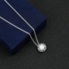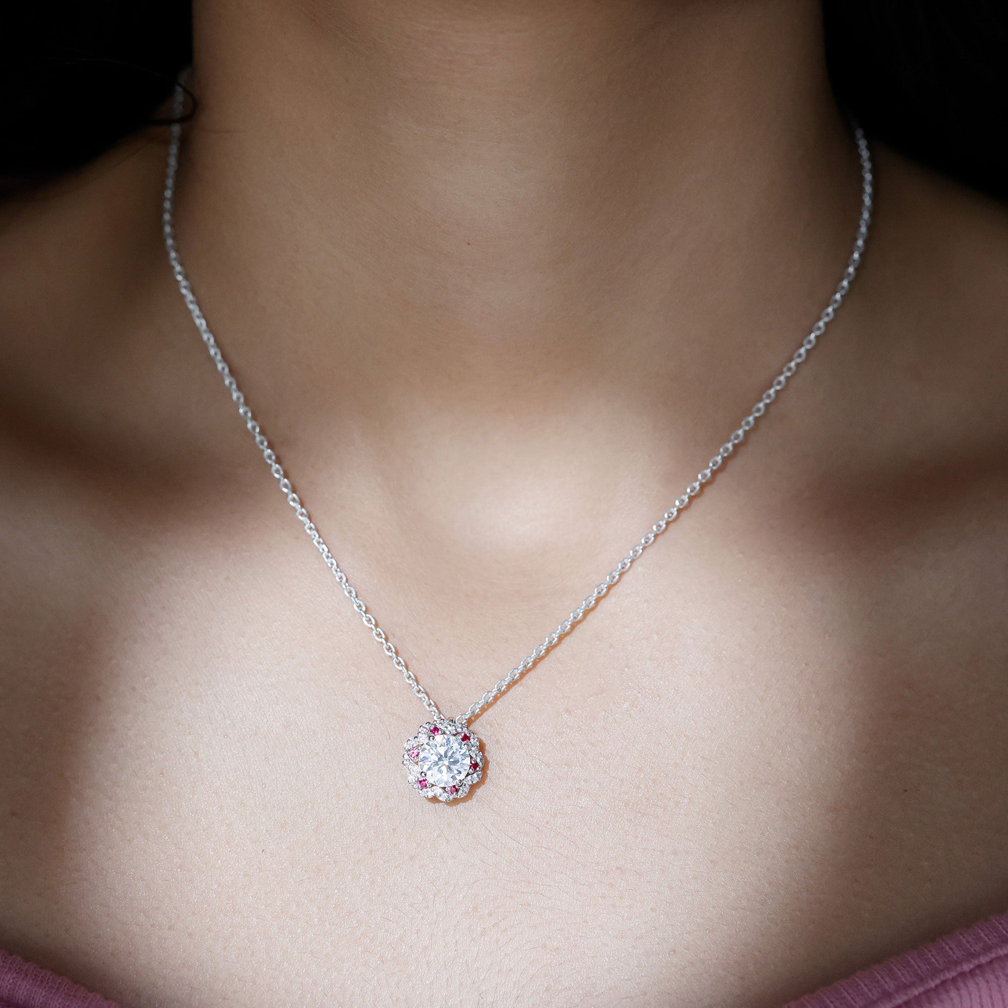 Add this Moissanite Pendant Necklace to your jewelry collection. This pendant is precisely crafted with 14K White Gold Plated Silver, featuring an 8 MM Round Shape Moissanite secured in Prong Settings and adorned with smaller Moissanites and Rubies. The Round Shaped Pendant is accentuated with a hidden bail and dangles in a sturdy cable chain, which makes it beautifully sit on the neckline. The D-VS1 Quality Moissanite makes the pendant perfect to complete the overall look for the special day. This Statement Pendant Necklace will be shipped to you in a signature velvet pouch to keep it safe and dust-free.