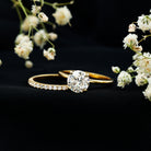 Start a beautiful new chapter with this breathtaking Moissanite Wedding Ring Set. Designed to make a lasting impression, this handcrafted set features a high set engagement ring showcasing a brilliant 8 MM round moissanite, securely set in peg head setting. Paired with a sleek, moissanite accented shadow band that sits perfectly against the engagement ring, this Stacking Ring Set offers a modern yet timeless look she will never stop admiring. The dazzling moissanite centerpiece delivers intense sparkle, making it a captivating symbol of your love and commitment. Whether you are planning the perfect proposal or simply treating yourself to something special, this Engagement and Wedding Ring Set speaks volumes with its elegant design and thoughtful details. Handcrafted in 14k yellow gold plated silver, this piece combines fine craftsmanship with accessible luxury, giving you a meaningful piece that is both stunning and durable. Presented in a signature jewelry box and available in a range of sizes, this Moissanite Engagement Ring Set is made to celebrate every love story. Whether it is a once-in-a-lifetime proposal or a personal milestone, this ring set is designed to shine, just like the person wearing it.