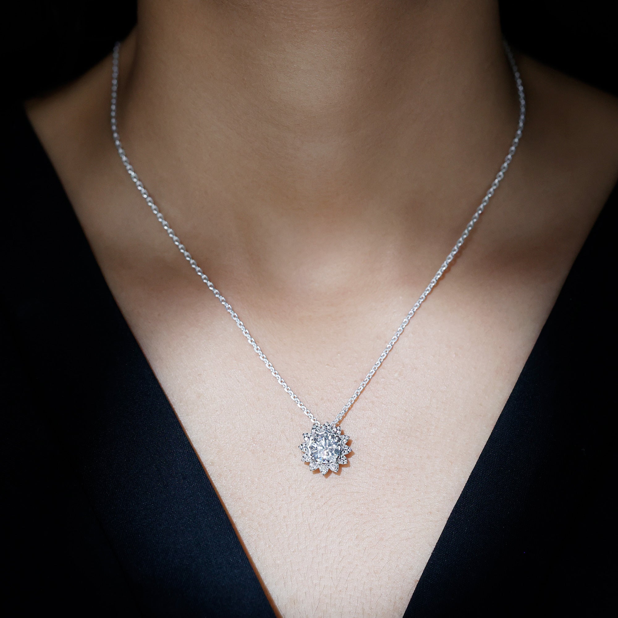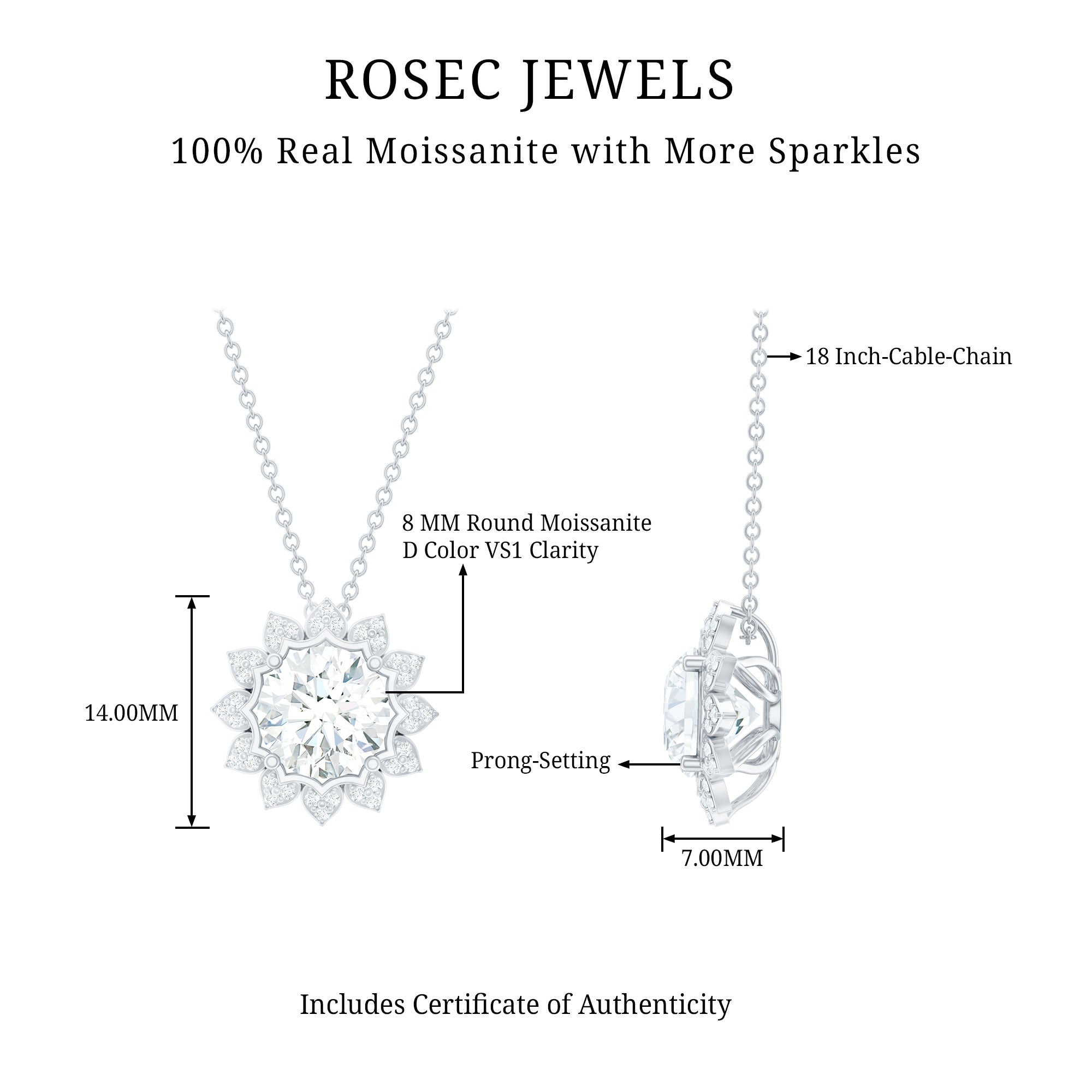 Crafted with the inspiration of nature, this Moissanite Pendant Necklace will adorn your neckline. This Floral Pendant features an 8 MM Round Shape Moissanite of D-VS1 Quality securely placed in Prong Setting. The center stone is adorned with smaller Moissanites, which makes a petal-like structure that gives a floral appearance to the pendant. This Flower Pendant Necklace is a perfect gift option for those who love nature. This Halo Pendant dangles in a sturdy cable chain, which makes it beautifully sit on the neckline and adorn your appearance for the special day. A perfect Ready to Gift Jewelry for Women packed in Premium Quality Velvet Pouch.