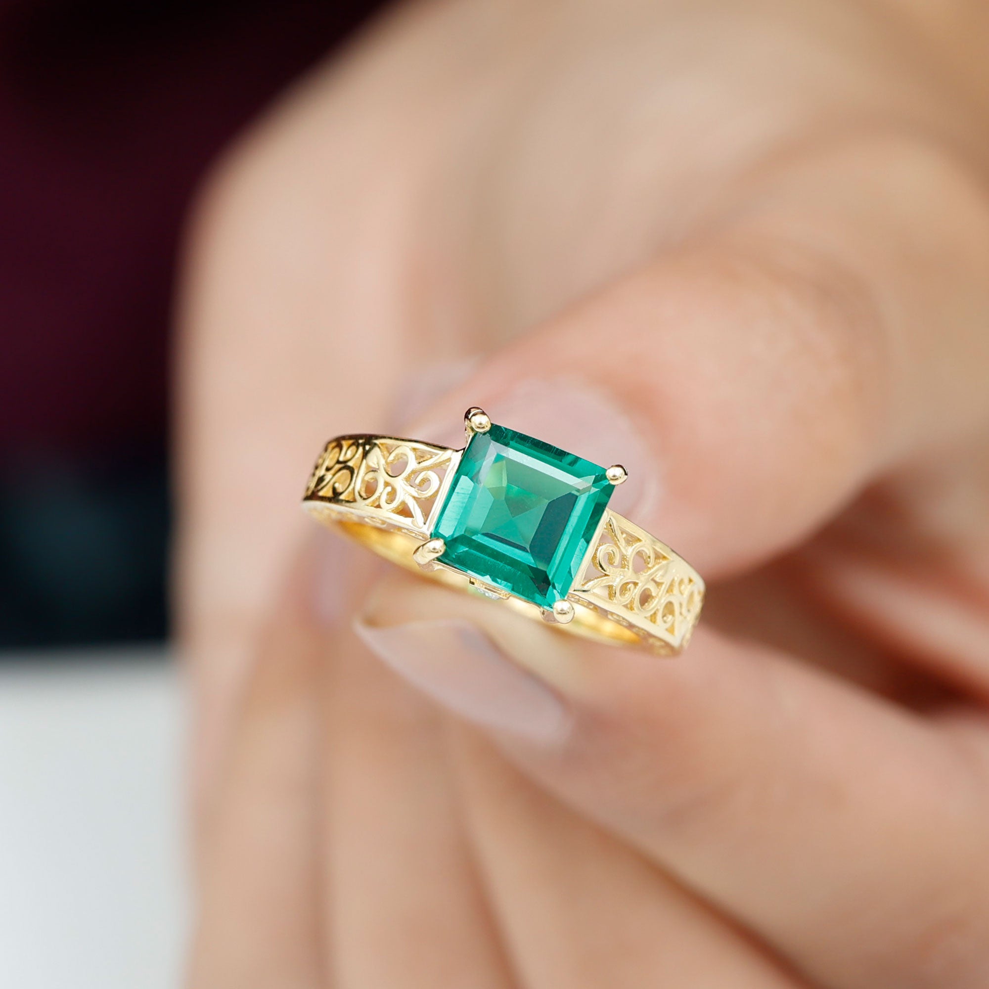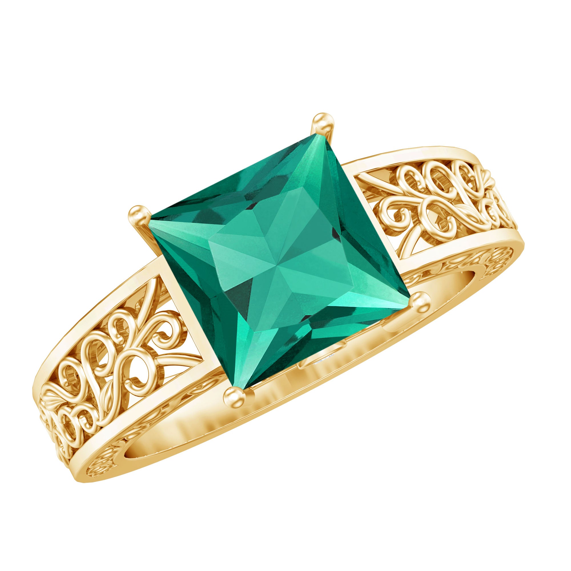 Certified 8 mm Princess Cut Lab Grown Emerald Filigree Engagement Ring