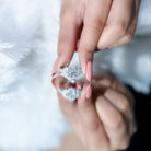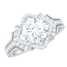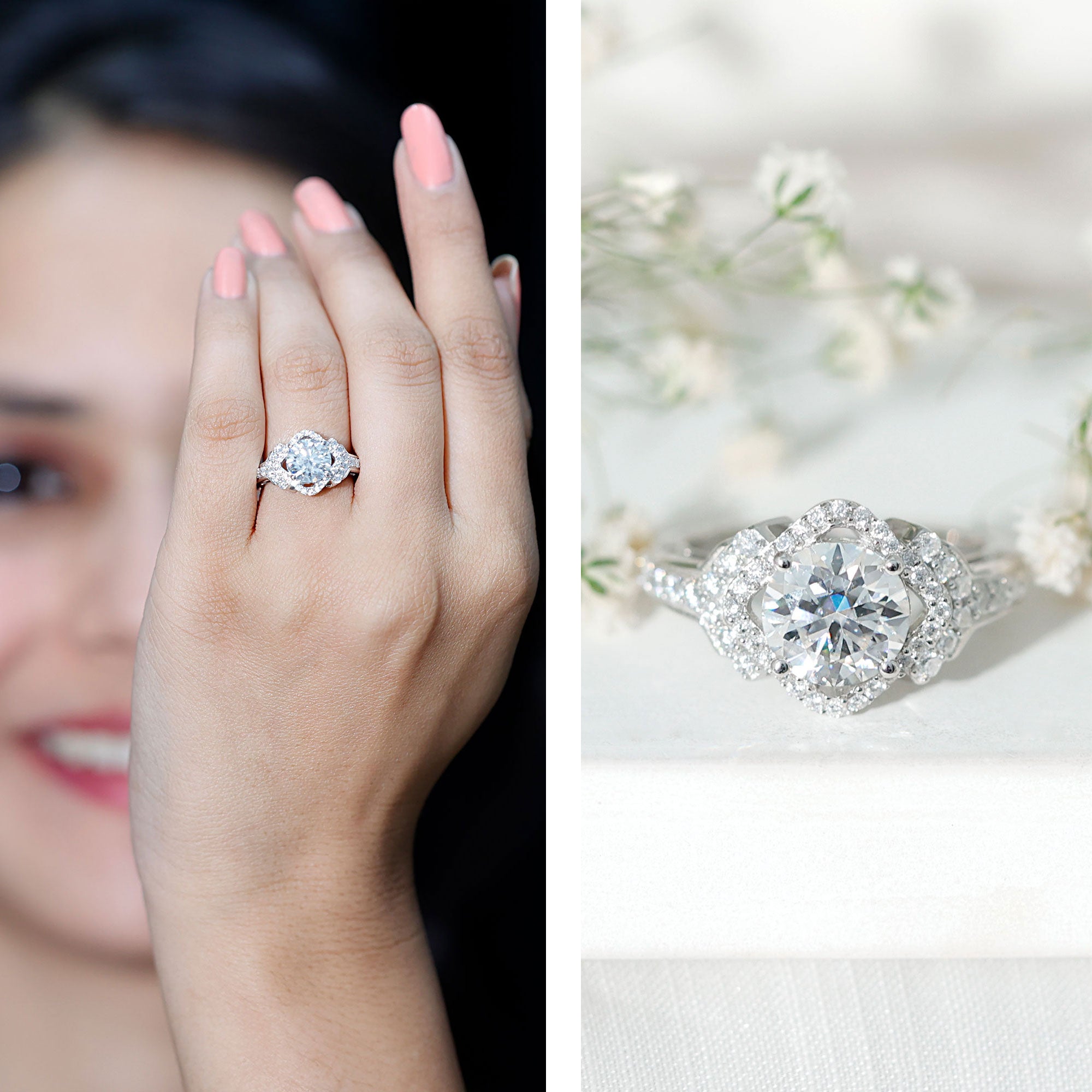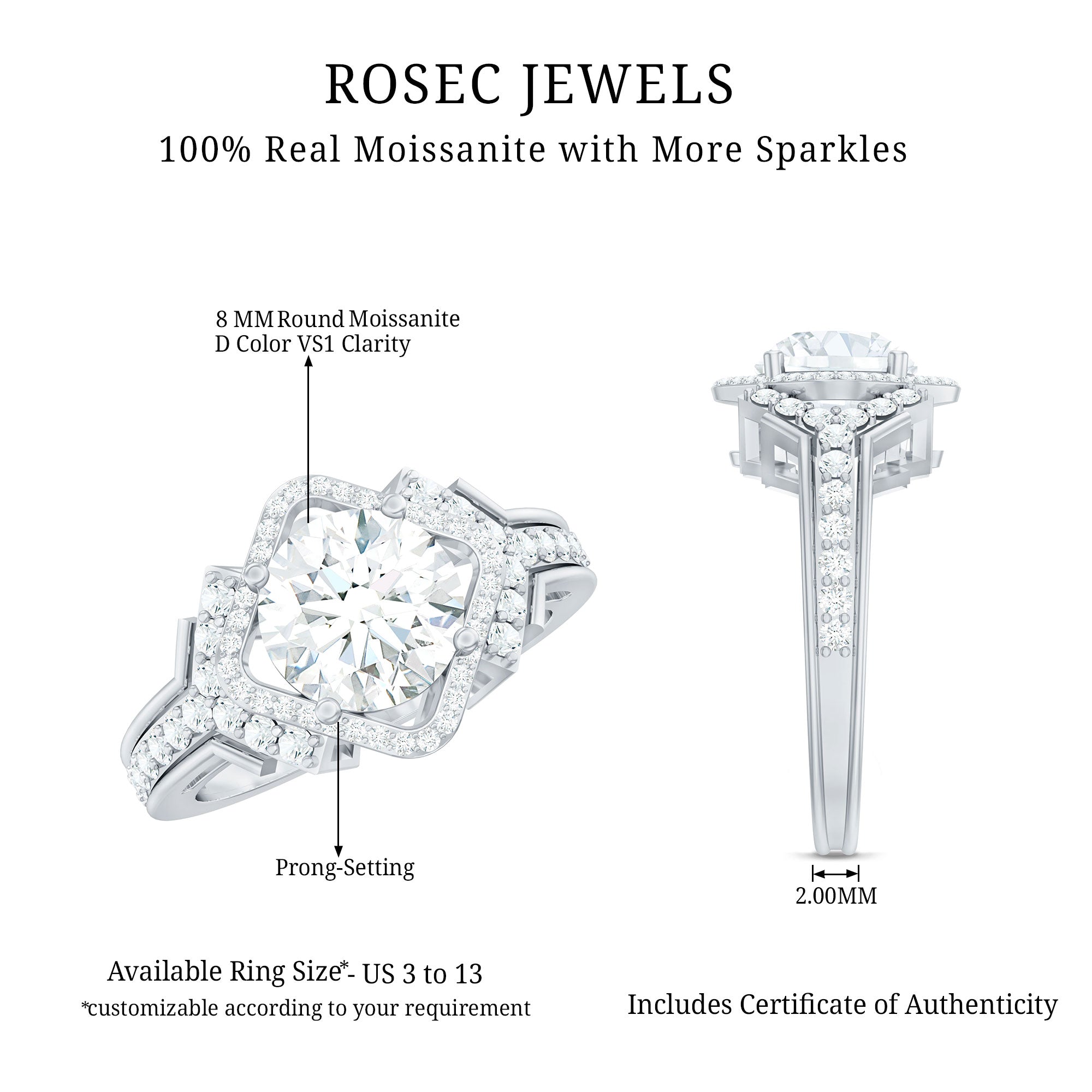 Present this Moissanite Engagement Ring to her and capture a priceless reaction from her. This ring is crafted with 14K White Gold Plated Silver, featuring an 8 MM Round Shape Moissanite adorned with smaller Moissanites as halo, and also decorated on the shank. This 2 Carat Engagement Ring beholds the classic shine of D-VS1 Quality Moissanite securely placed in Prong Setting. Also, the ring represents a strong and unbreakable bond which makes it the perfect choice for your lady to express your love. This Vintage Ring will perfectly suit the vibe of the occasion and will be delivered to you in a premium quality velvet pouch to store when not in use.