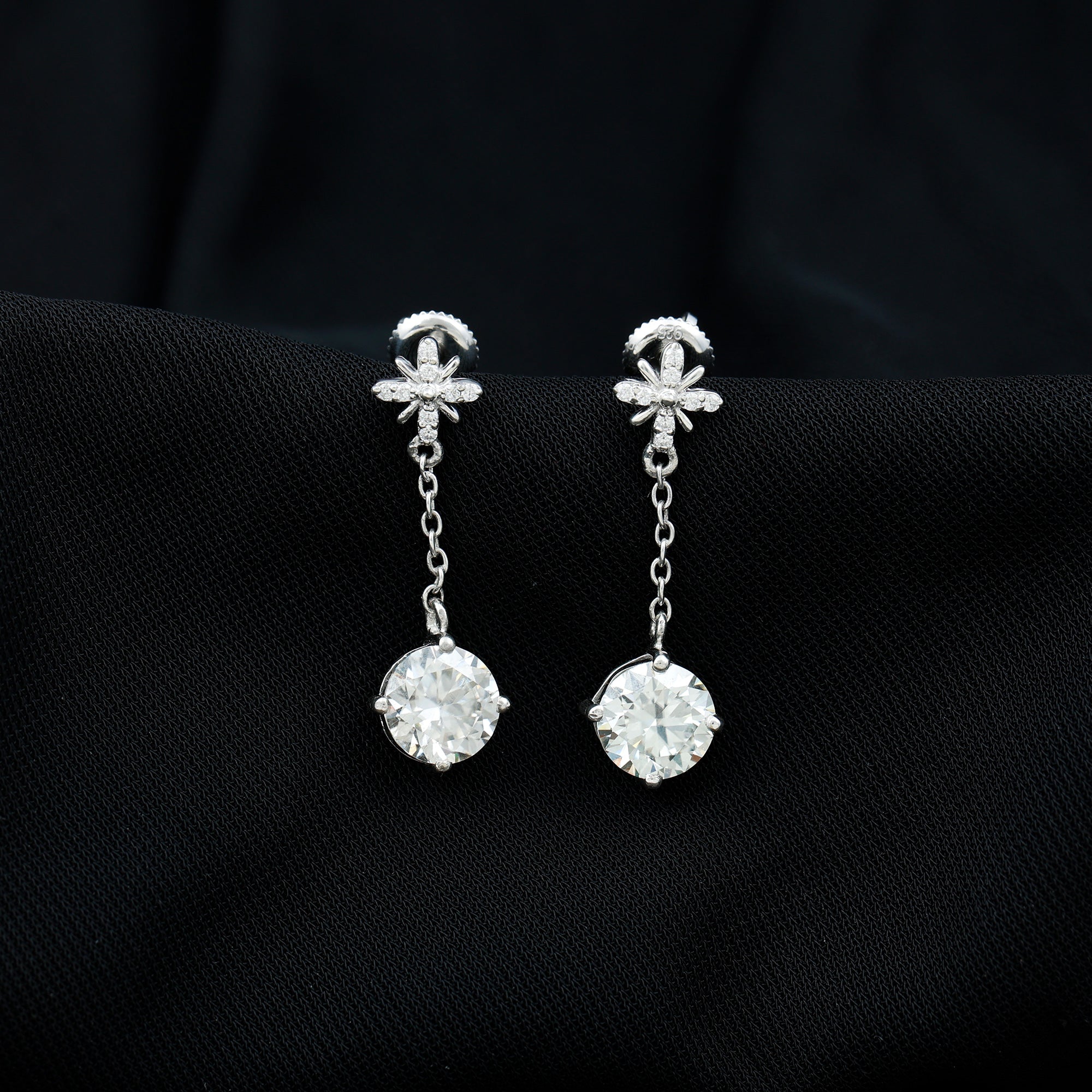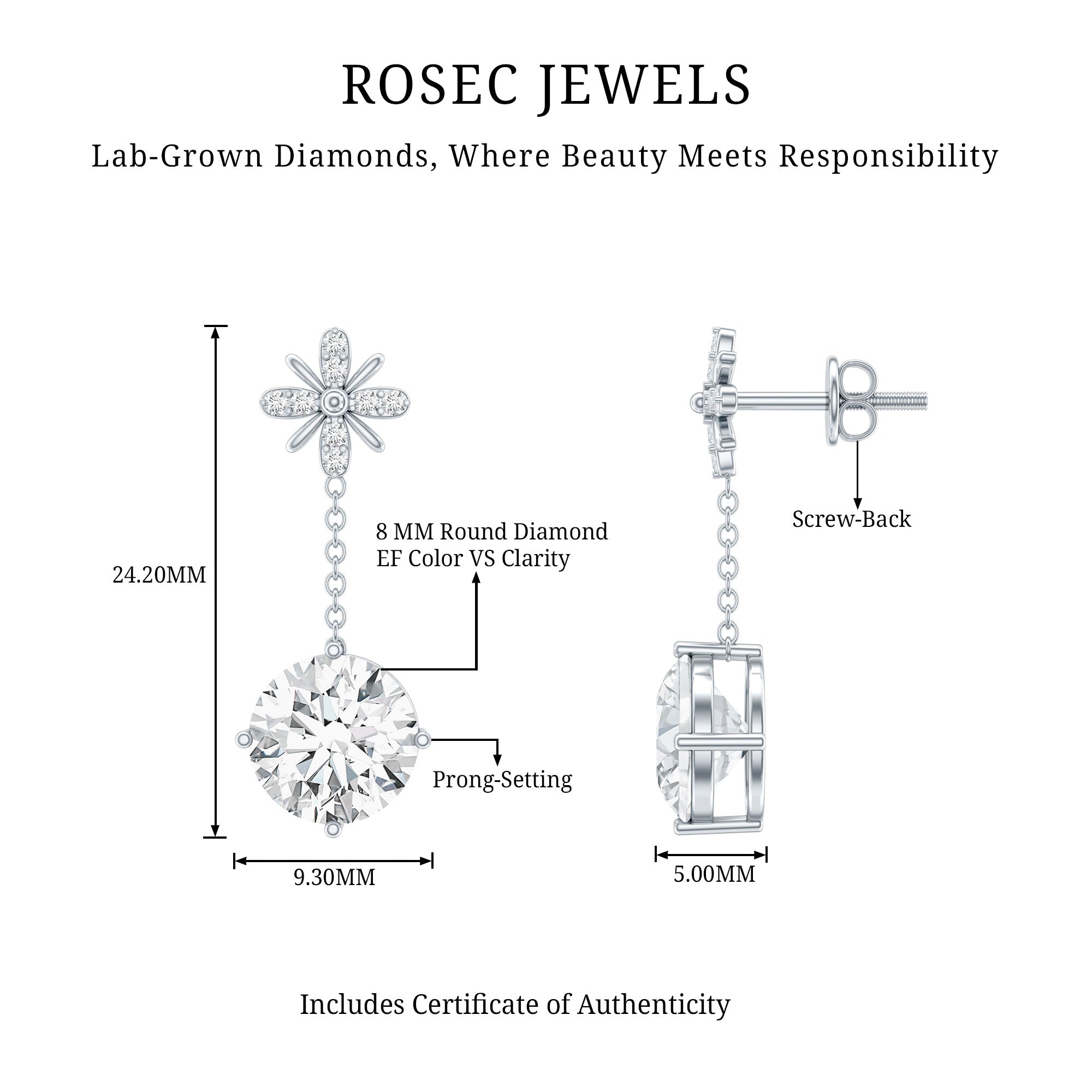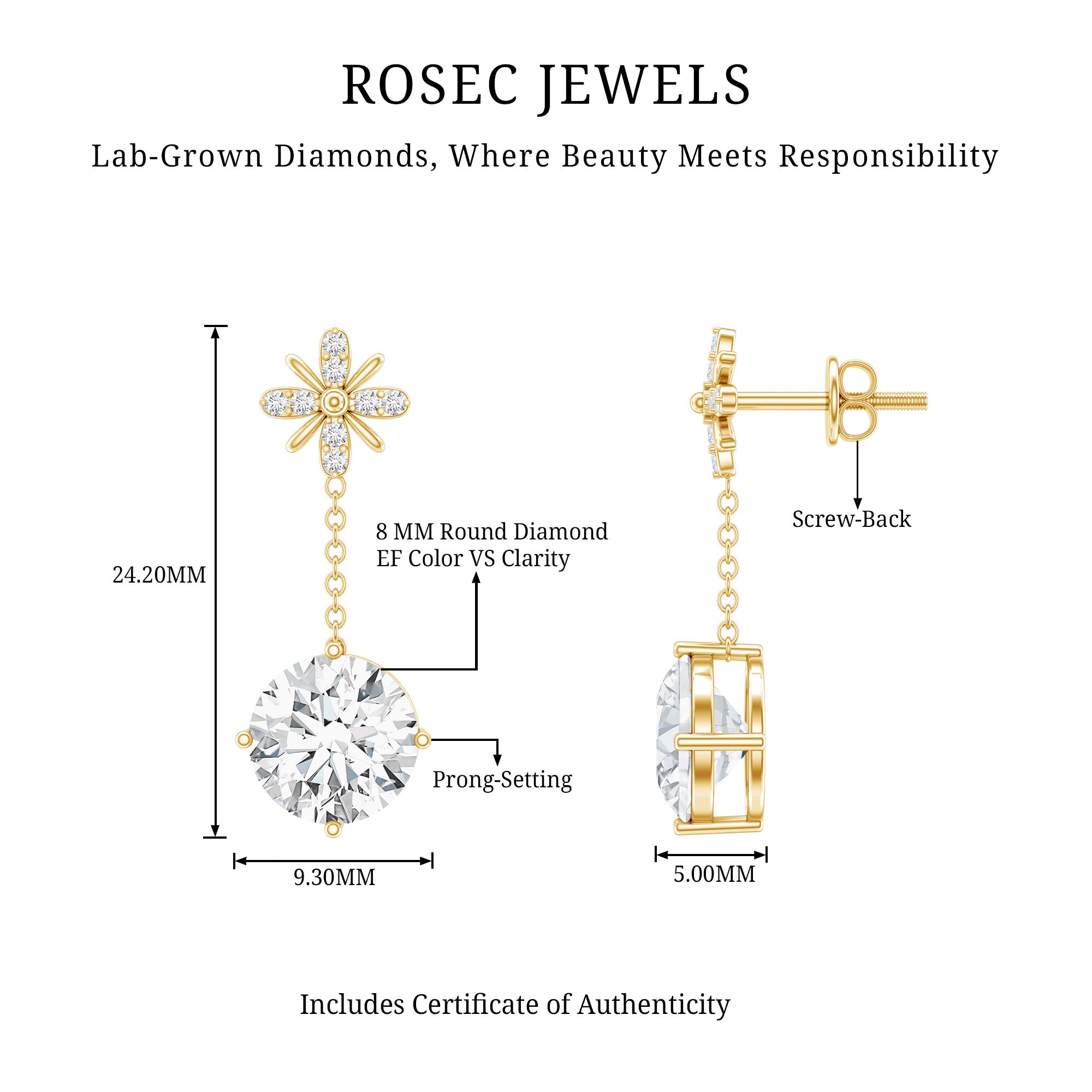 Make a fashion statement with these Chain Diamond Earrings, handcrafted in top-notch metal. The design showcases a diamond-encrusted flower motif at the top, elegantly connected to a round cut diamond (lab made) through a cable chain, creating a graceful dangle effect that adds charm and sparkle to every movement. The prong setting securely holds each 8 MM round diamond (EF-VS Quality), while the screw-back closure of these Dangle Earrings ensures a comfortable fit throughout the day. They can be present as an alternative April Birthstone Earrings and are available in a wide range of metal choices, allowing you to select the perfect material to match your style and make it truly unique.